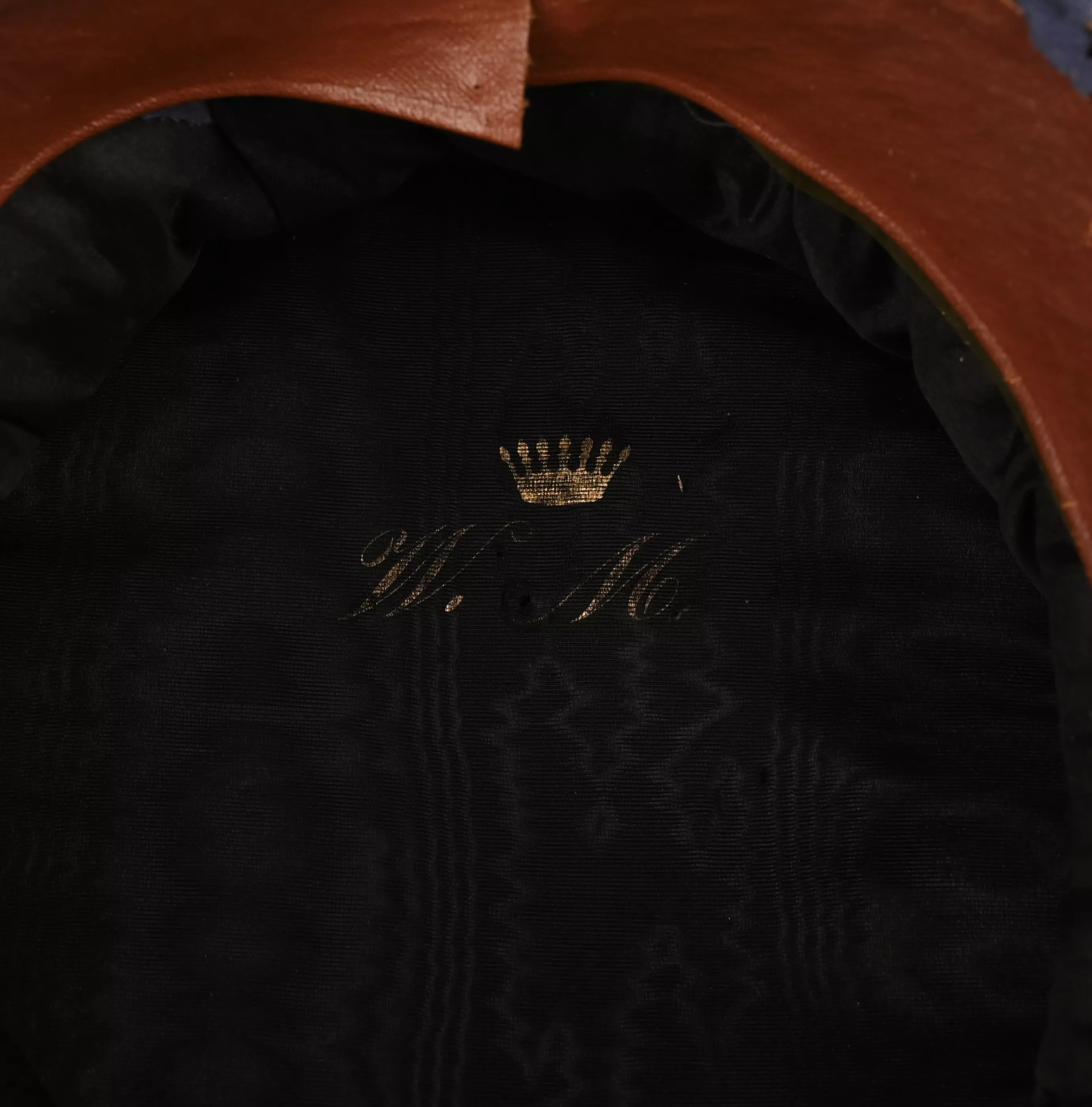 Inside Lining with the brown simi-leather sweat band marked from the famous Munich Makers "Christian Schwarz", who was the provider of most of the Royal families Uniforms and accoutrements. Sweat band has unfortunately been repaired in some places (mainly towards the back) and "stupidely" stapeled twice in the rear (see pics). We did not try to remove any and will leave this to the futur owner, but we believe it can be easily made better by a Pro. Black silk lining in excellent original condition.