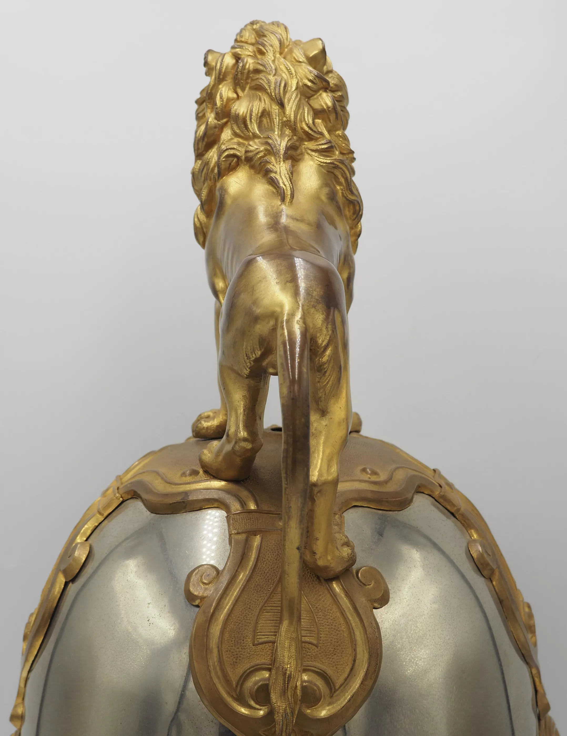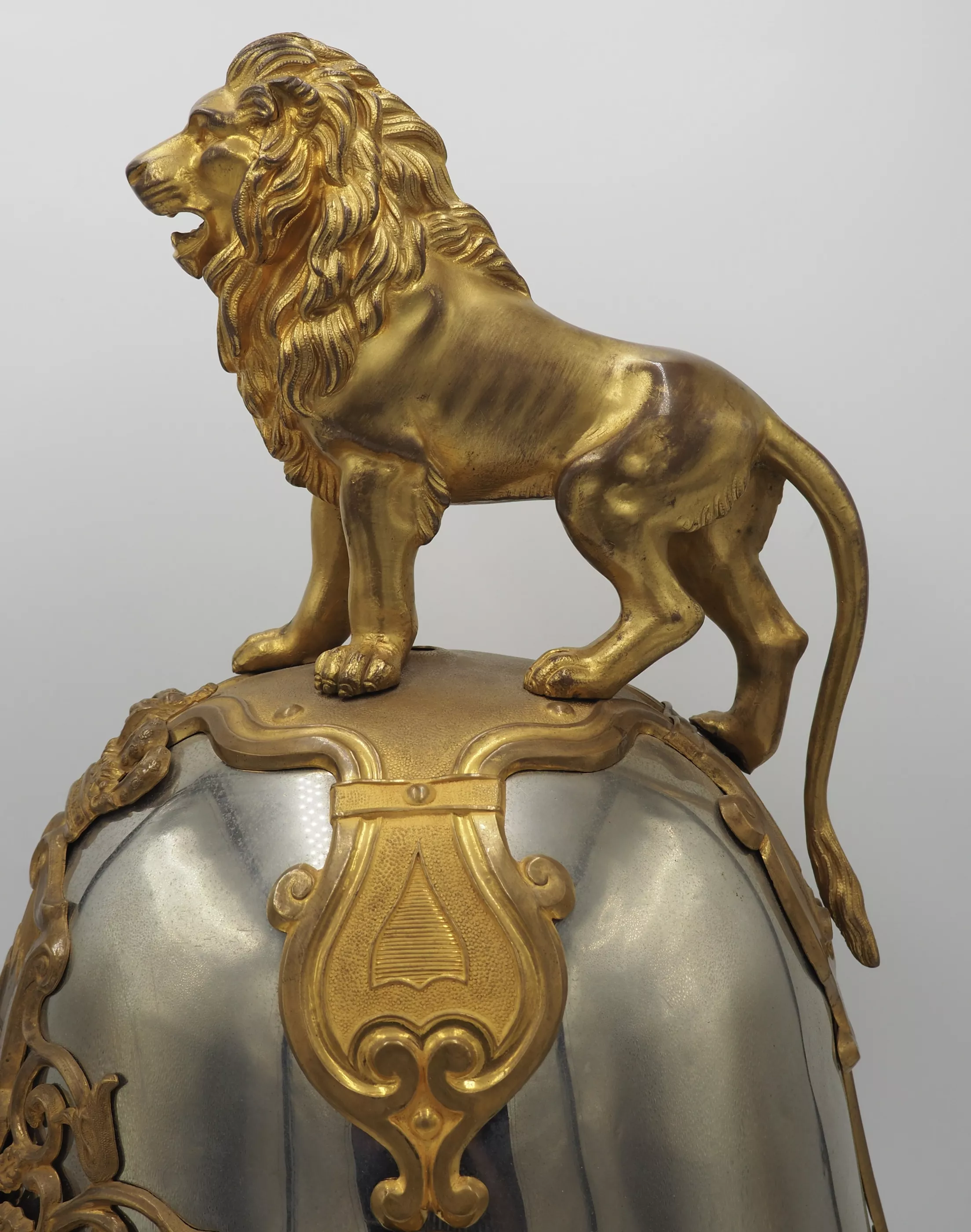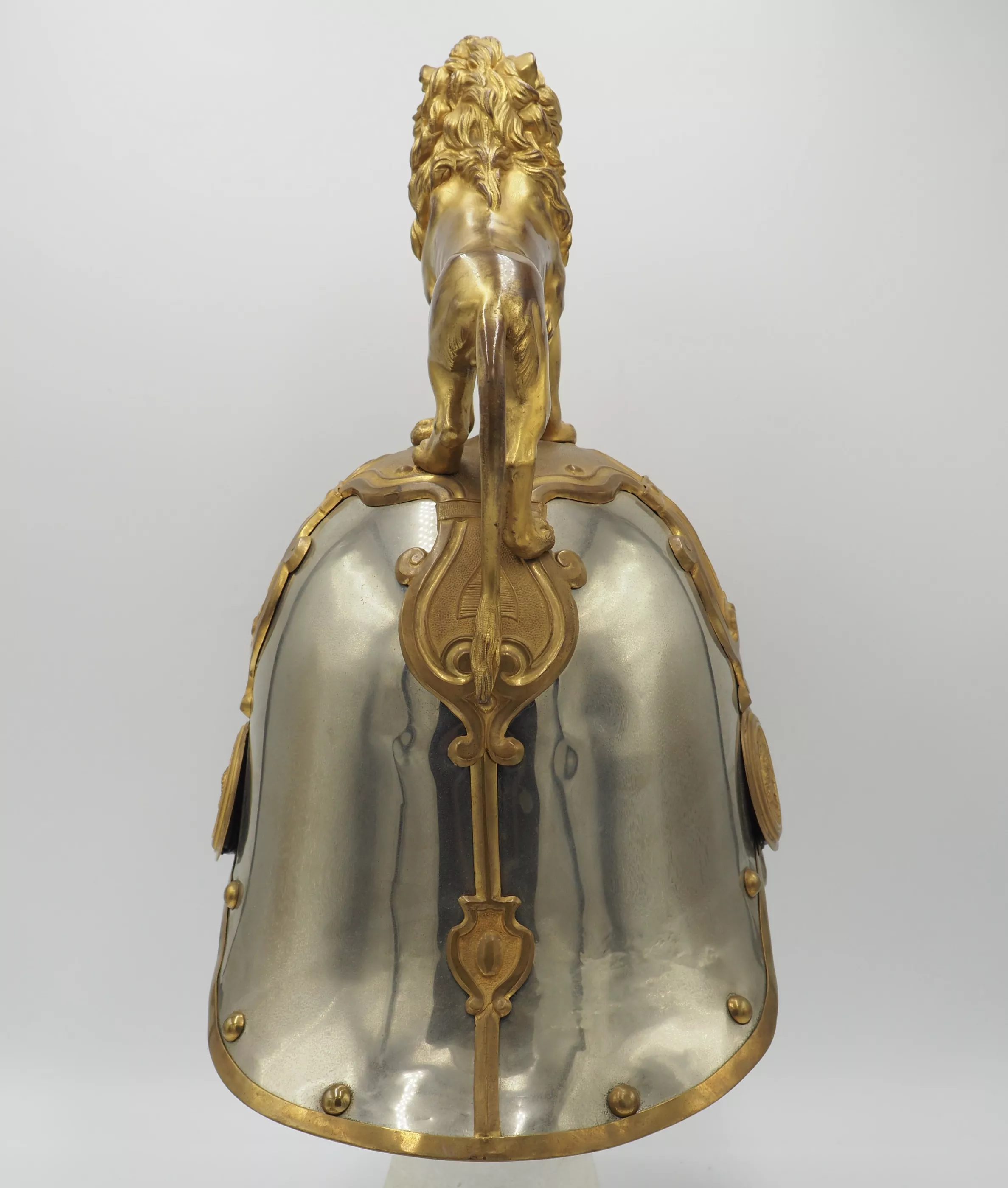 Bavarian Hartschiere Officer helmet Model 1852 with Parade Lion. Original and untouched helmet from a noted US collection. Nickeled metal helmet body with attached visors. The front visor with painted green underlay (only traces left on this helmet) and the rear visor with painted black underlay. Gilded cross base, lion, rivets and trim. Gilded officer front plate of Bavarian shield and crown attached by three screw posts. Gilded ornate interwoven chin scales with large Bavarian crown rosette side posts. The gilded Parade Lion is separately attached to the helmet with screws. Complete with original fancy leather liner with velvet inner trim. The helmet is all original and has never been cleaned or polished. The condition is excellent with fine gilding intact. Extremely rare helmet.