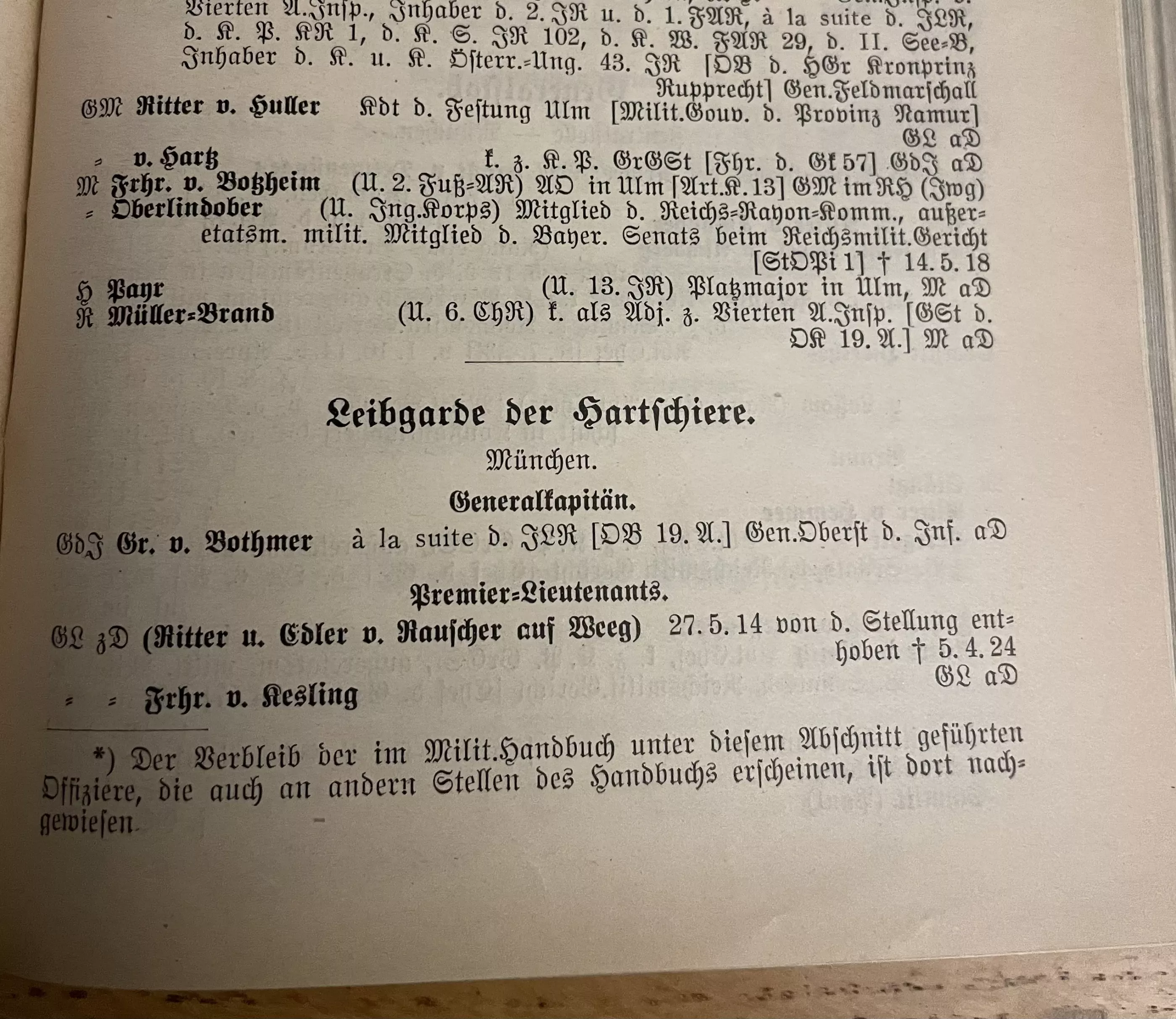 **Note that the pictures associated with this posting are NOT part of the sale. The first picture shows a Hartschier (Eduard Bash) in "Waffenrock" , the two later picture where taken in 1929 with the GeneralKapitän Felix Graf von Bothmer (1852-1937) in presence of Prinz Alfons of Bavaria..... Yes, they still wore these helmets then! Two more copies of the Ranglisten with the names of the officers.