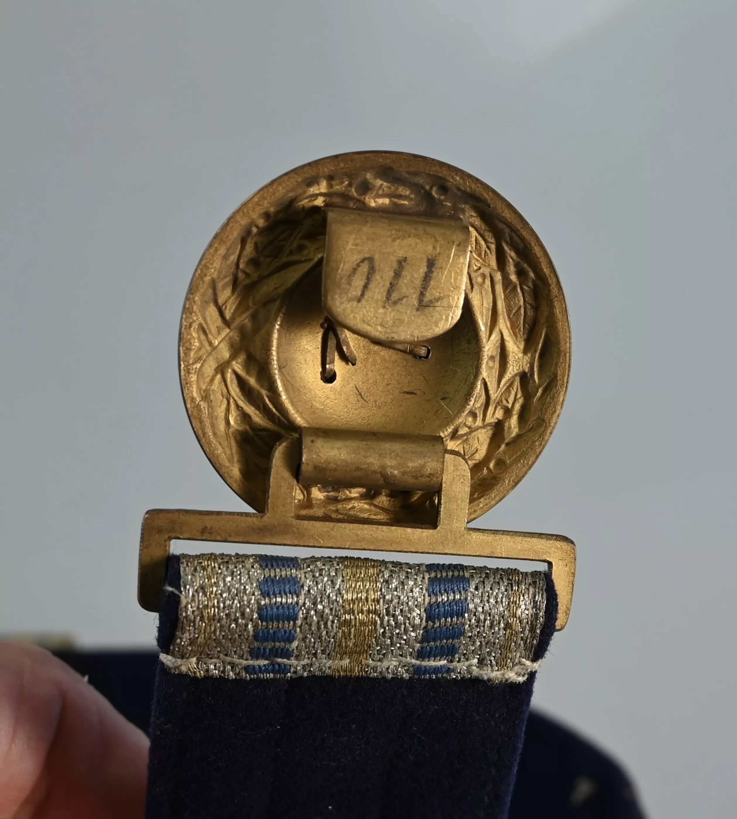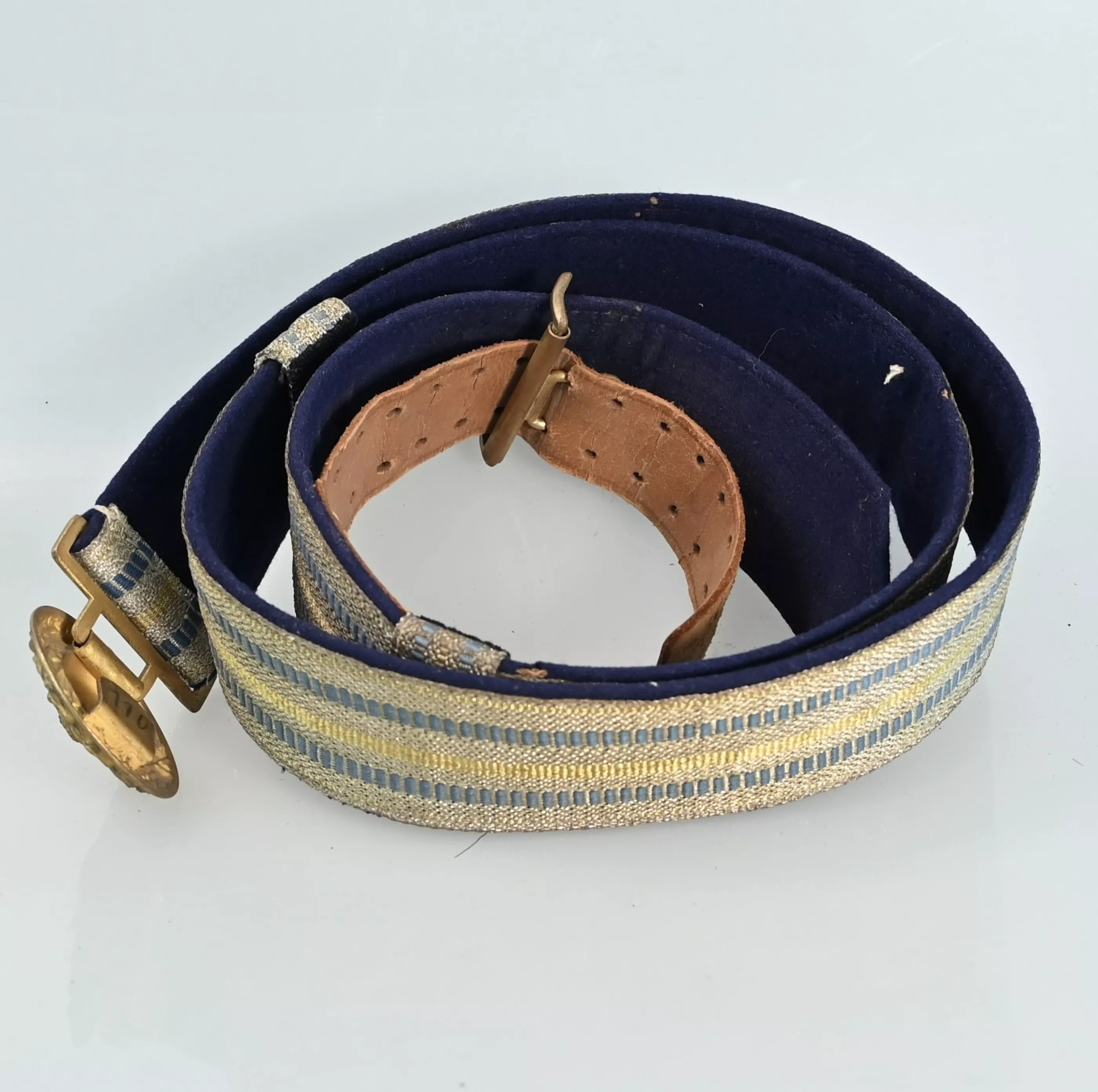 Beautiful Officers Officers full dress Belt. Complete with Silver Bullion front (Blue and yellow bands). The back is lined with blue velvet. The Buckle in fire gilt with the Bavarian Crown in the center. Both "Passanten" and hooks are present. Near mint to mint condition. 100% Original and rare to find in pristine condition.