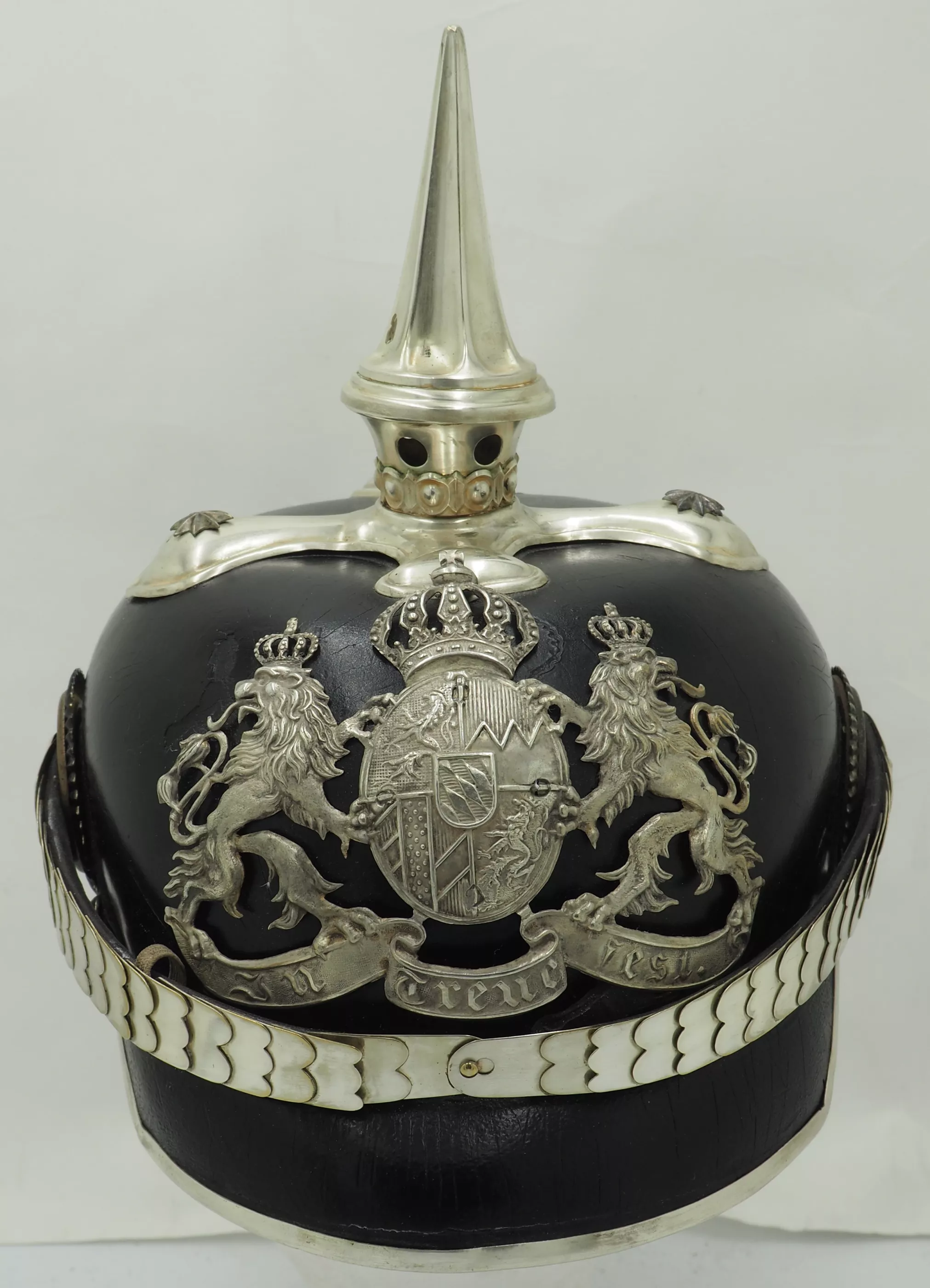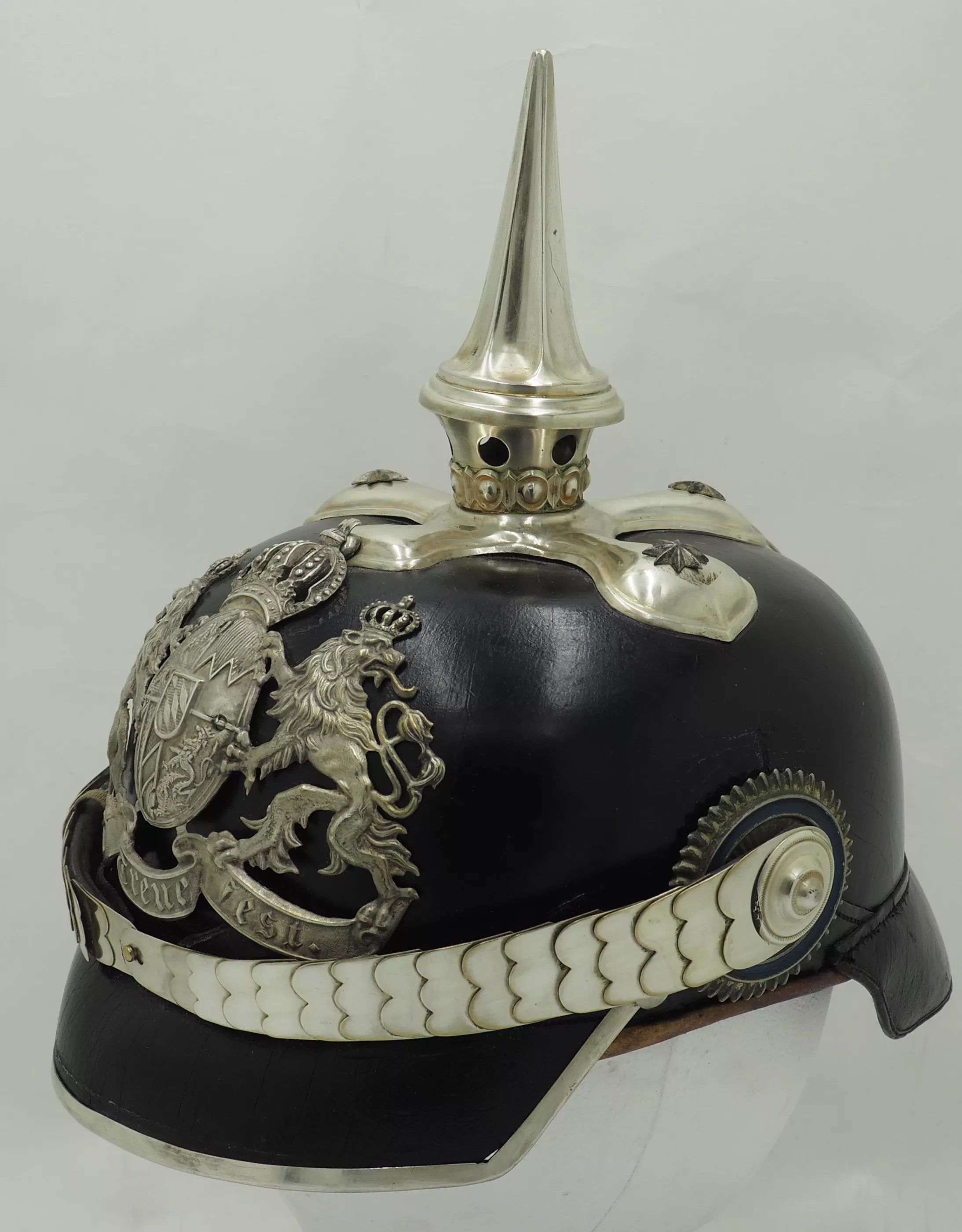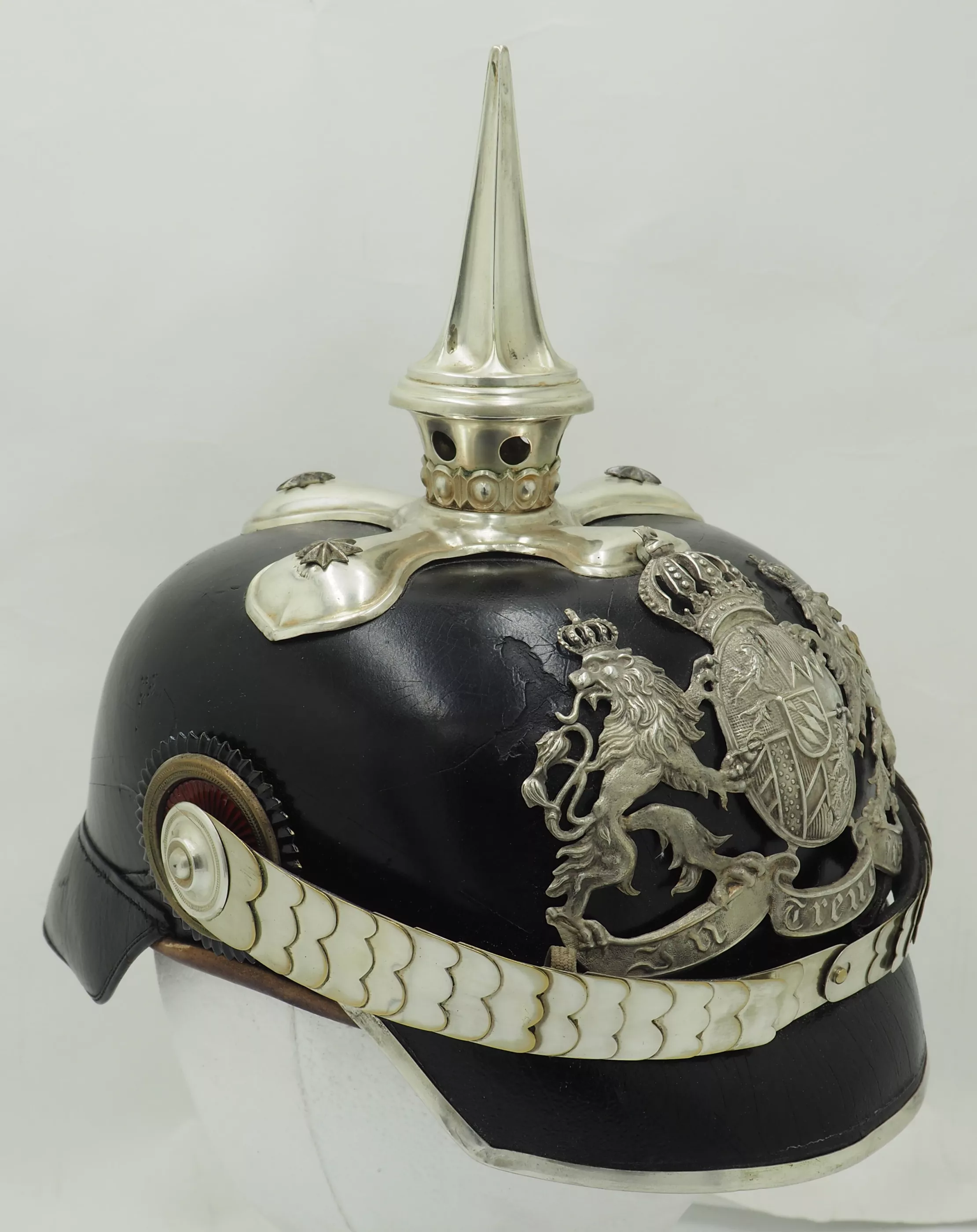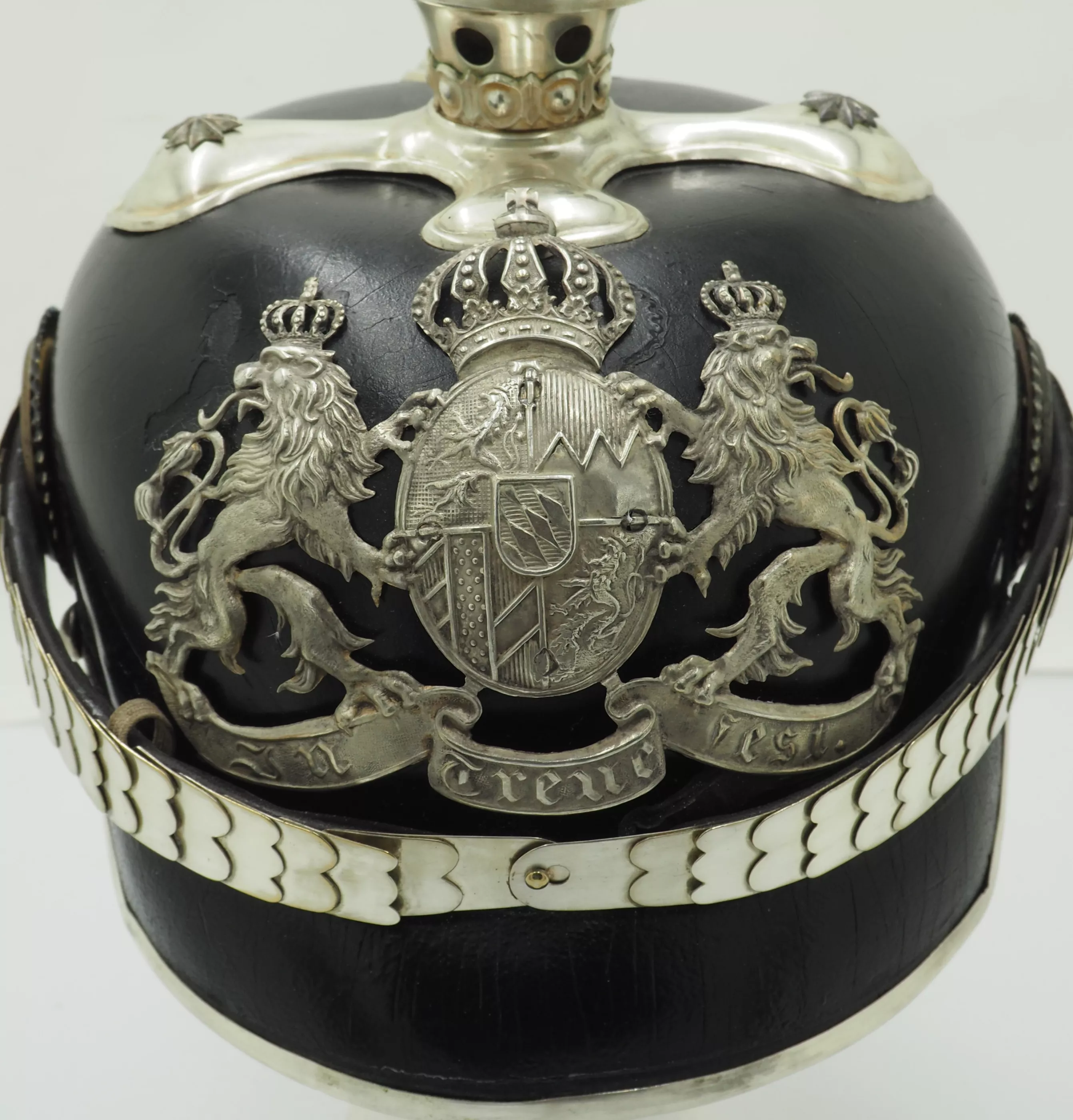 The frontplate is the matte silver type with the bright highlights. The frontplate has darkened with age but can be easily brightened back to original finish. No extra holes in the helmet body behind the plate. This helmet has never been cleaned or polished. Officers style cross base maintained by 3 stars and one front center brad. Tall fluted spike that unscrews. Beautiful silver flat chinscales maintained by rosettes. Original Reichs and Bayern officers Cockades. Rare Life-Guard helmet from Bavaria. Easily clean to pristine condition.