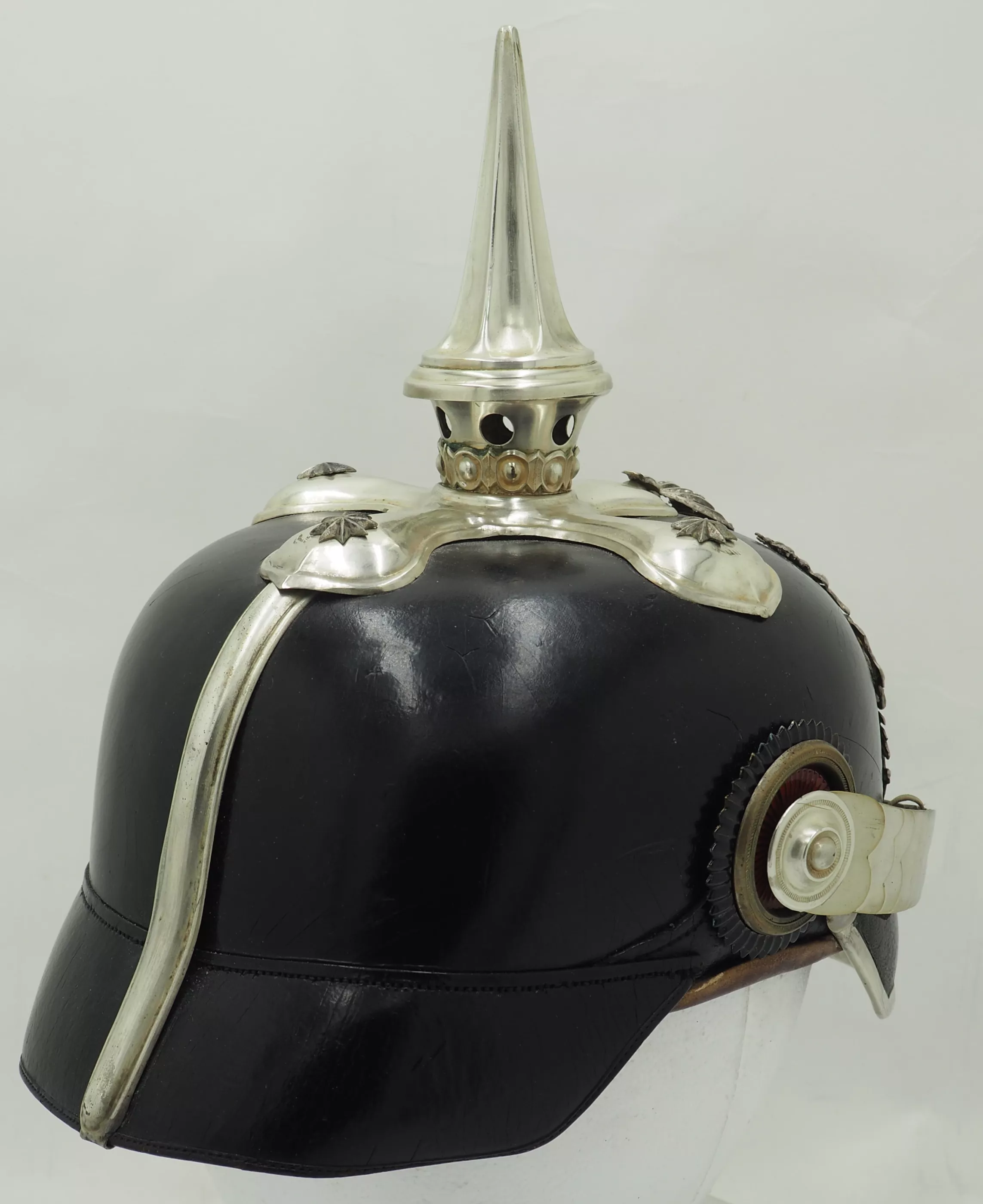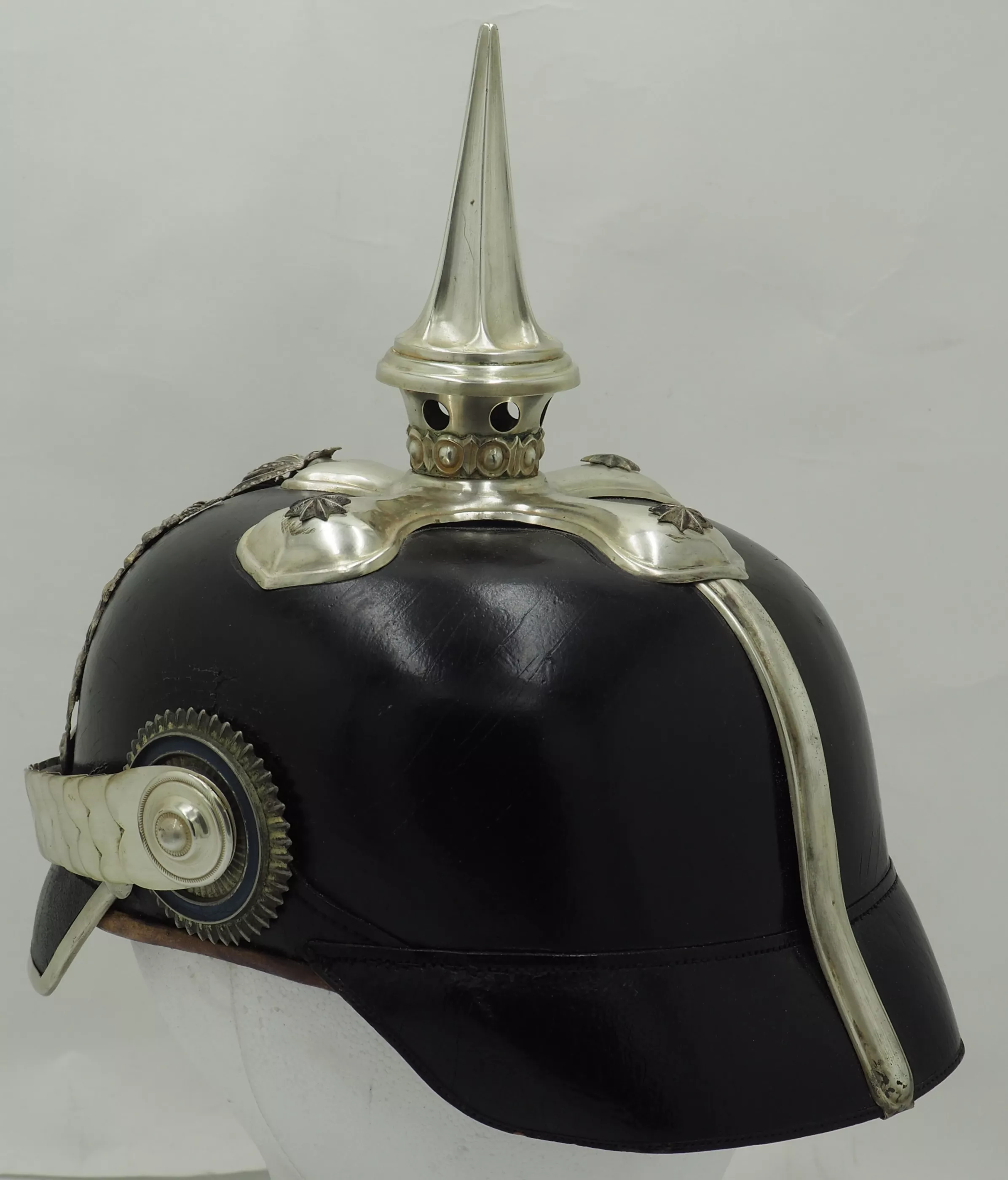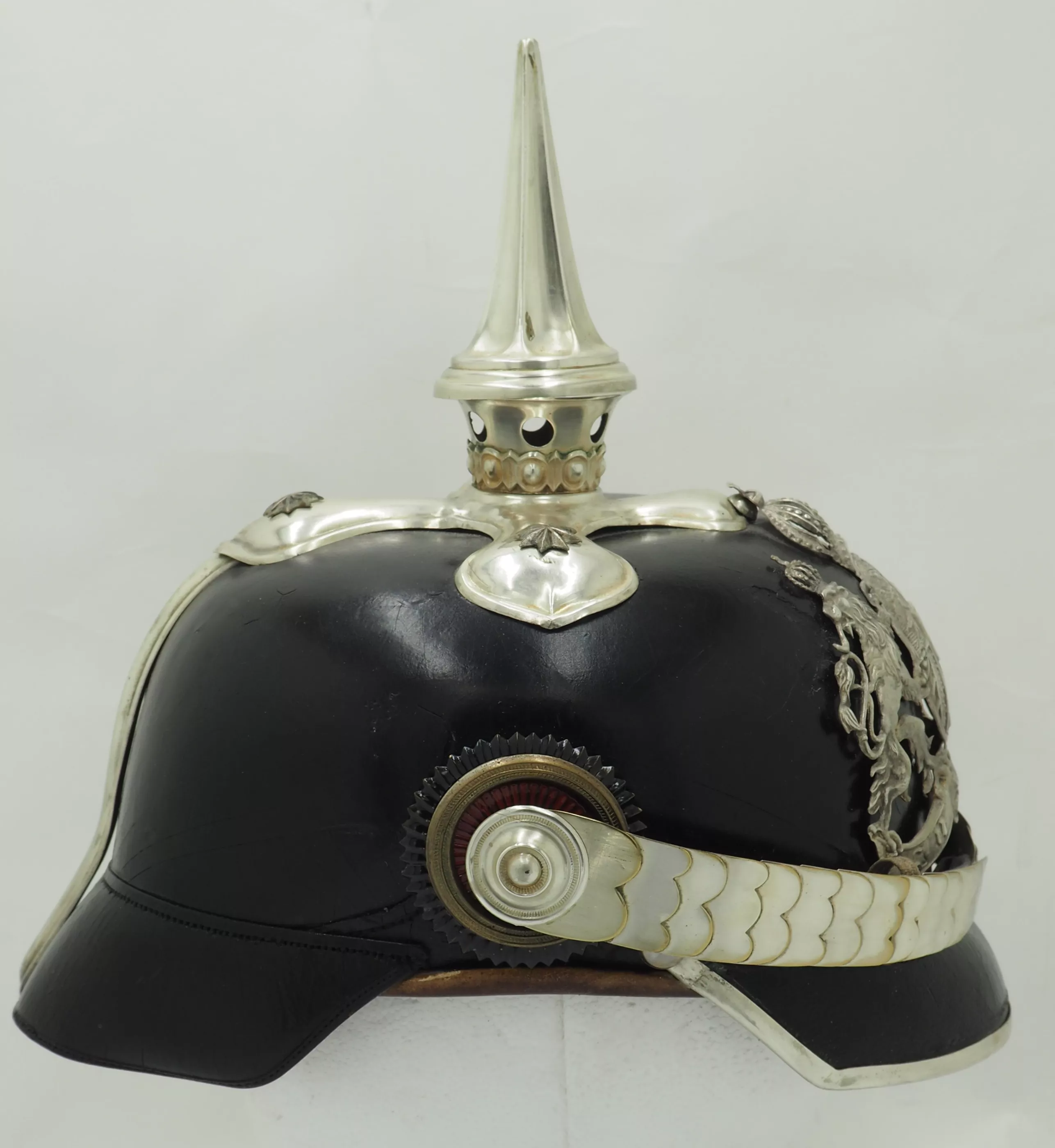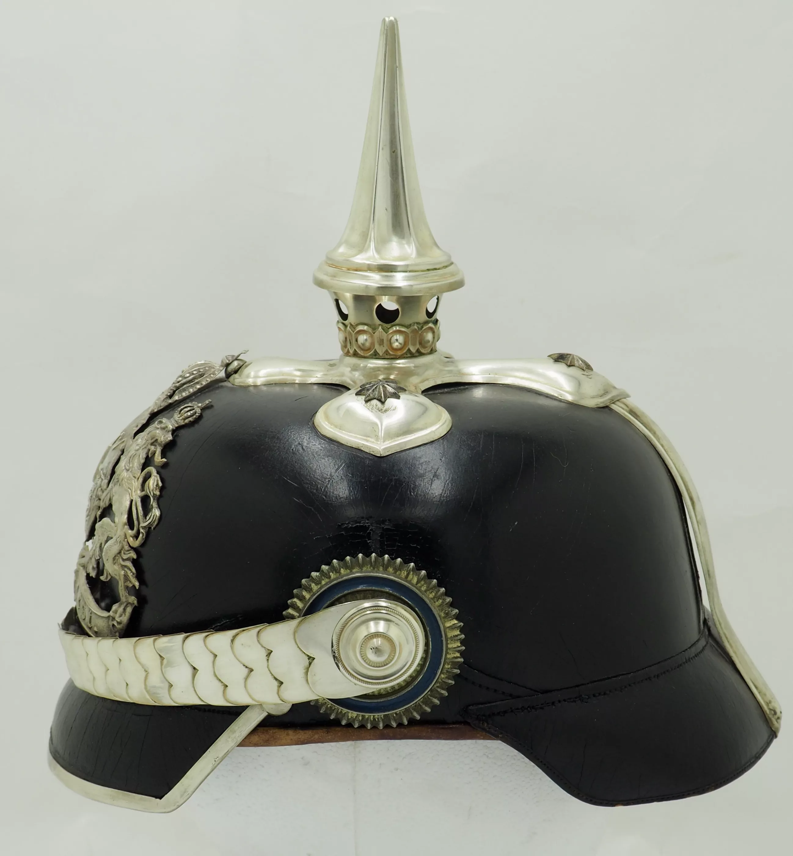 The frontplate is the matte silver type with the bright highlights. The frontplate has darkened with age but can be easily brightened back to original finish. No extra holes in the helmet body behind the plate. This helmet has never been cleaned or polished. Officers style cross base maintained by 3 stars and one front center brad. Tall fluted spike that unscrews. Beautiful silver flat chinscales maintained by rosettes. Original Reichs and Bayern officers Cockades. Rare Life-Guard helmet from Bavaria. Easily clean to pristine condition.
