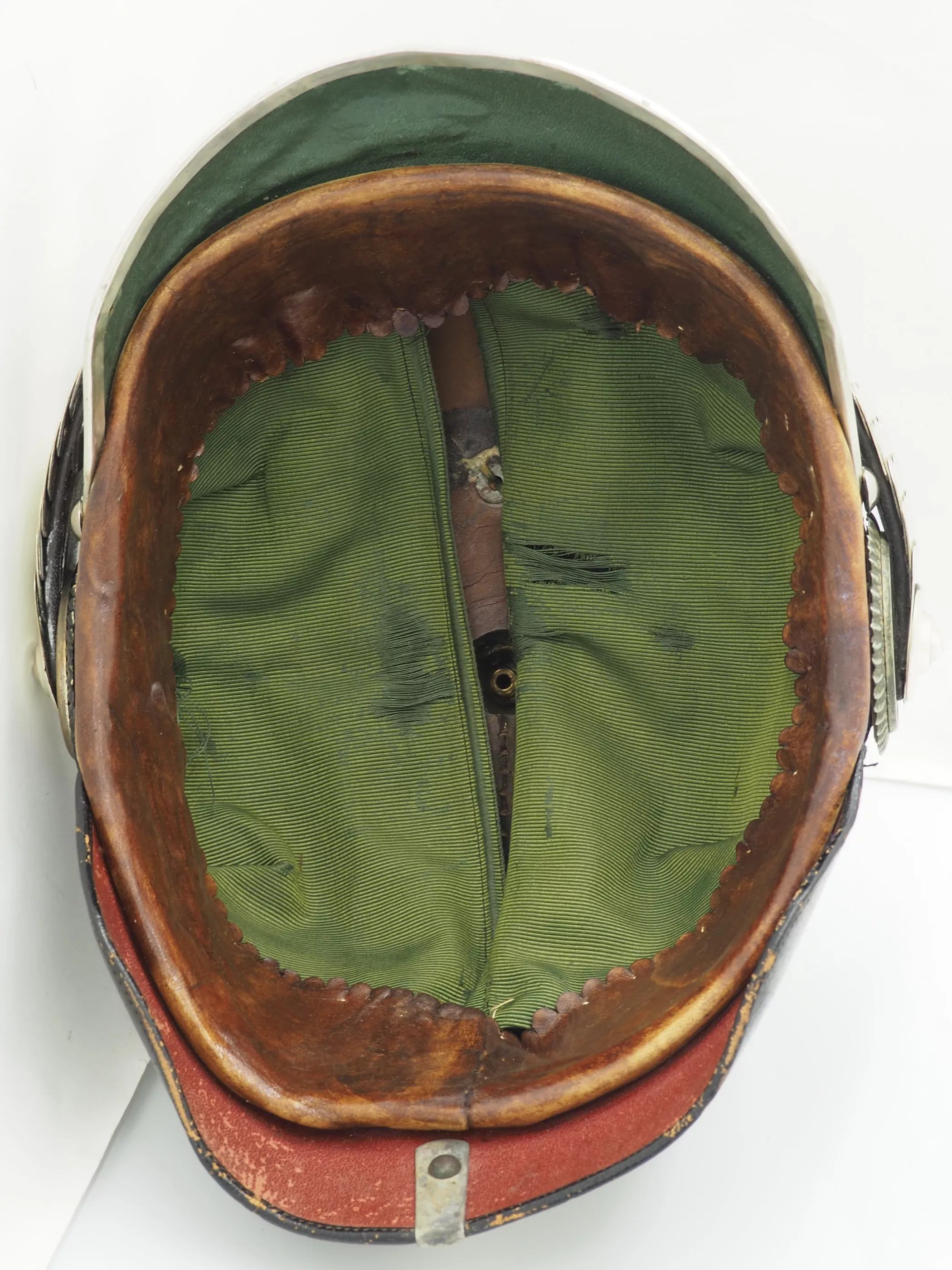 Bavarian Leib Infantry Officer Model 1897. From the Rich Ames Collection. Black lacquered fiber helmet with silver metal trim. The helmet has near perfect form and firm stitching. Lacquer finish remains near perfect with no crazing . Square front visor with green interior lining, back visor with red lining. Inside calfskin and silk lining is also in near excellent condition.