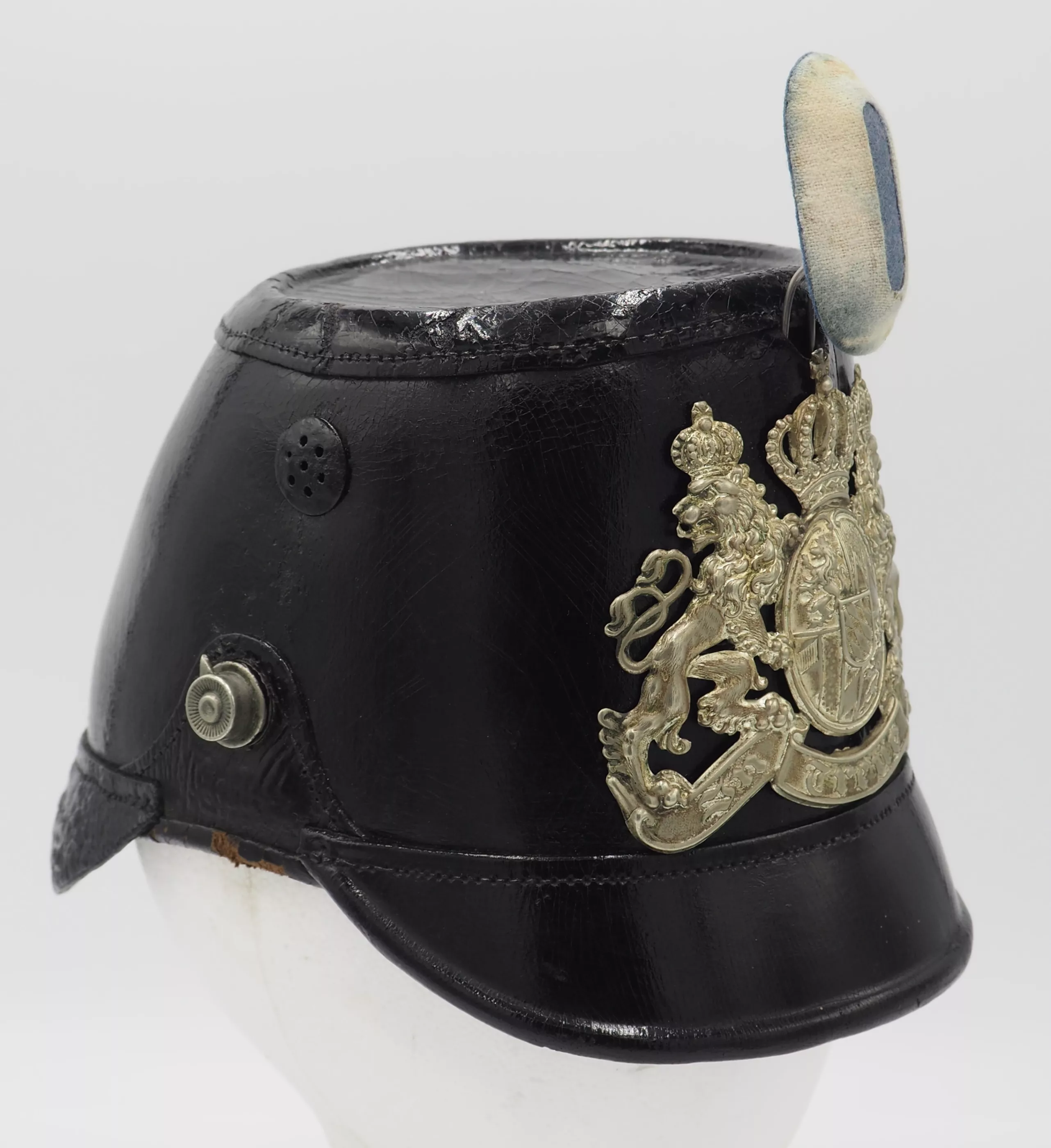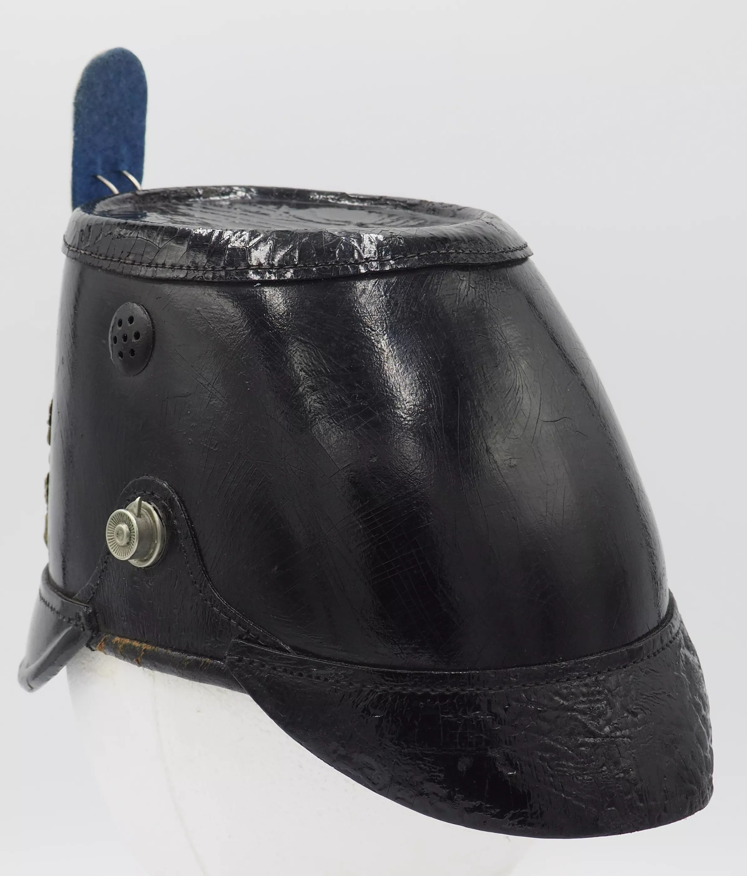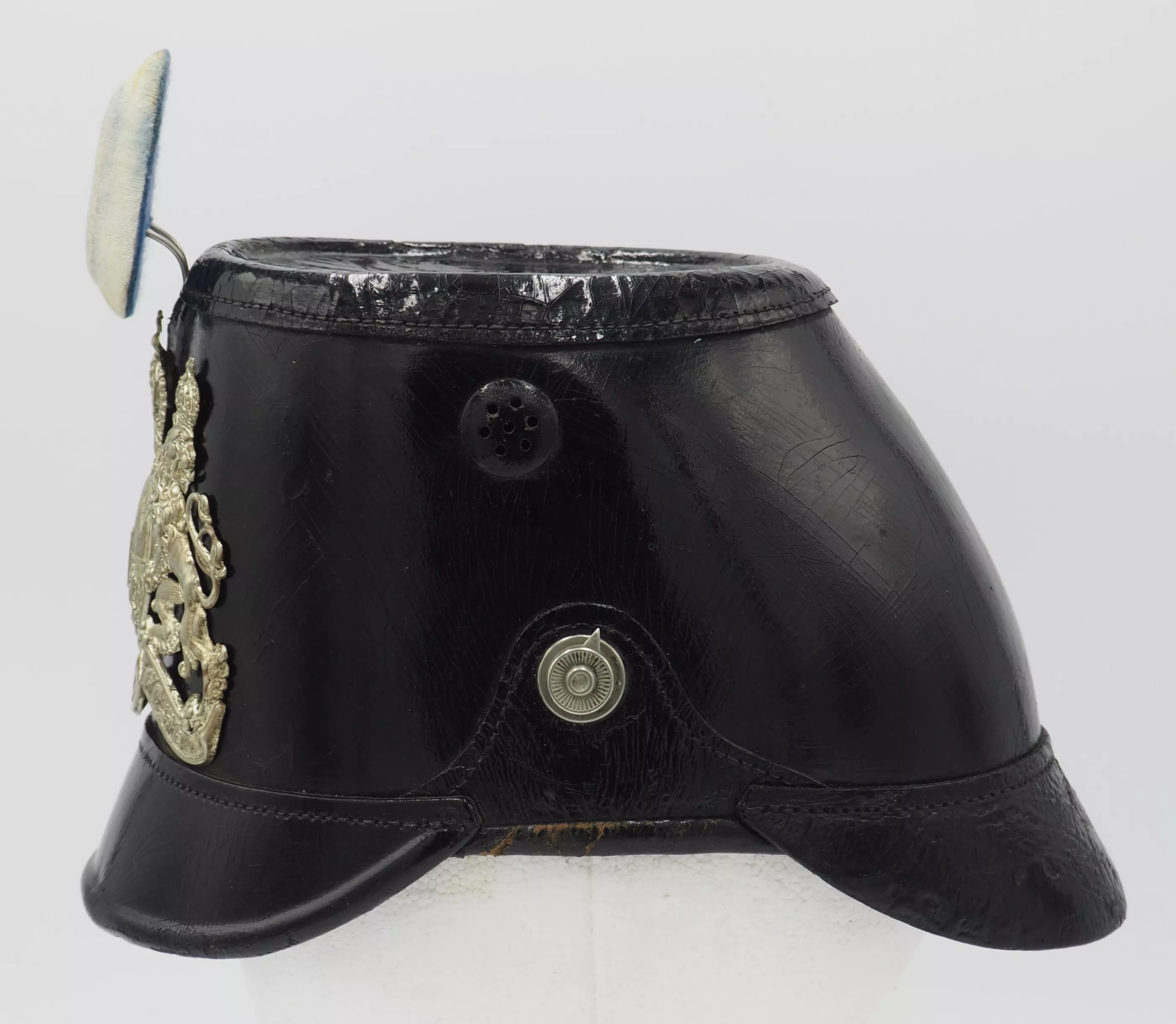 Bavarian Shako for Telegrapher, Kraftfahr, Eisenbahn, or Flieger Battalions, Enlisted Man - Model 1897. Black lacquered leather shako with silver metal trim. The helmet body is in very fine condition with good form and firm stitching. The exterior. No extra holes in the helmet body. The helmet interior has standard black dyed leather EM style liner.