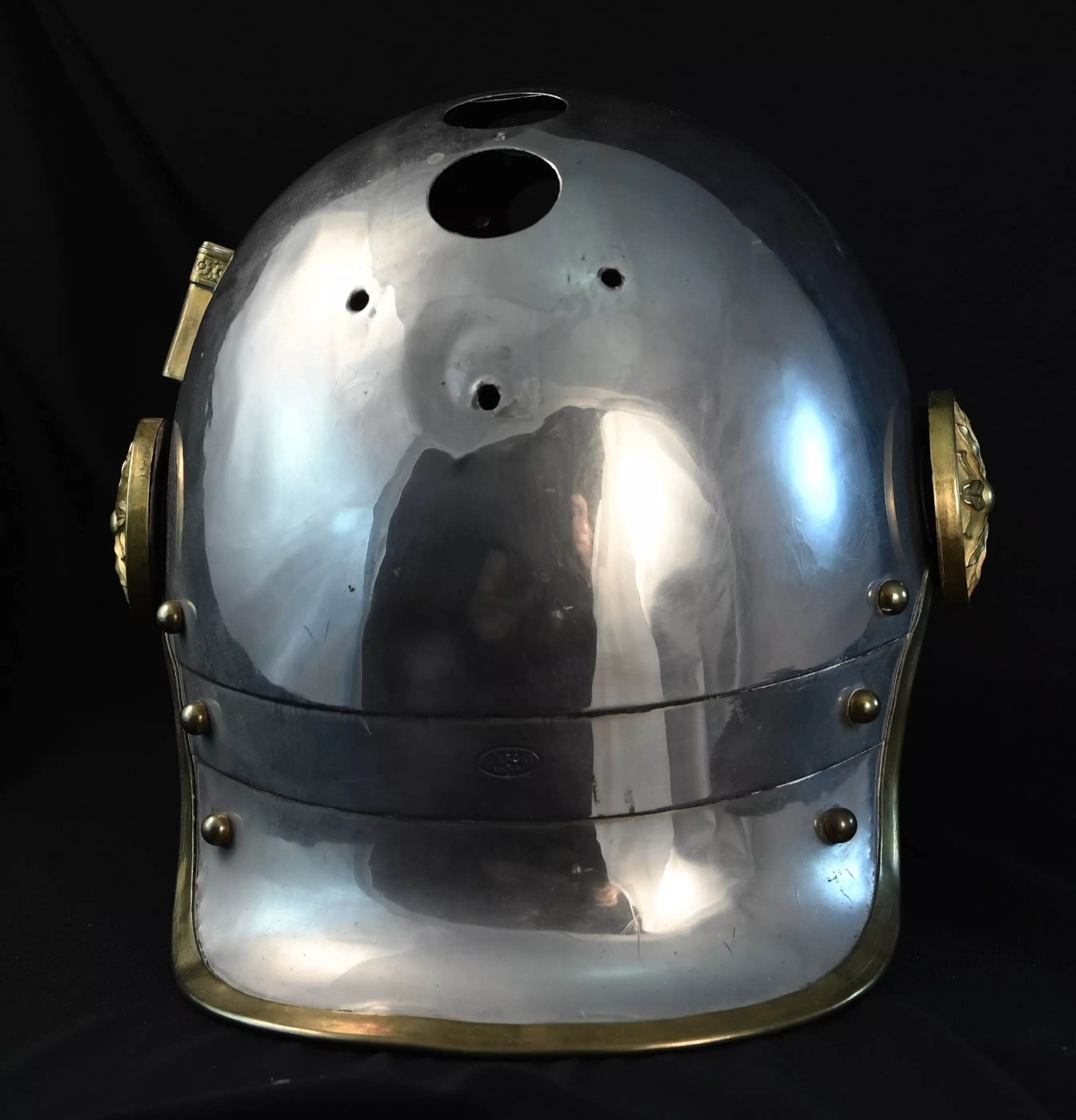 Nickeled helmet body for a French 1874 Cuirassier or Dragoon. Missing the cimier that was possibly removed to accomodate a field cover during the WW1 trench war. In that event the top cimier was usually replaced with a leather strip or metal plate (missing here).