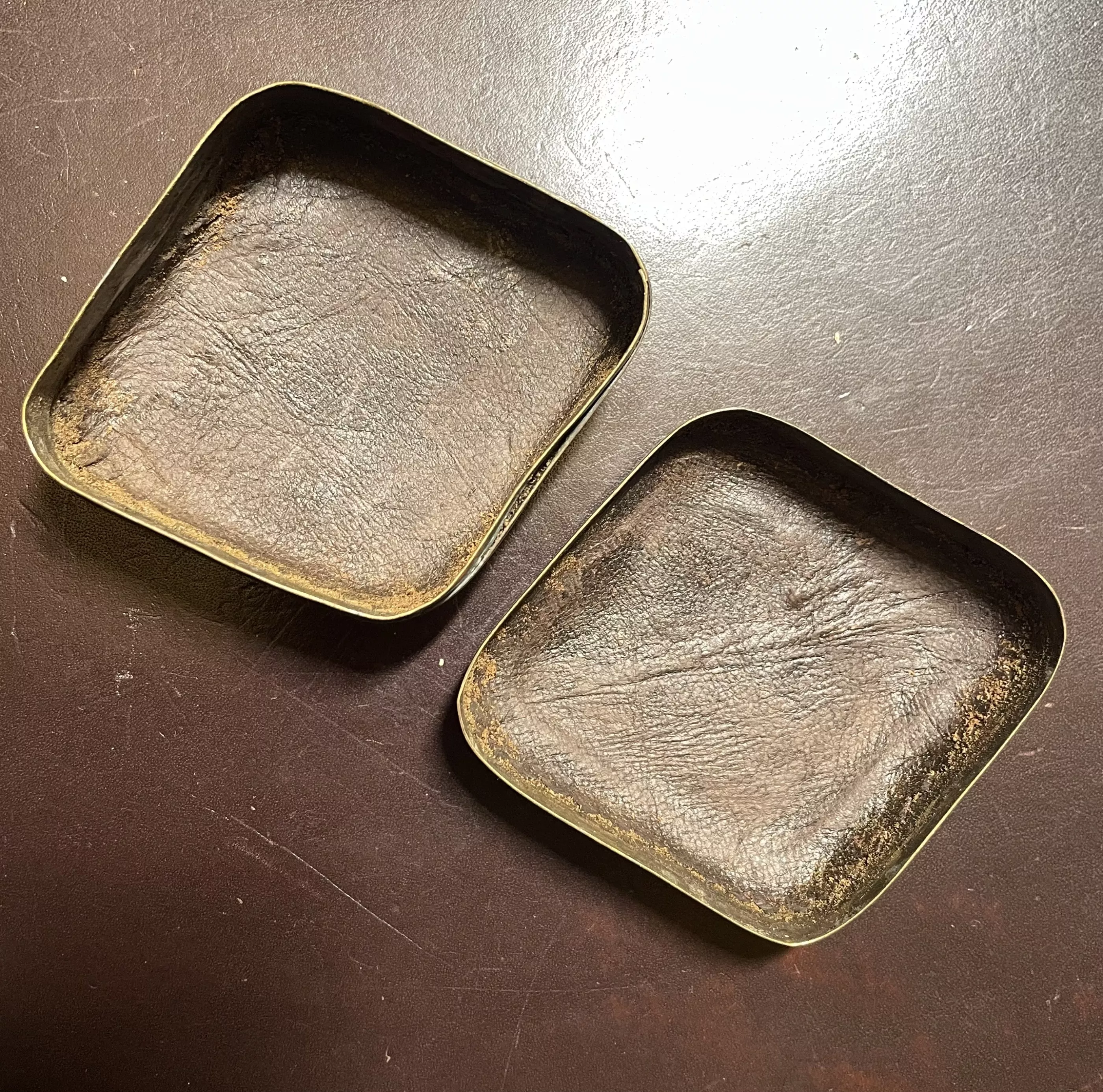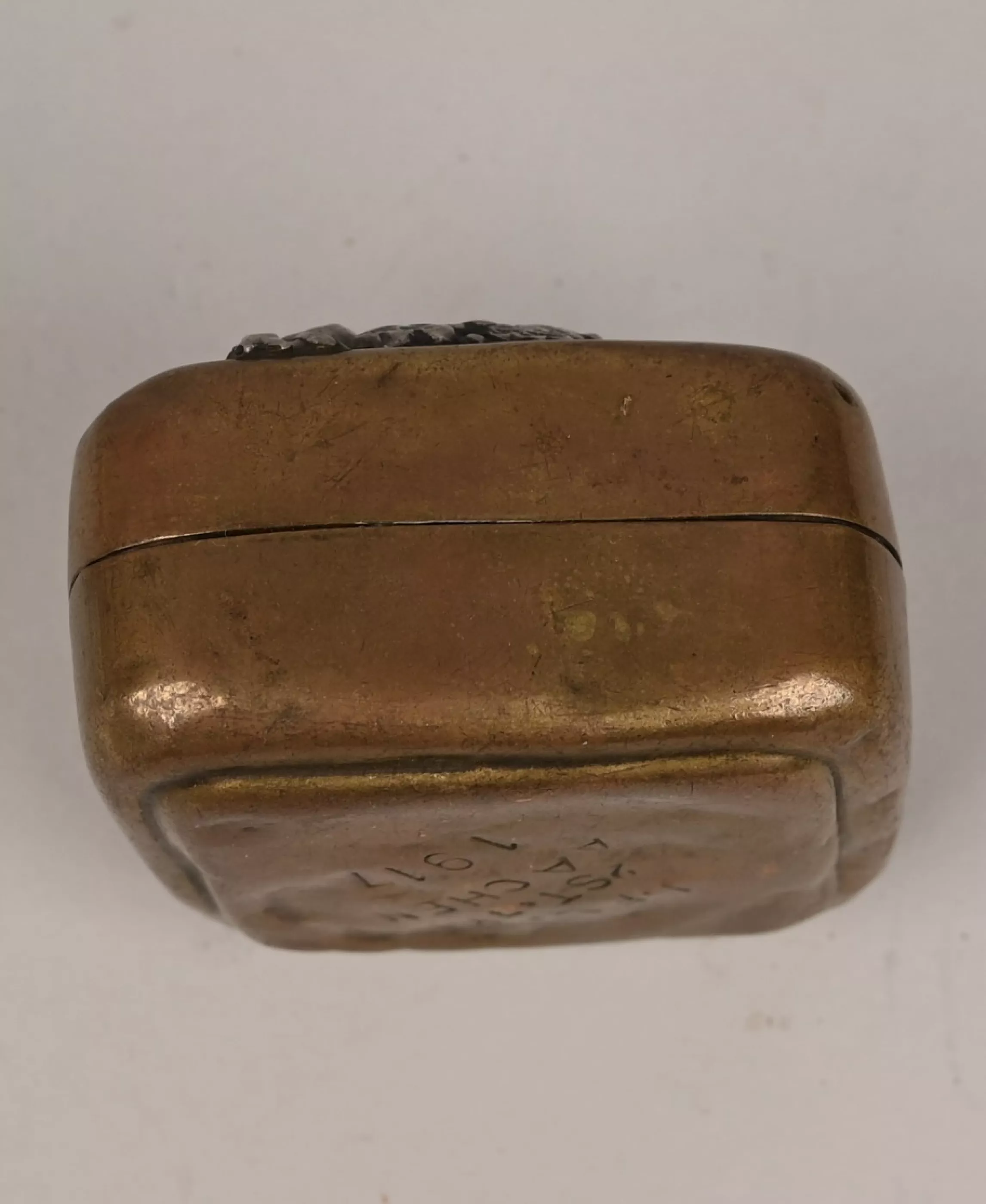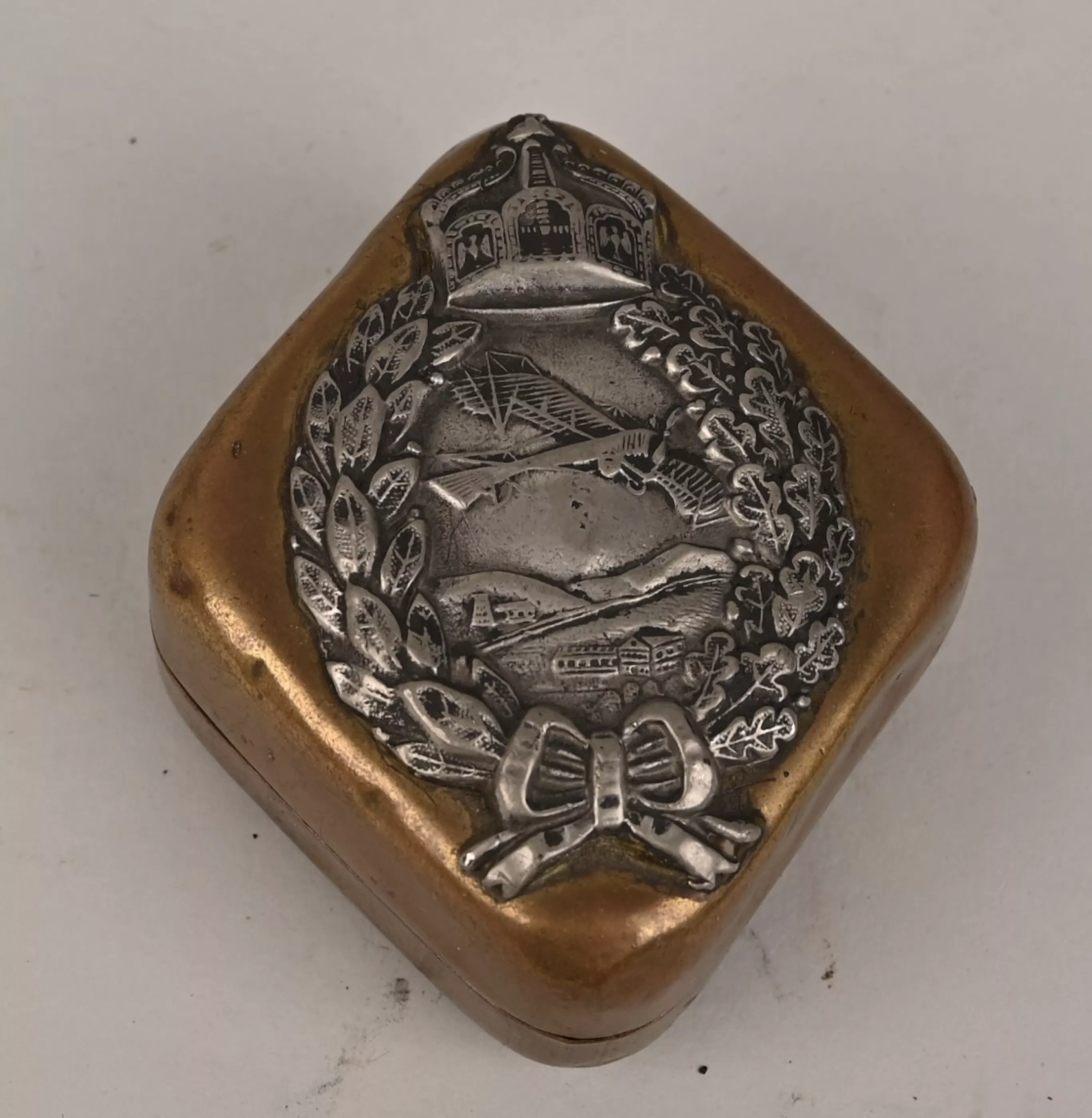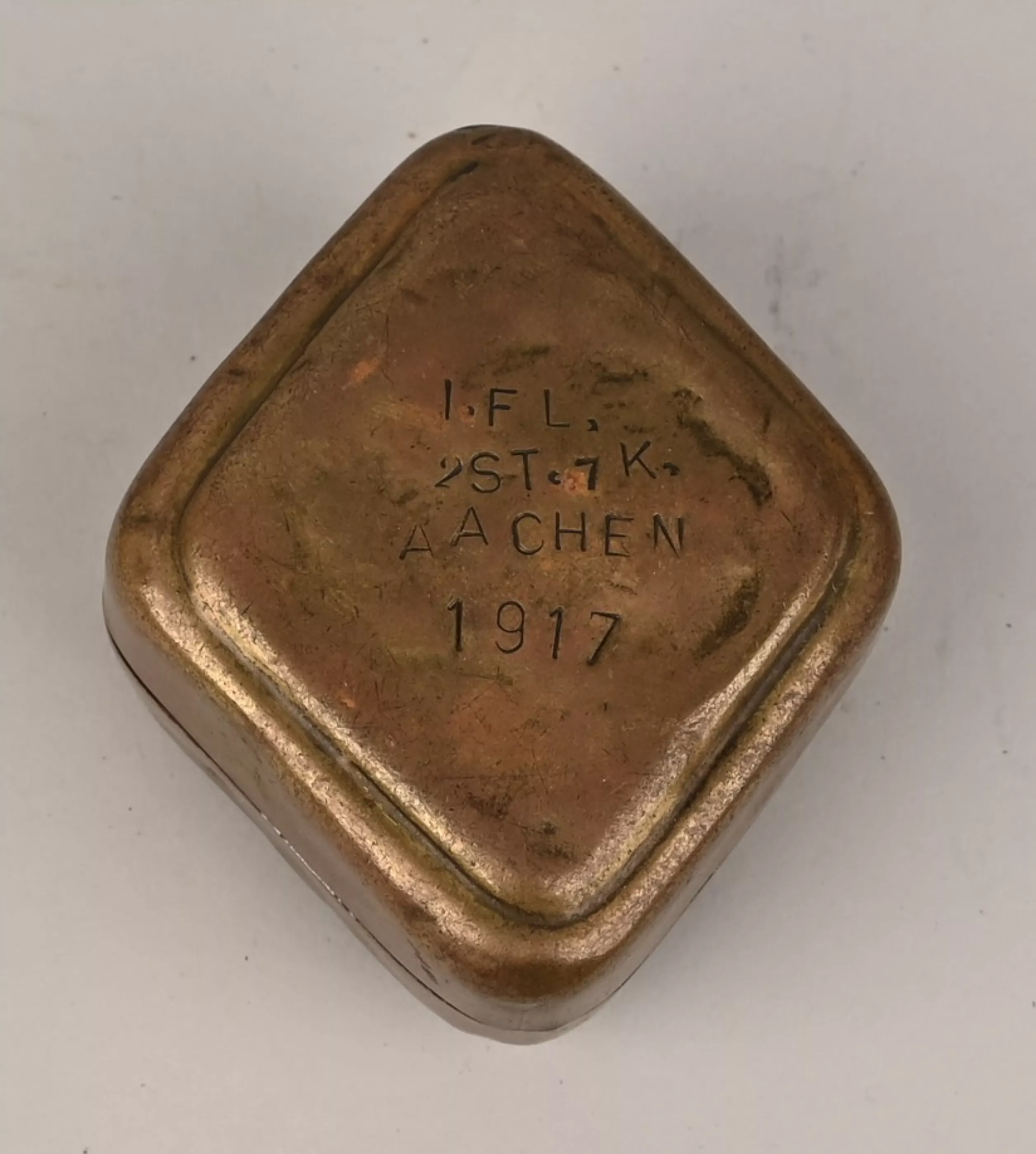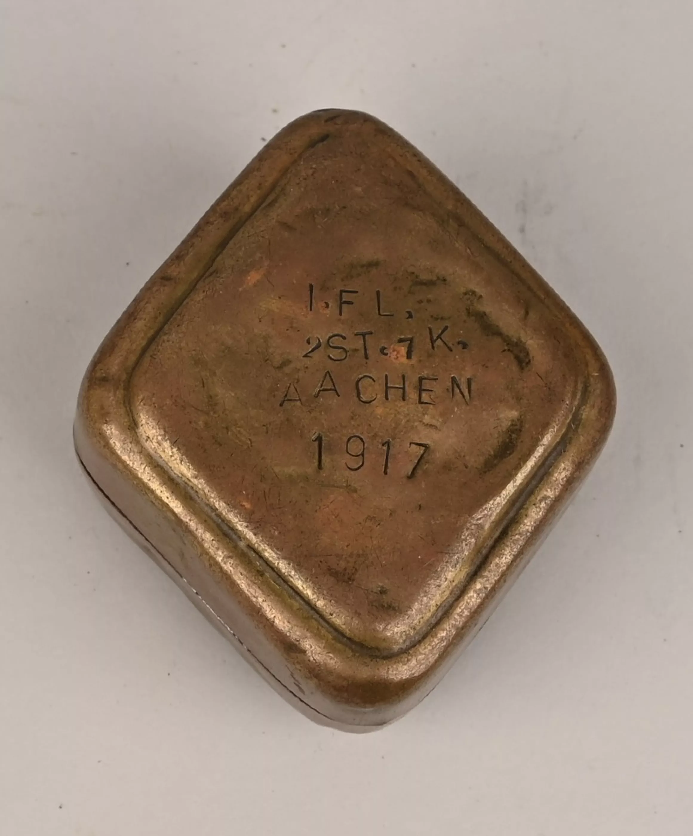 Stamped brass lined in brown leather. Top of the lid has the Flugzeugführer Abzeichen (Badge) in silver soldered to it. The bottom bears the Markings "I.FL 2ST. 7K. AACHEN 1917". very unusual souvenir.