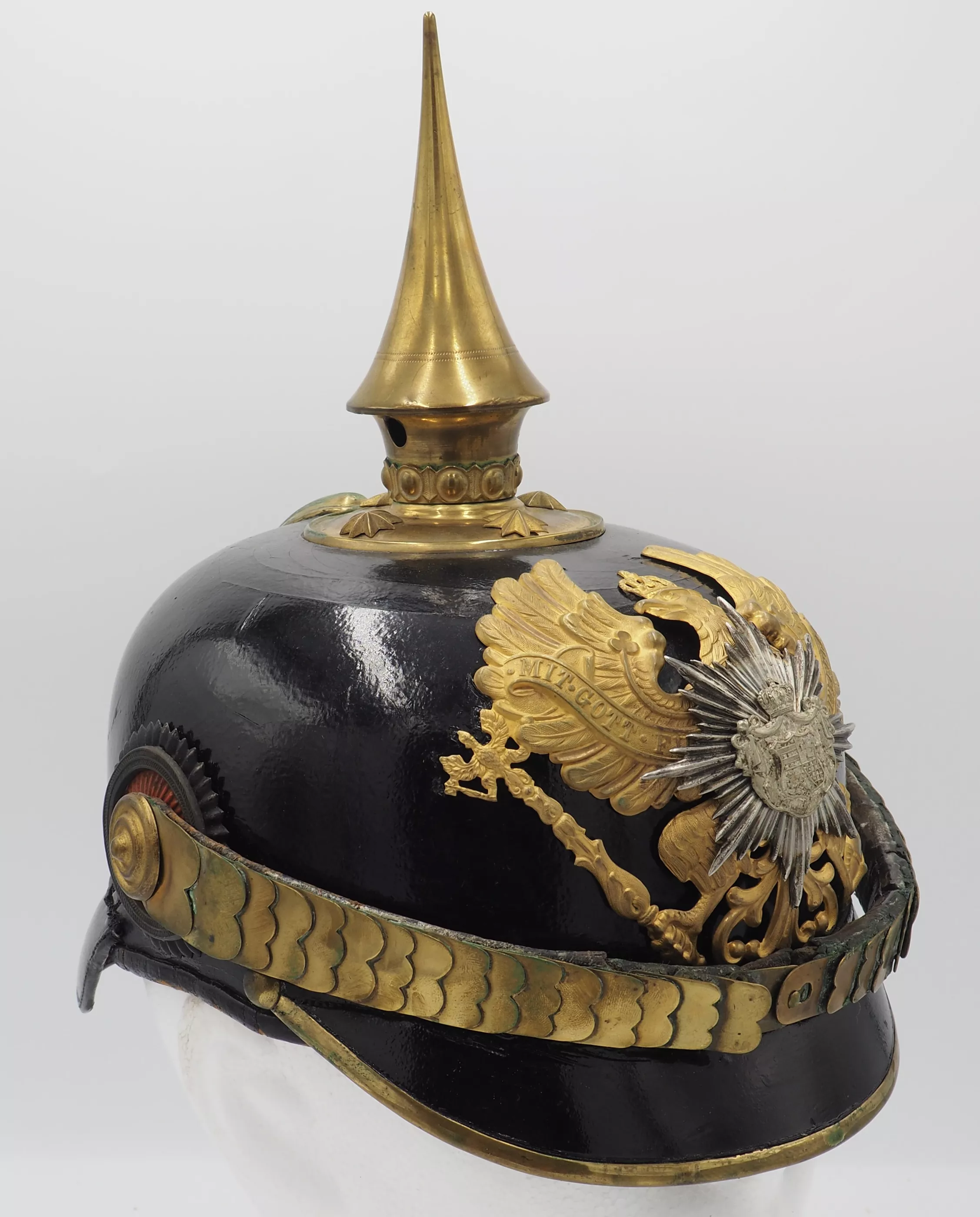 The frontplate is the Prussian Line Officers Eagle with the silver star and the arms of Oldenburg on the Eagles breast. The Oldenburg Star is mounted to the frontplate with 2 screws but there are two slits in the eagle where another star may have been mounted. There are no solder marks so they may not have been used. The Oldenburg Star is the only one appropriate for this eagle. Tall gold Officers Spike with star retainers. Flat gilt chinscales held by gold rosettes. Officers blue and red Oldenburg and Reichs Cockades. Very attractive rare regiment helmet.