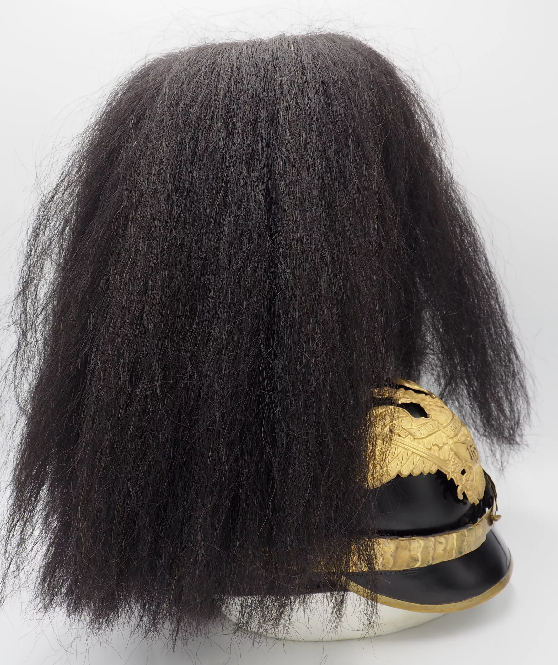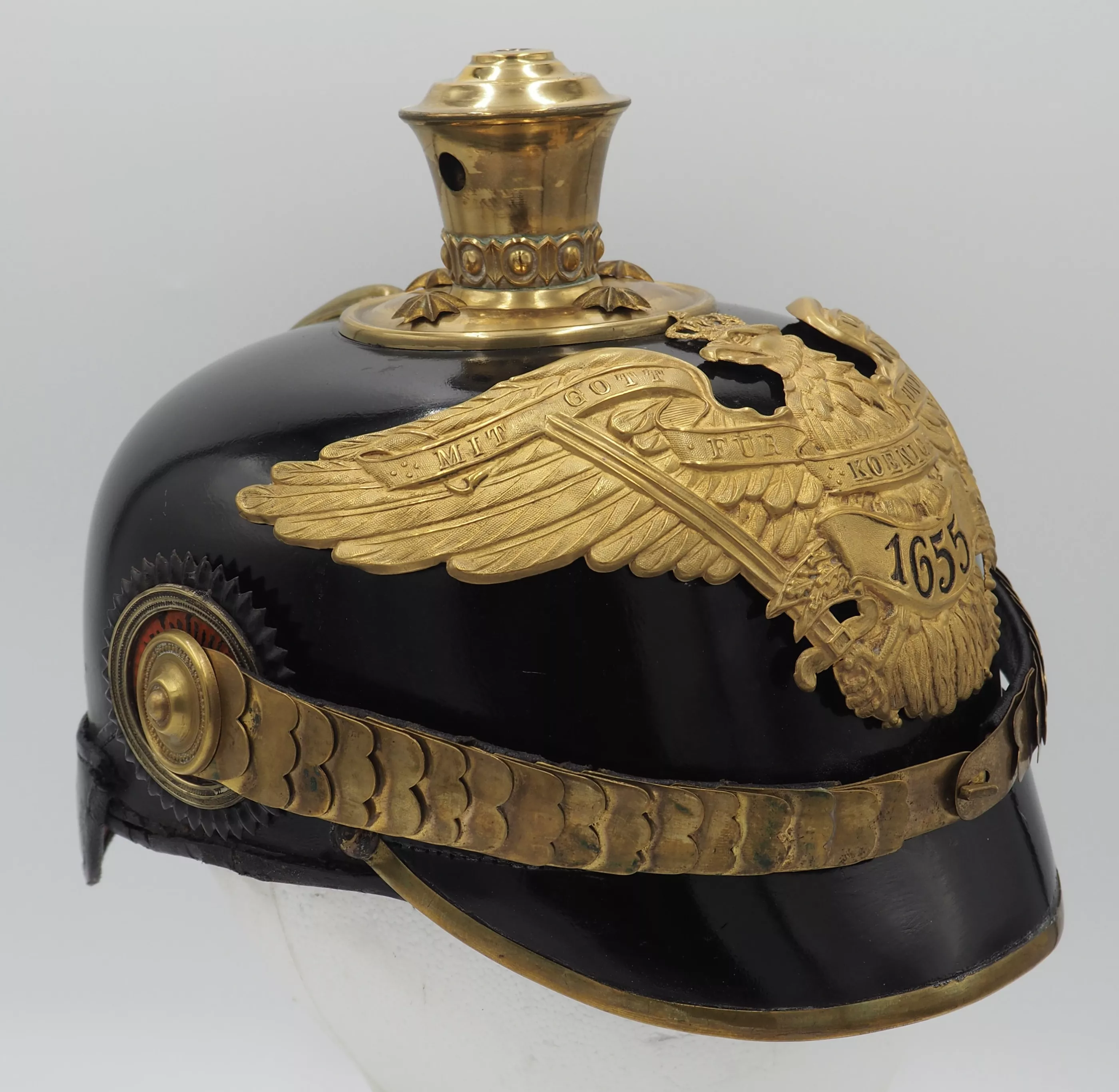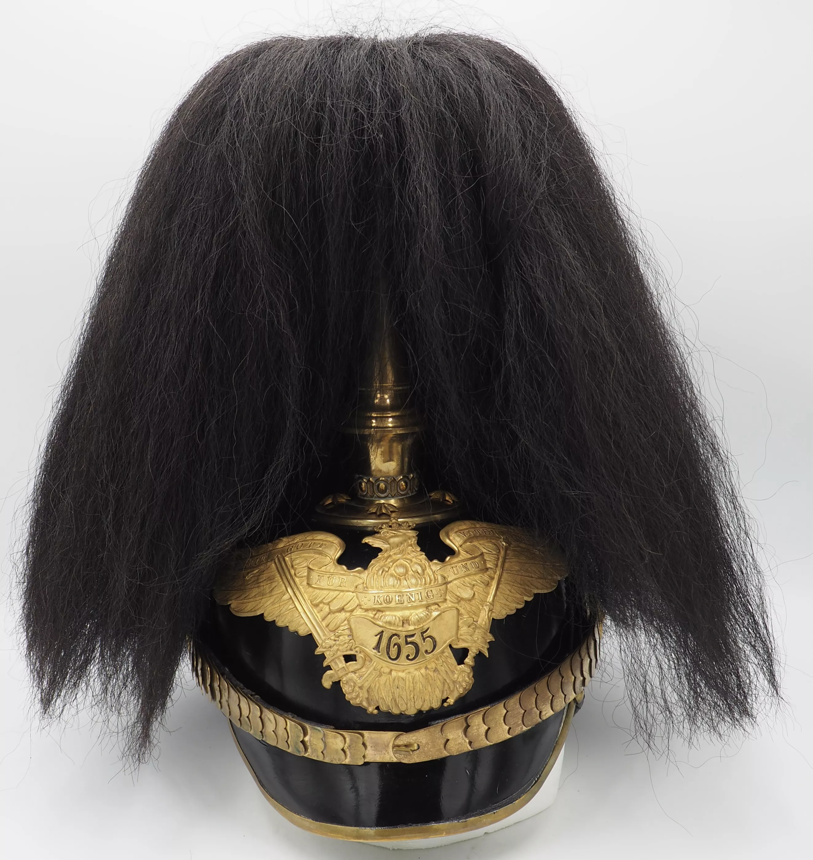 Prussian 1st Grenadier Regiment with Banner “1655”, Officer Model 1897 (Newest Model used after 1911. The newer eagle replaced by the old-style Grenadier Eagle with FWR monogram and 1655 banner over the eagle’s head. The helmet is fitted with black hair parade plume. From a European Collection. Black fiber helmet body with fine fire gilt trim. As the helmet dates from post 1911 so this helmet may come from the early wartime era but the metal trim is clearly pre-war quality. The fiber helmet body in perfect condition with firm stitching. The exterior lacquer in near mint condition with a bright finish and no lacquer loss. The helmet body has NO extra holes.
