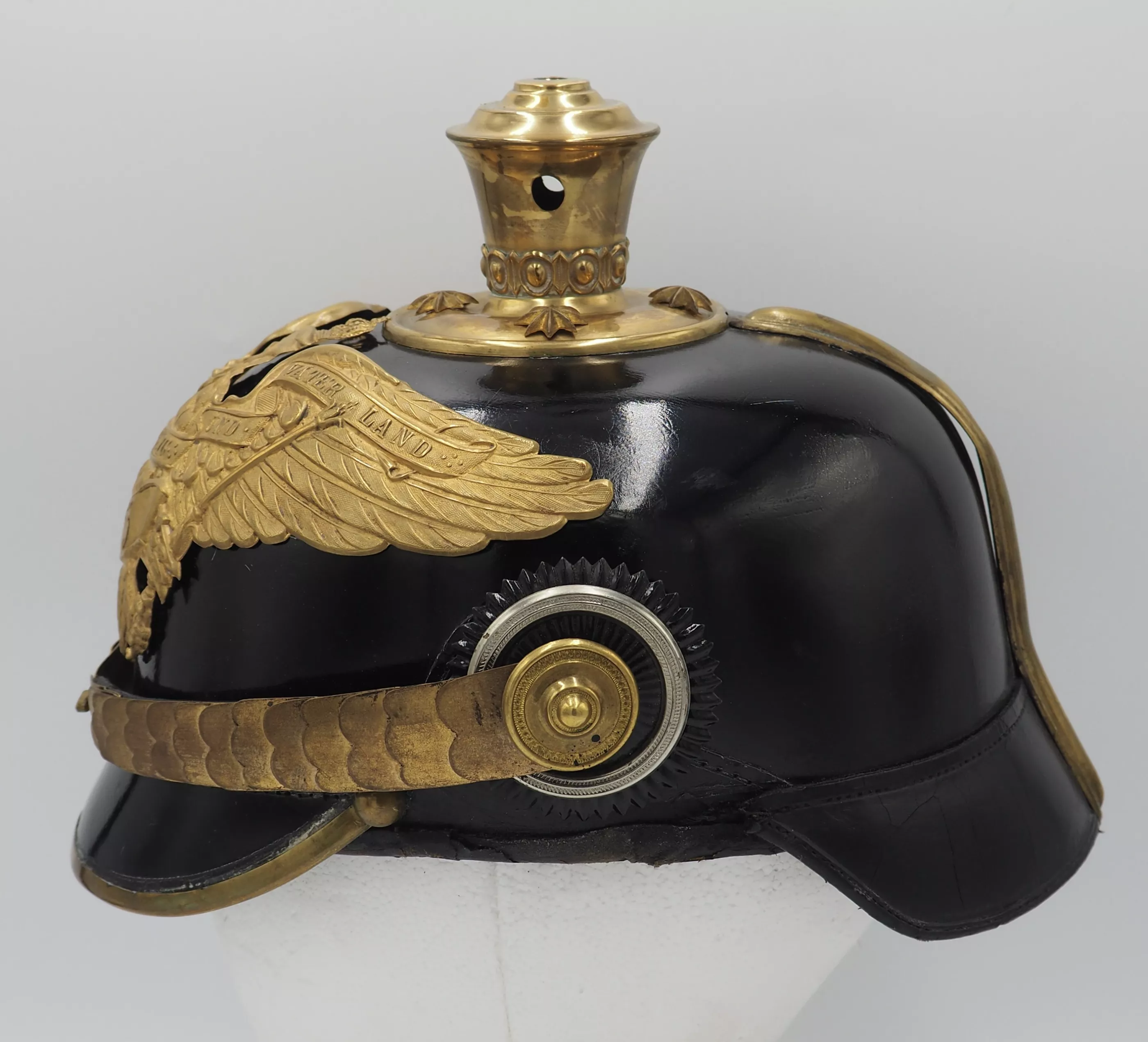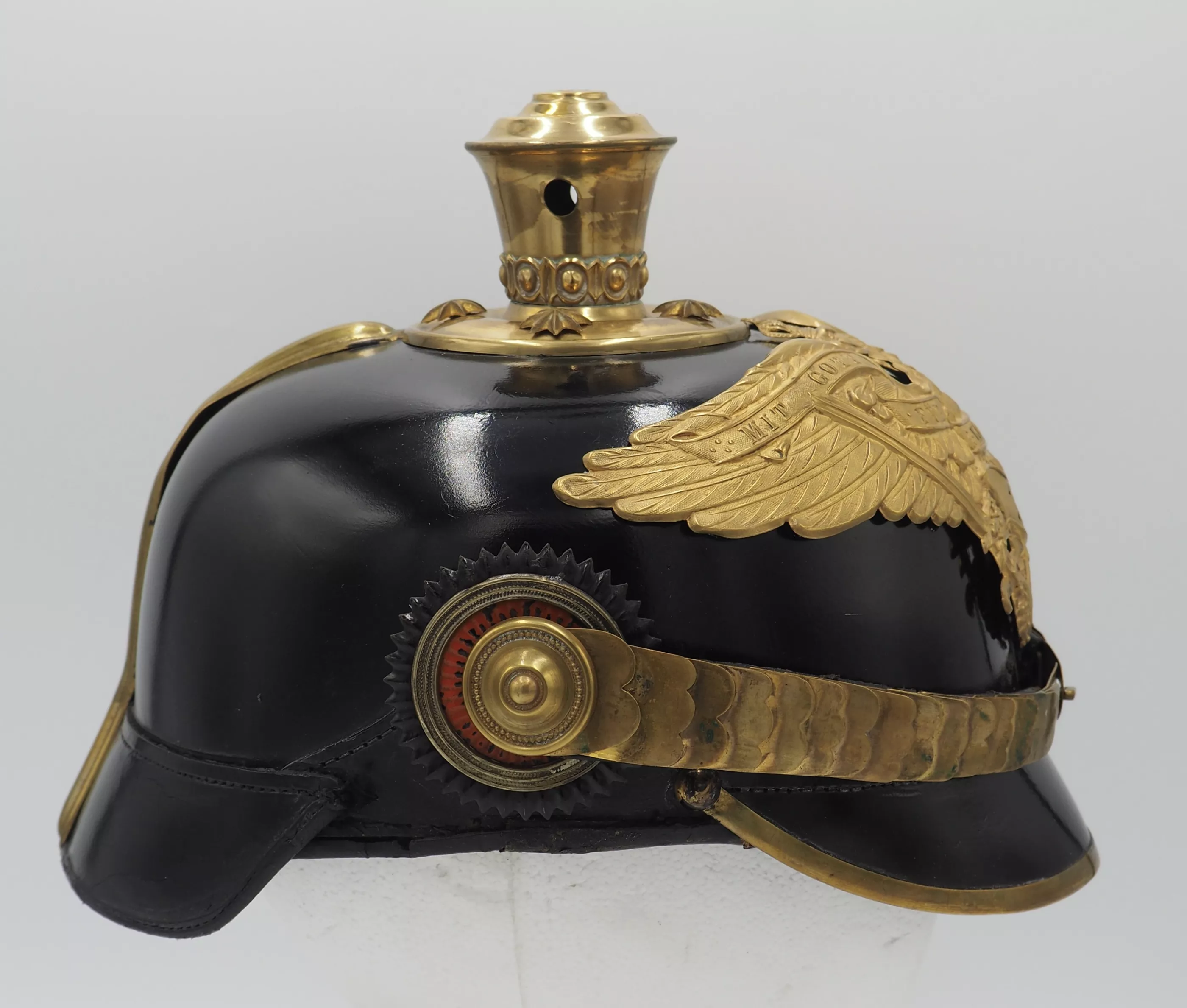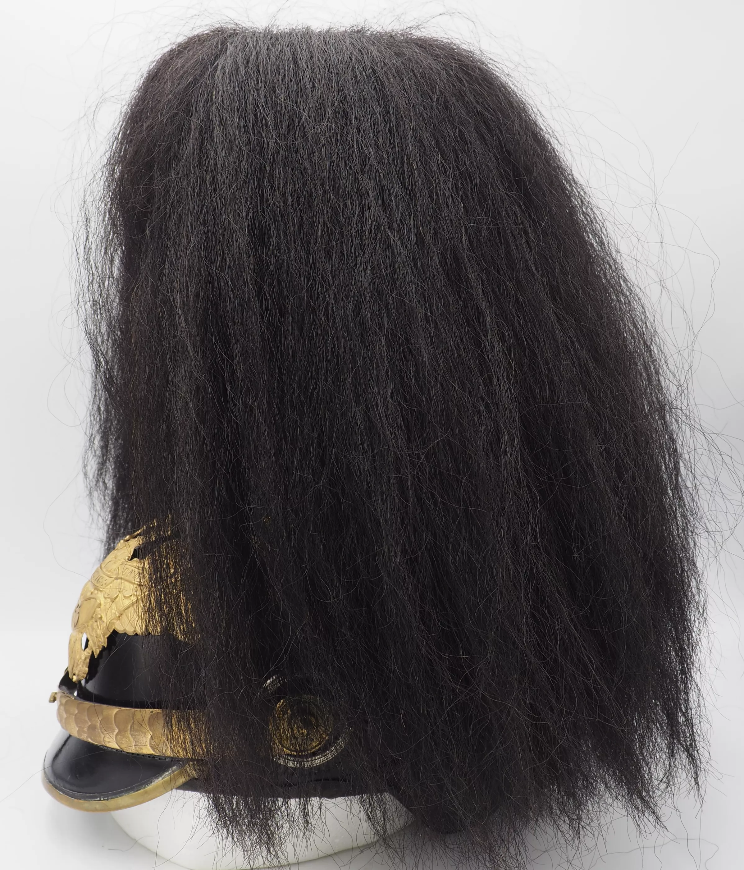 Prussian 1st Grenadier Regiment with Banner “1655”, Officer Model 1897 (Newest Model used after 1911. The newer eagle replaced by the old-style Grenadier Eagle with FWR monogram and 1655 banner over the eagle’s head. The helmet is fitted with black hair parade plume. From a European Collection. Black fiber helmet body with fine fire gilt trim. As the helmet dates from post 1911 so this helmet may come from the early wartime era but the metal trim is clearly pre-war quality. The fiber helmet body in perfect condition with firm stitching. The exterior lacquer in near mint condition with a bright finish and no lacquer loss. The helmet body has NO extra holes.