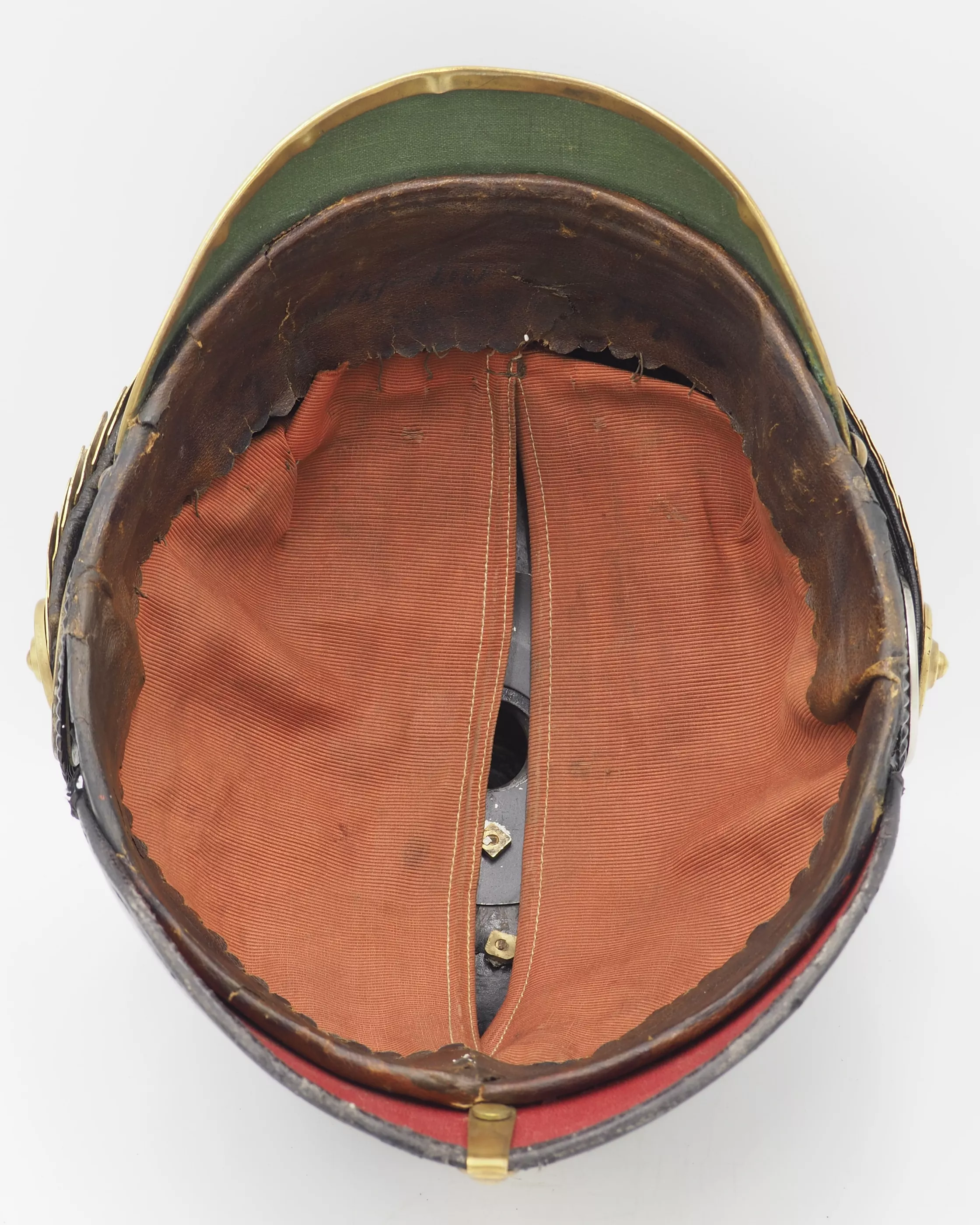 The helmet interior has standard sweat leather and silk headliner. The liner is in excellent condition but shows minimal use, tears and wear. Inner visors colored red and green as is proper for an officer helmet. Round spike base with star retainers. The tall gilt plume trichter is removable. The frontplate in the Prussian wide winged Grenadier Eagle and below it the banner ”1655”, to commemorate the founding date of this Regiment. The eagle placement is slightly high on the helmet body but it is clearly original to the helmet as you can see the outline of the eagle in the helmet lacquer. Flat gilt chinscales on rosettes. Original Reichs and Prussian Officer cockades. Absolutely 100% original helmet from an old collection. Near mint condition. Rarely seen in today’s marketplace.