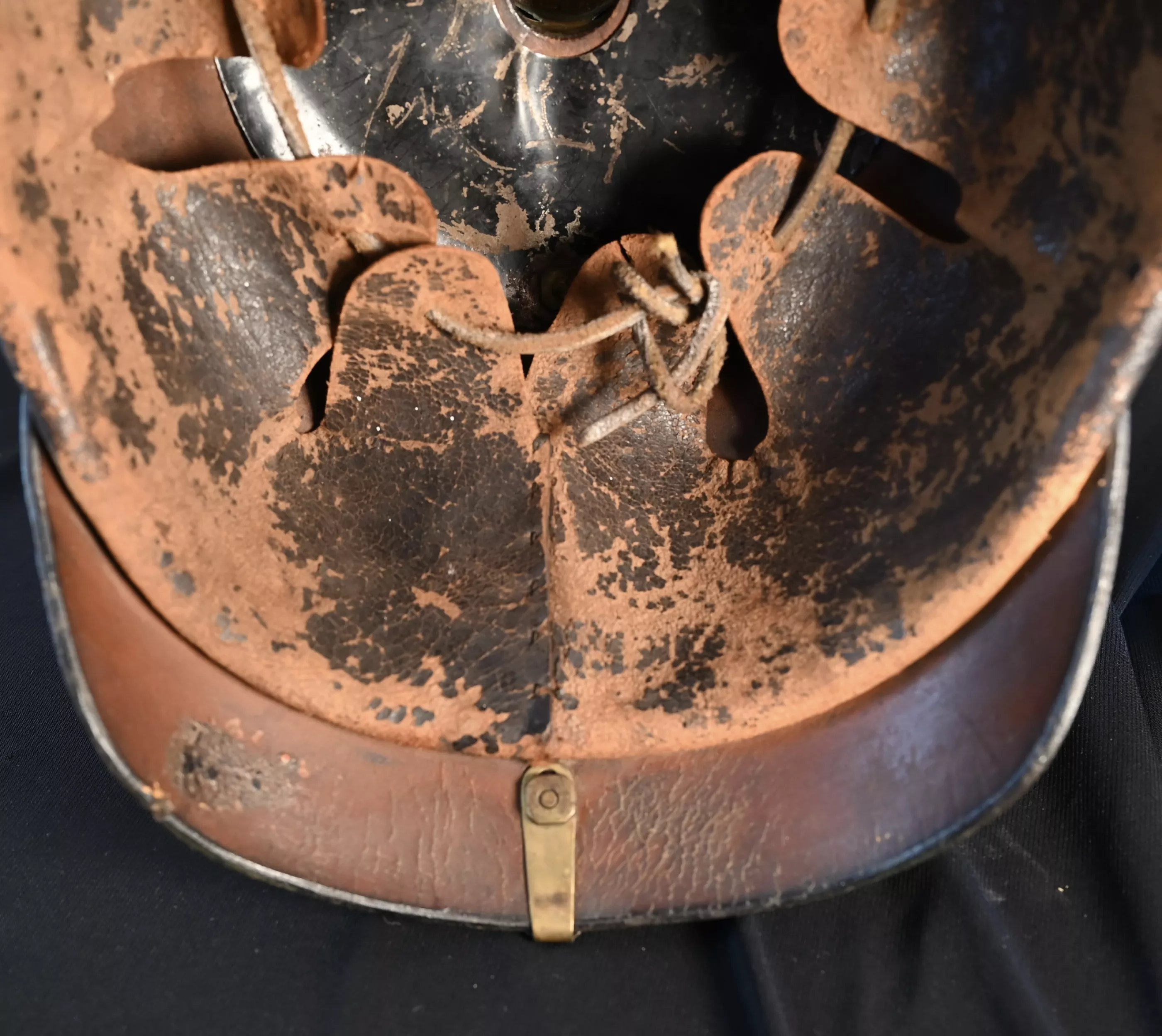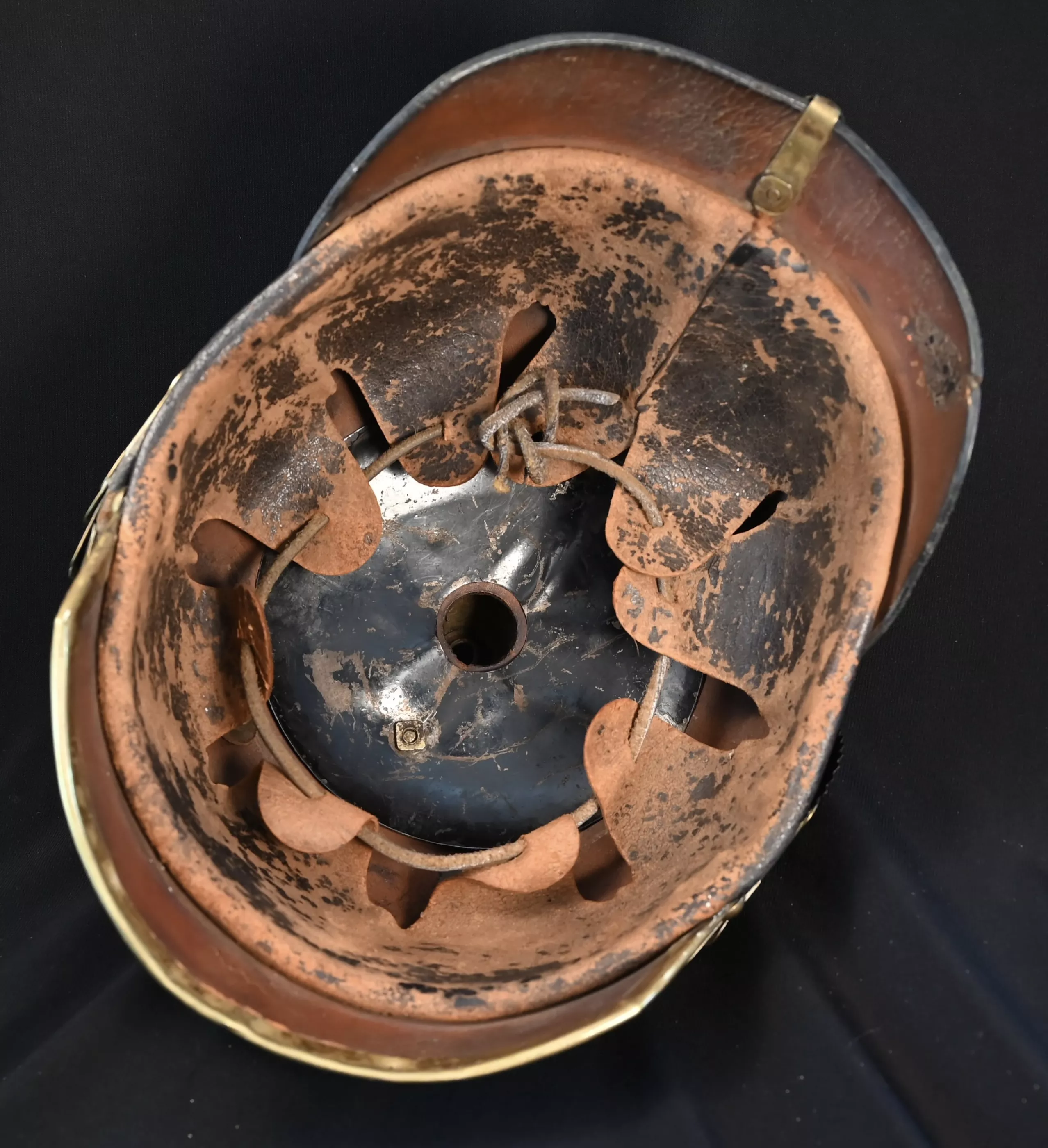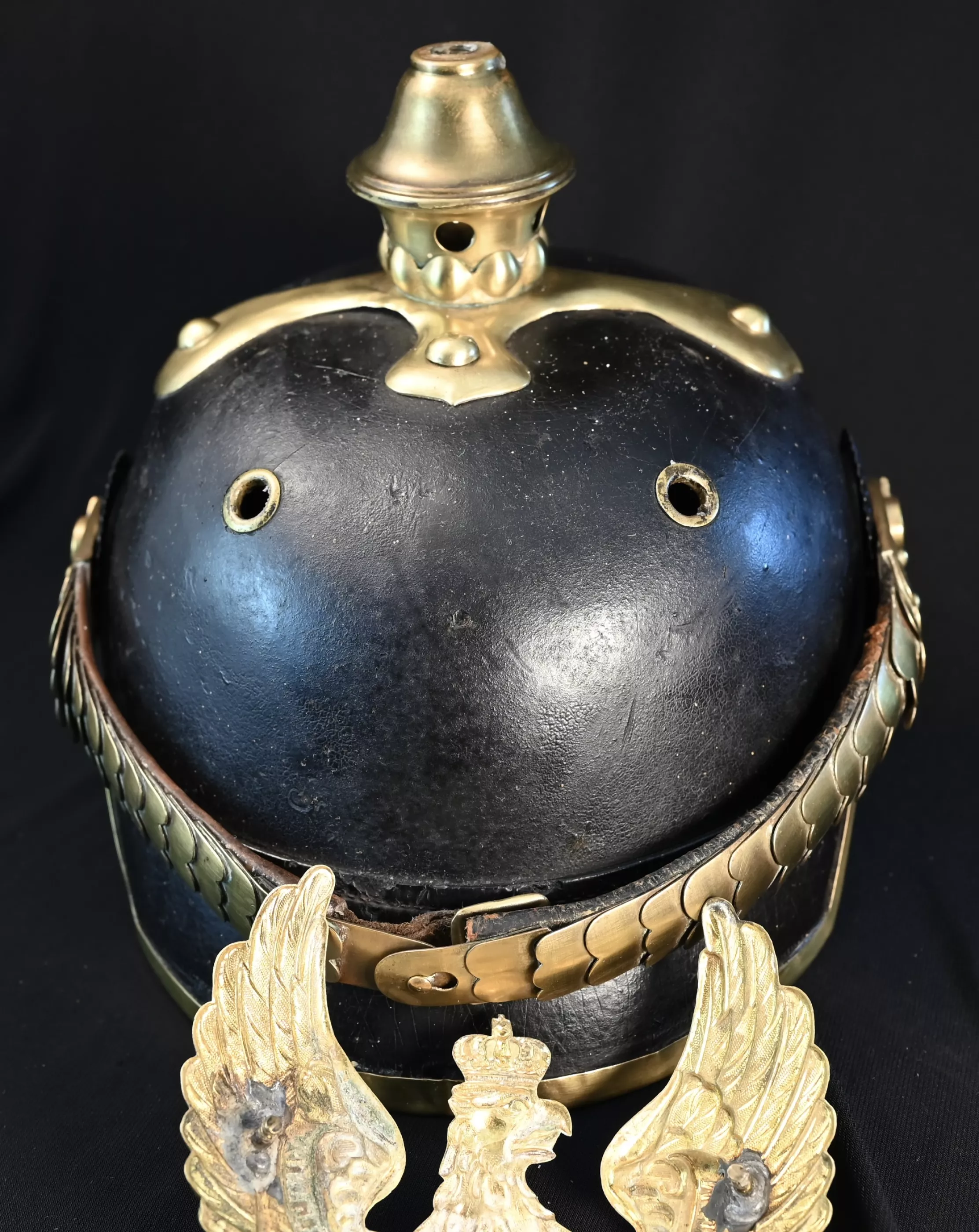 Black Laquered leather helmet body in excellent overall condition. Lacquer remains smooth with no defaults. Both visors are firmly stitched, front one is the square type for Cavalry. Beautiful brass trim with the Dragoon style Cross base and typical spike top. Base retained with 4 round brads. Spike is removable to be fited with a trichter and plume for parade. Dragoon back spine.
