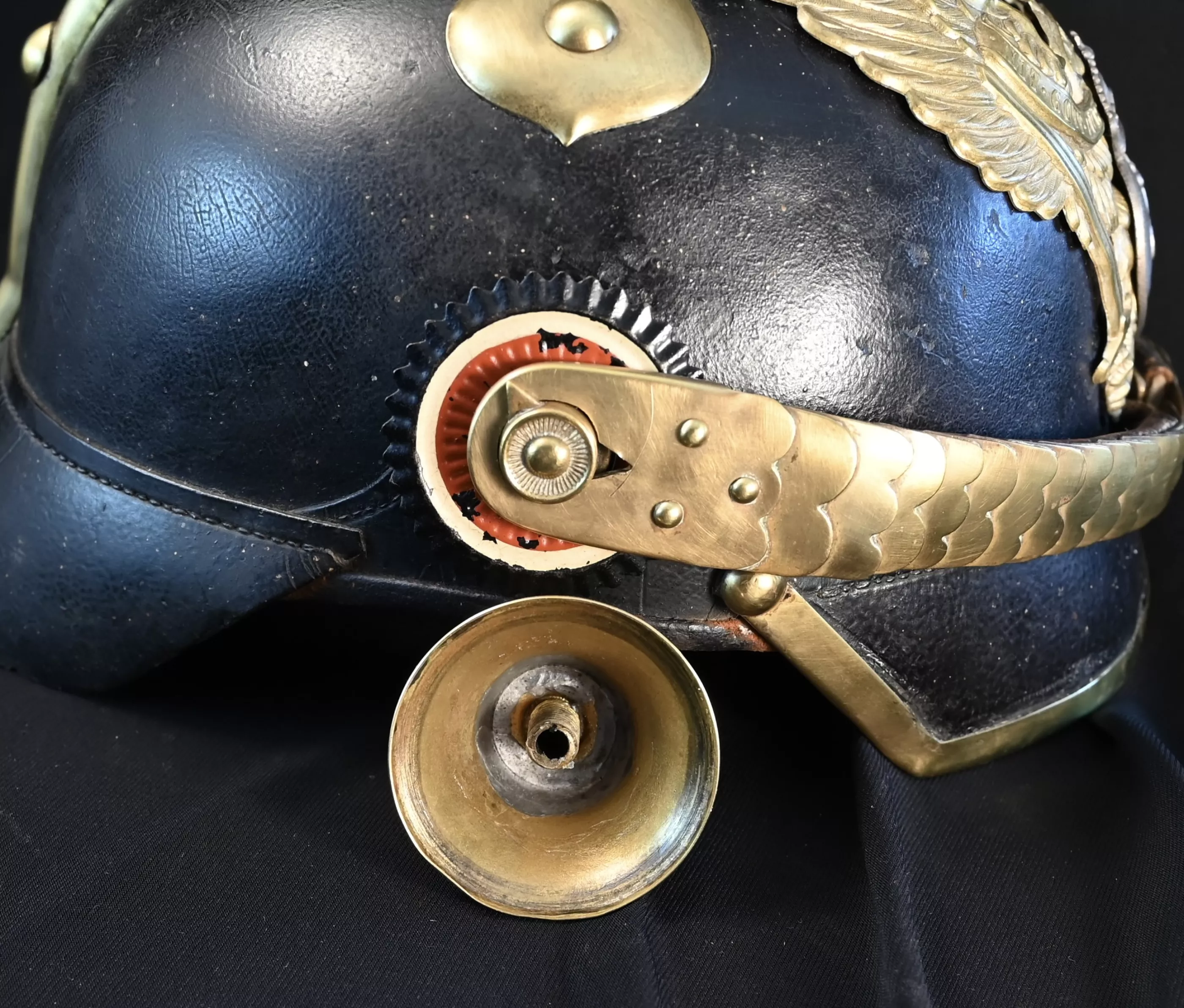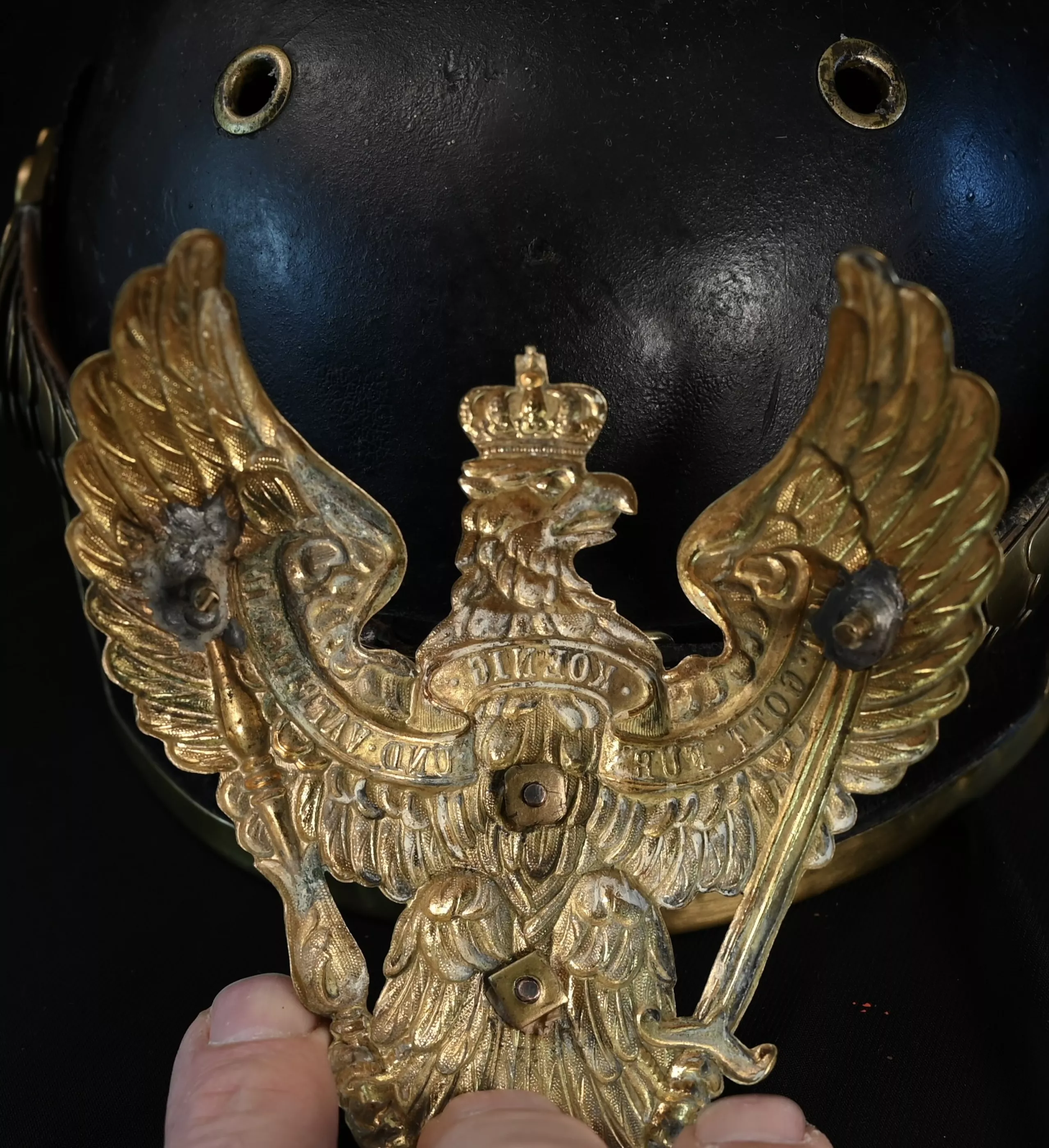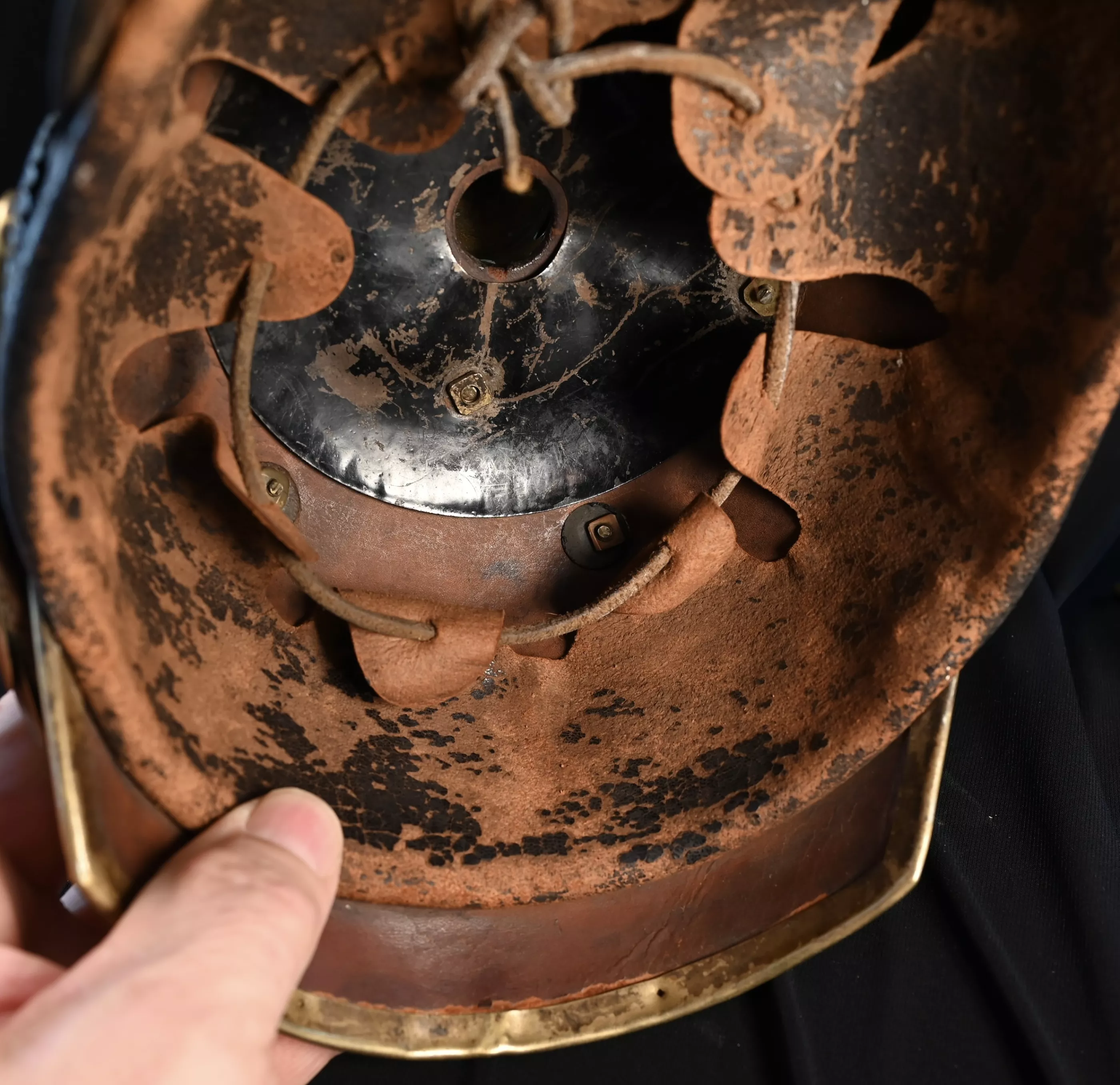 Black Laquered leather helmet body in excellent overall condition. Lacquer remains smooth with no defaults. Both visors are firmly stitched, front one is the square type for Cavalry. Beautiful brass trim with the Dragoon style Cross base and typical spike top. Base retained with 4 round brads. Spike is removable to be fited with a trichter and plume for parade. Dragoon back spine.