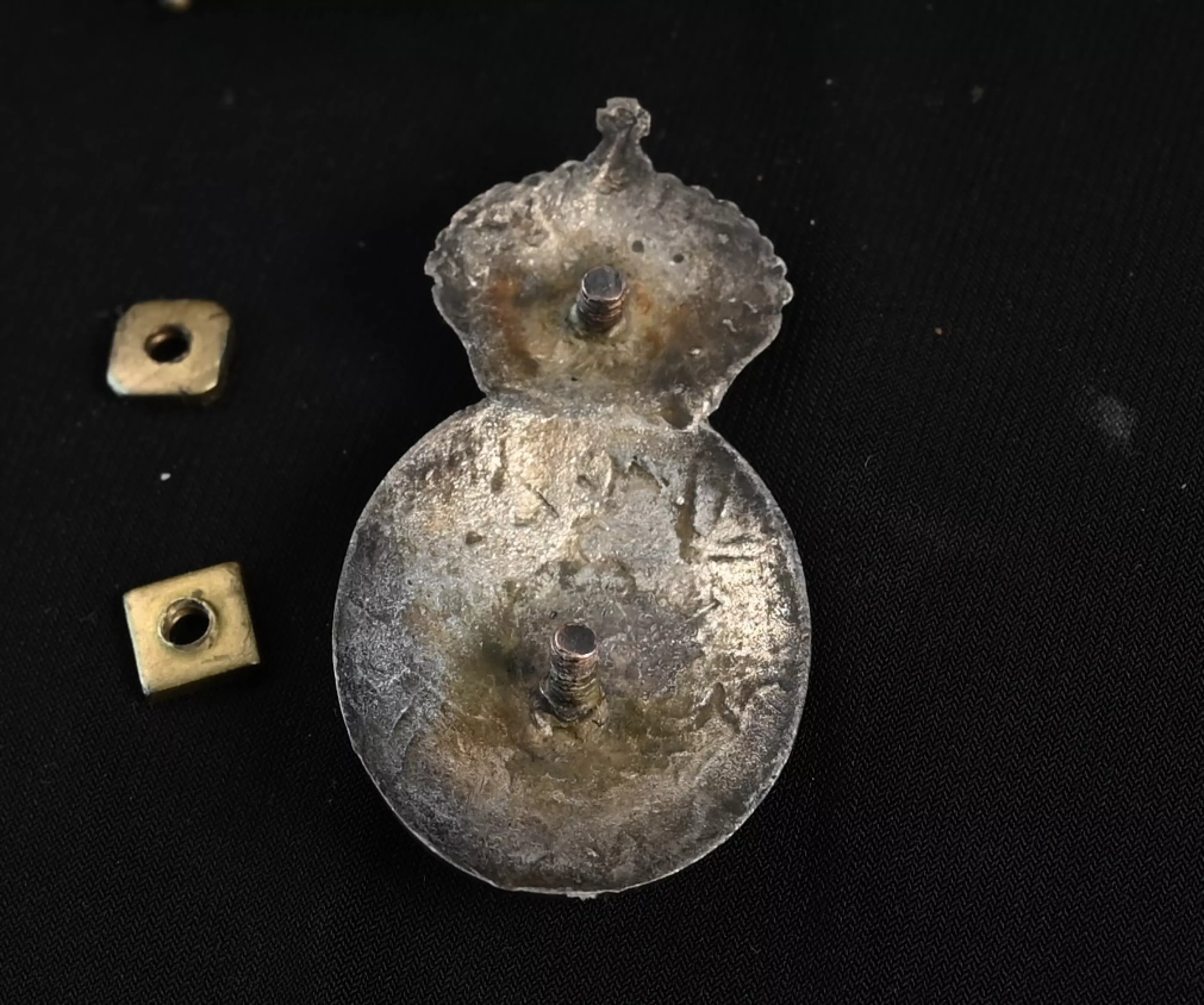 The front plate is the prussian dragoon eagle with the Vaterland bandeau retained to the helmet with screws and nuts through "grometed" holes. No extra holes in helmet body. Plate fit the helmet well. In the center of the eagles' breast is the silver "Brandenburg Electors" medalion that was given to this Regiment in June of 1913. The center of the crowned medalion presents the Scepter of the grand Electors. The medalion is screwed to the Eagle's breast.