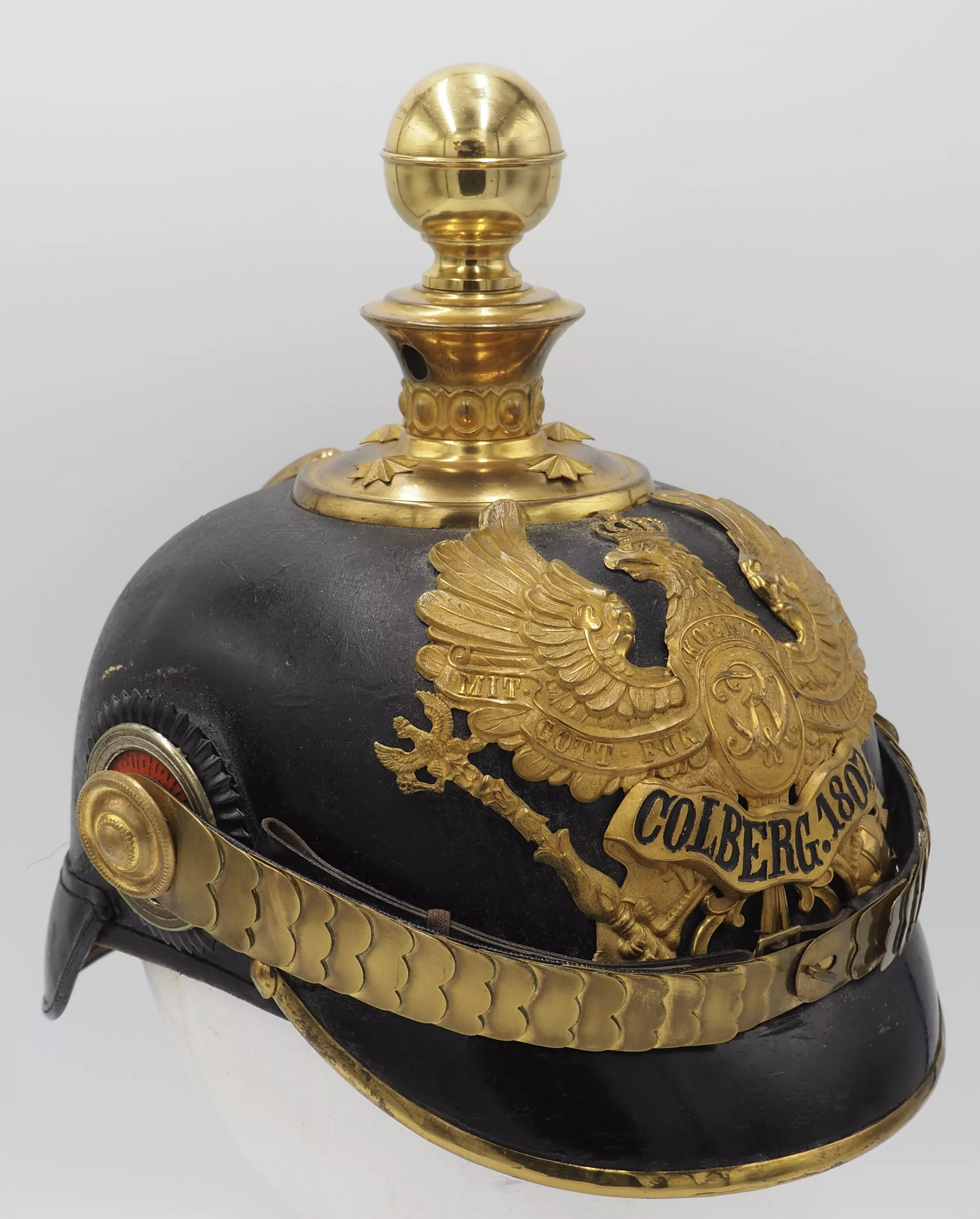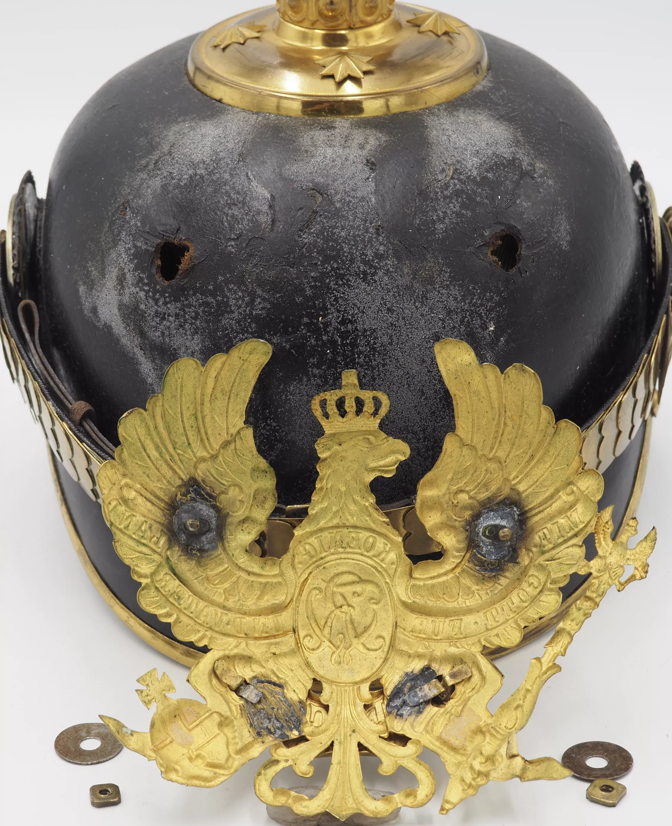 Round spike base with star retainers. Artillery ball finial that is removable. Rounded chinscales on rosettes. Officer Reichs and Prussian cockades. This is an EXTREMELY rare helmet. Wonderful and 100% original piece. Amazing condition. Price discounted due to damage to frontplate.