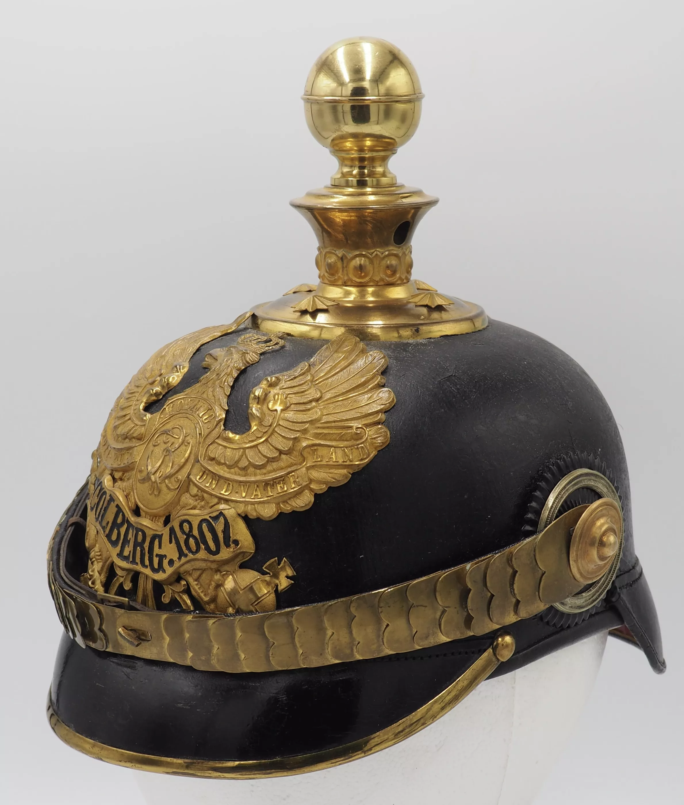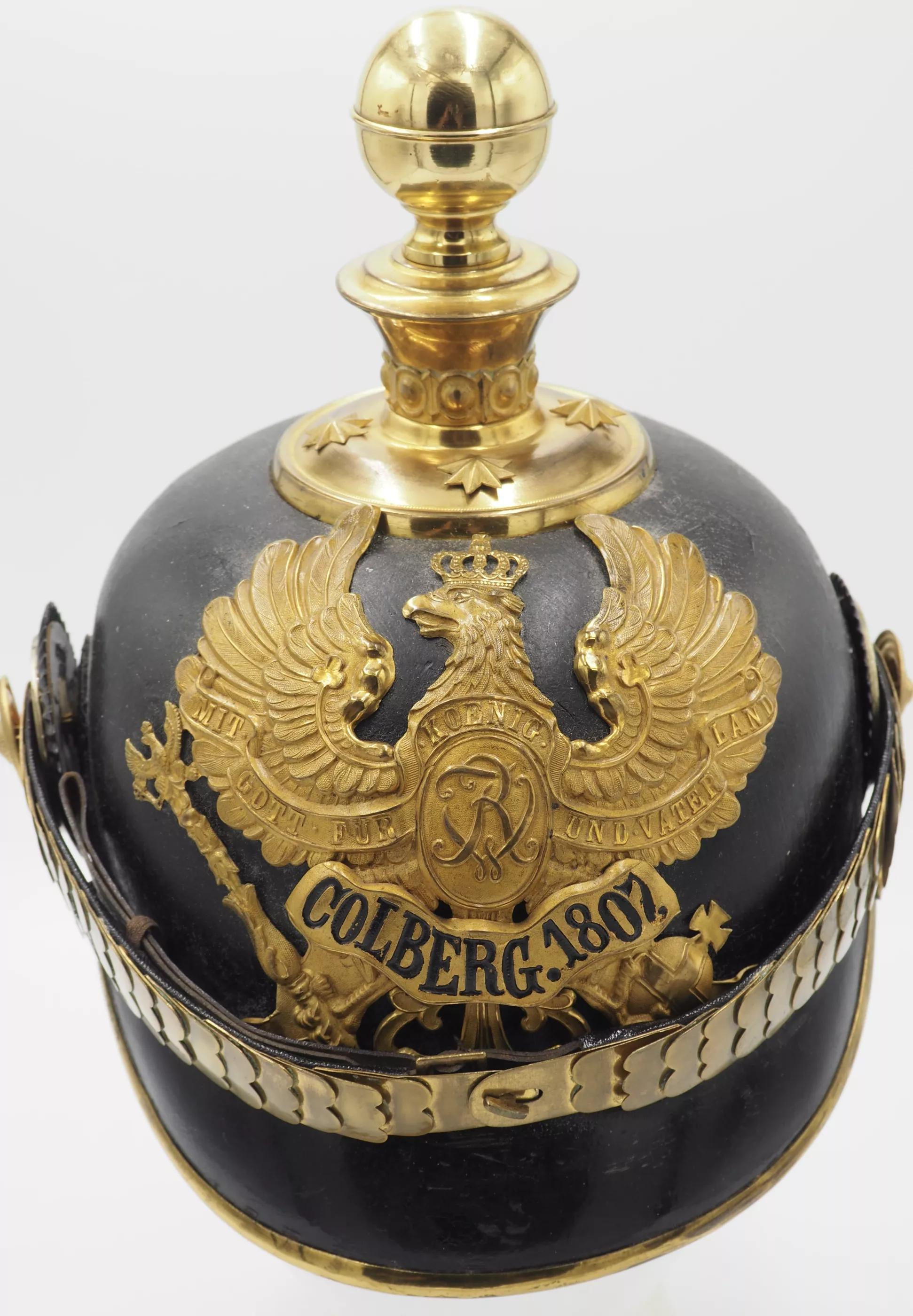The frontplate is the Prussian line Eagle with the FWR monogram on the eagles chest. On the lower leg portion on the is the banner “Colberg 1807” which commemorates the units service at the Siege of Colberg by Napoleon in 1807. The frontplate is extremely RARE as there was only 1 company of Foot Artillery wore this frontplate. There is damage noted, below the line that is covered by chinscales. The upper sharp ends of the banner are missing (see PHOTO). We assume that is was broken off when the field cover was removed. Although missing, it is not detractive to the helmet as it is hidden by the chinscale.