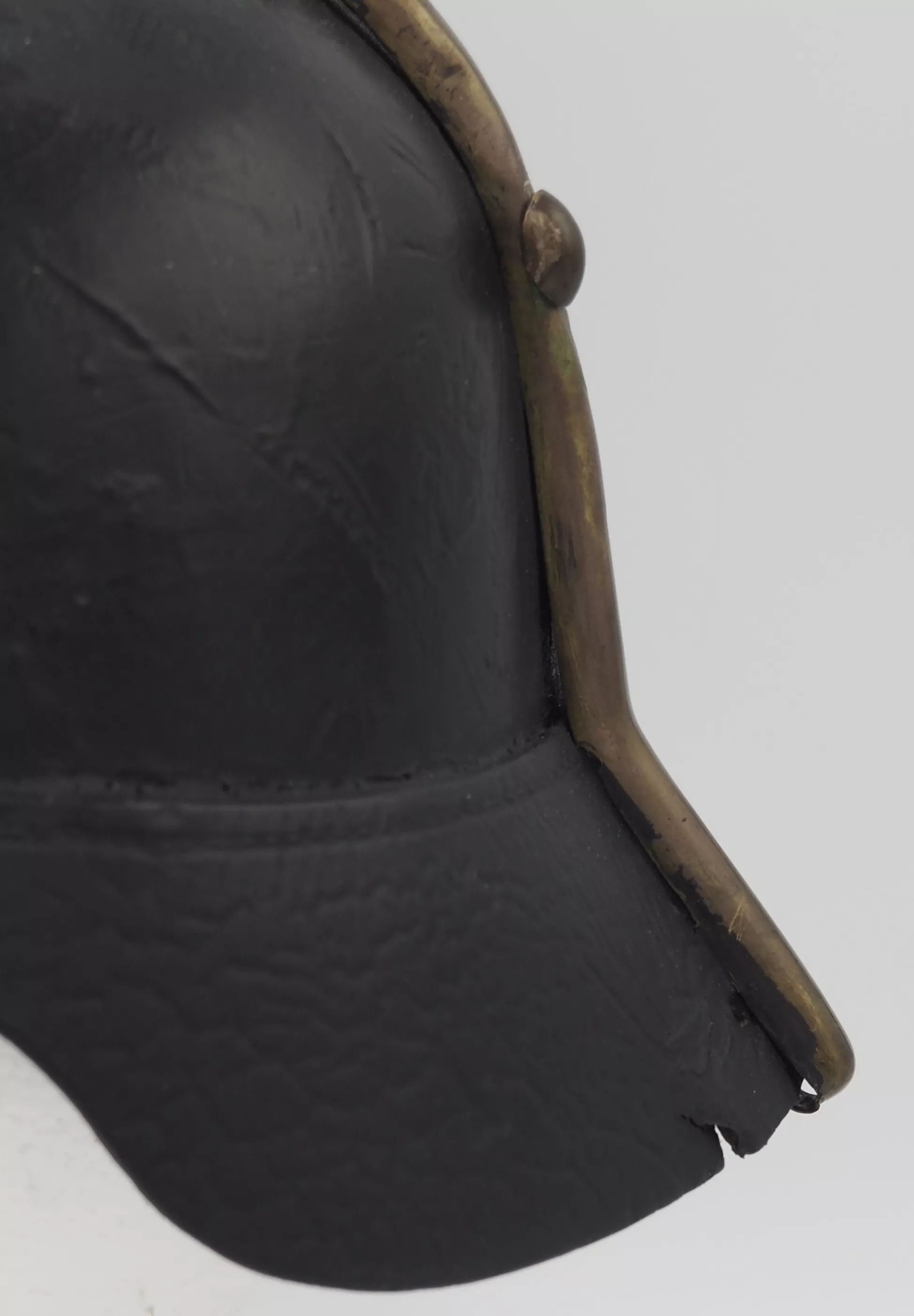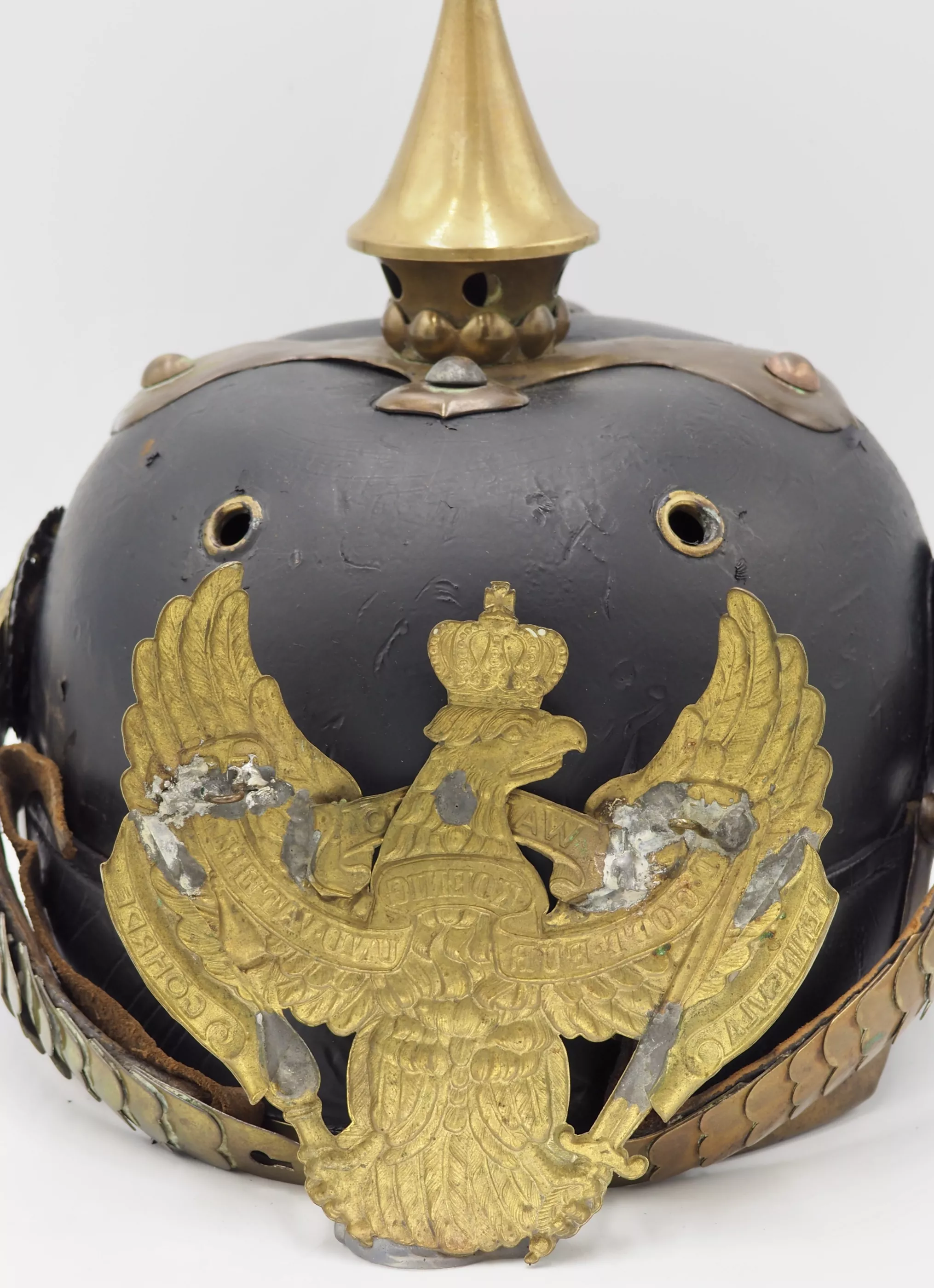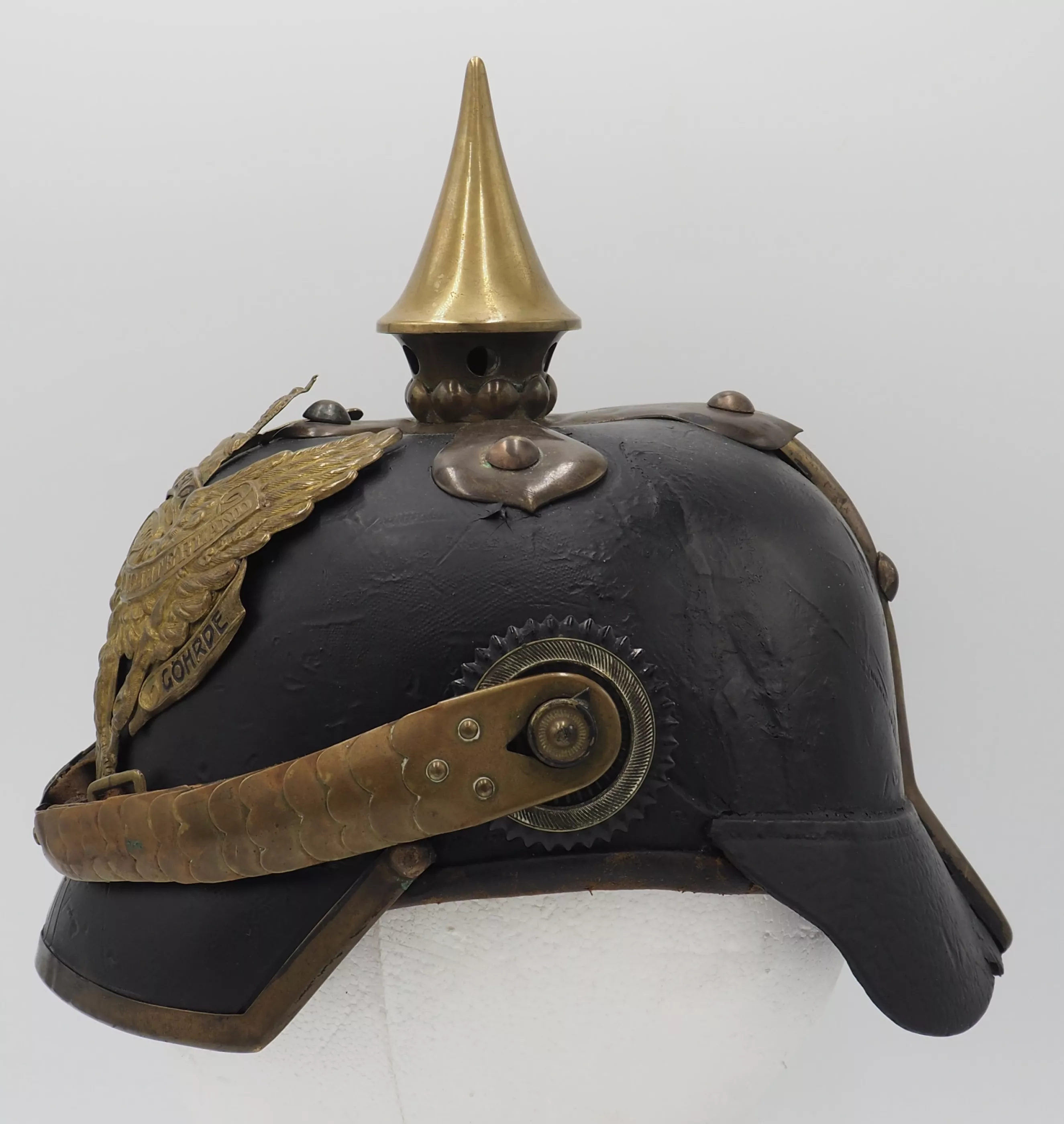 Prussian/Hannover 9th Dragoon Regiment (Dragoon Regiment Carl of Romania-1st Hannoverian) Enlisted Model 1895/99. The helmet has been left uncleaned/unpolished. Fine heavy leather helmet body with brass trim. The helmet body in excellent form and firm stitching. The lacquer finish is dull with age and has a repair tear on the left side (see photos). Interior has EM style leather tabbed liner that is in excellent condition. The helmet interior visors are plain leather and have no legible markings.