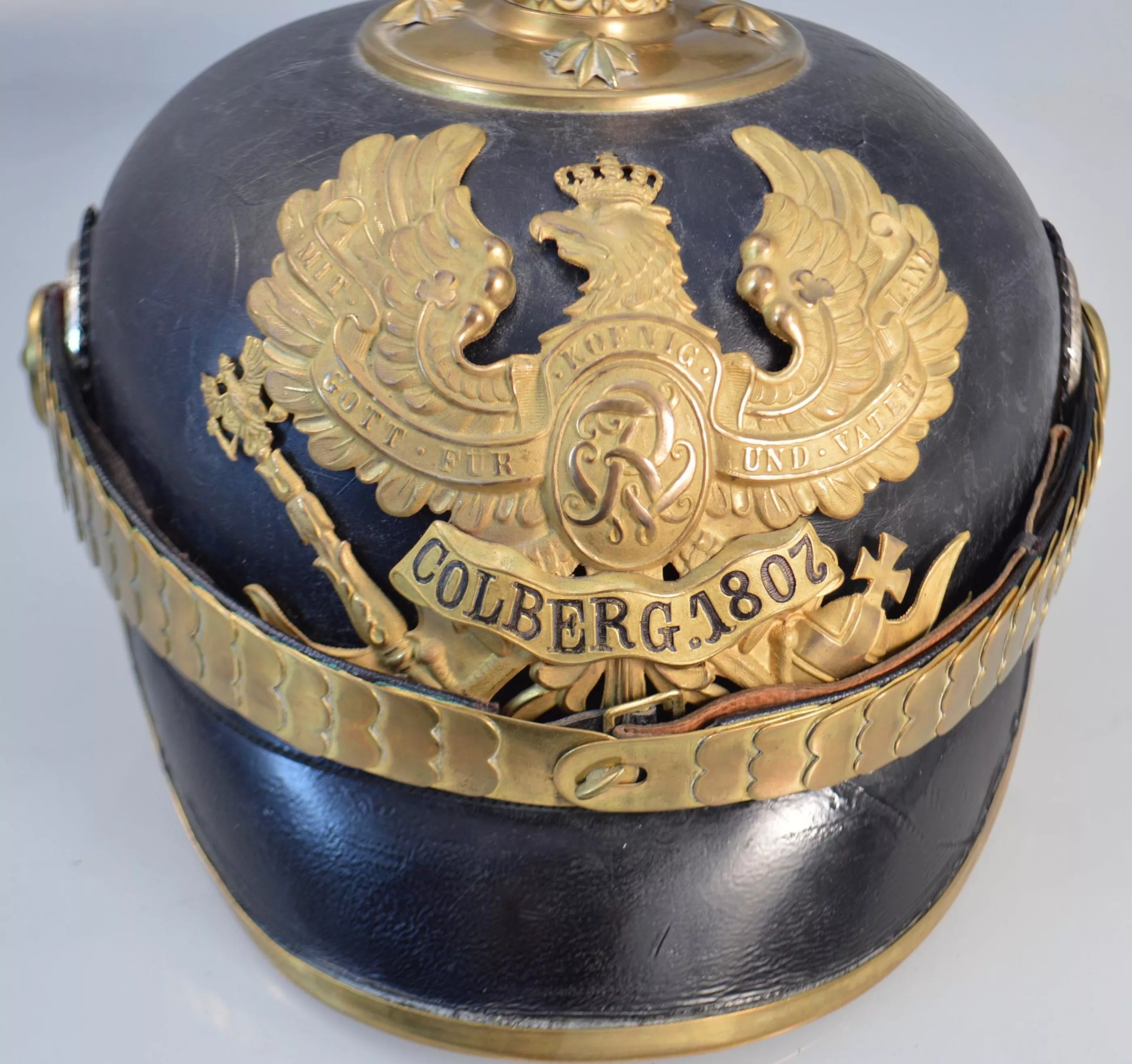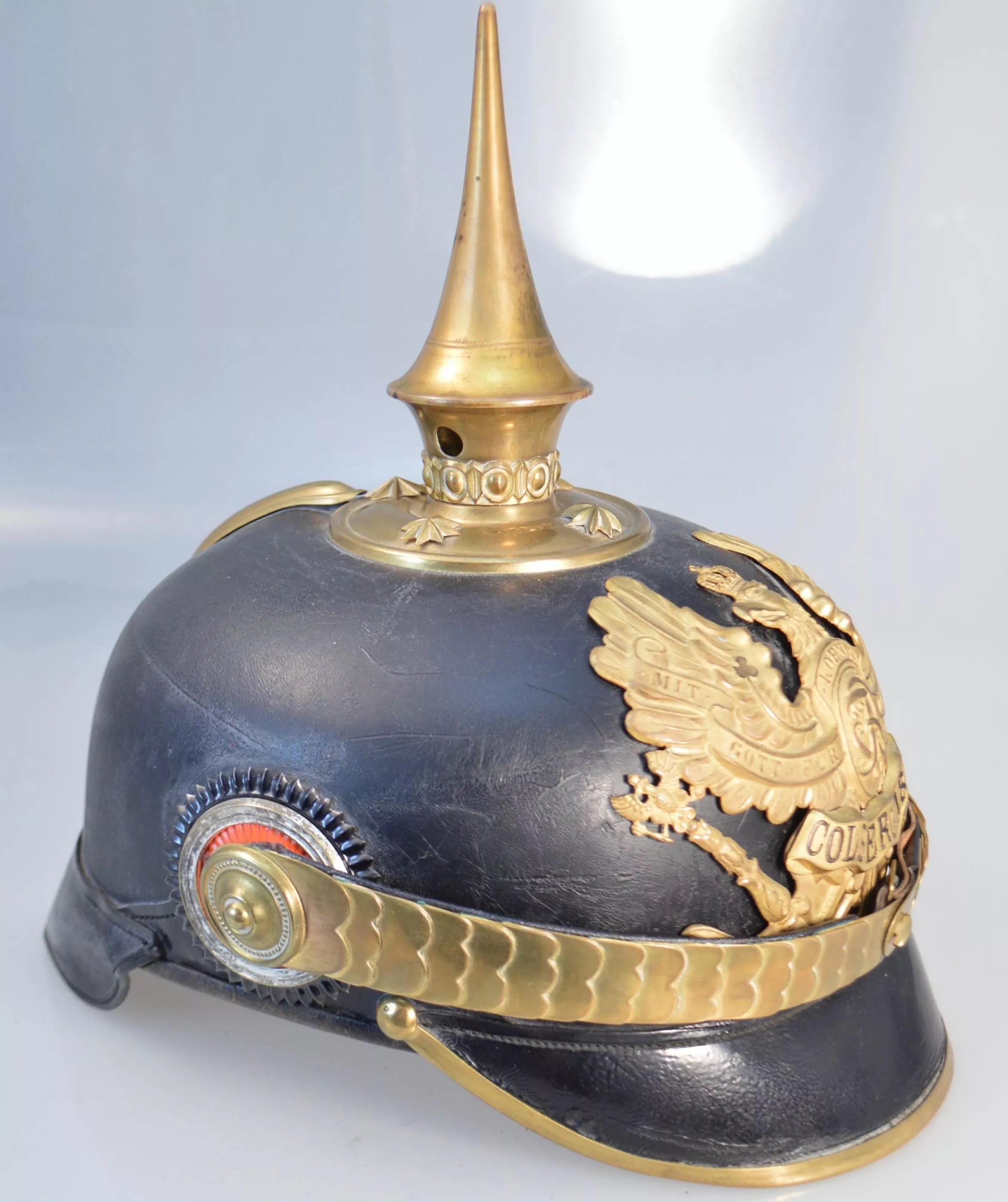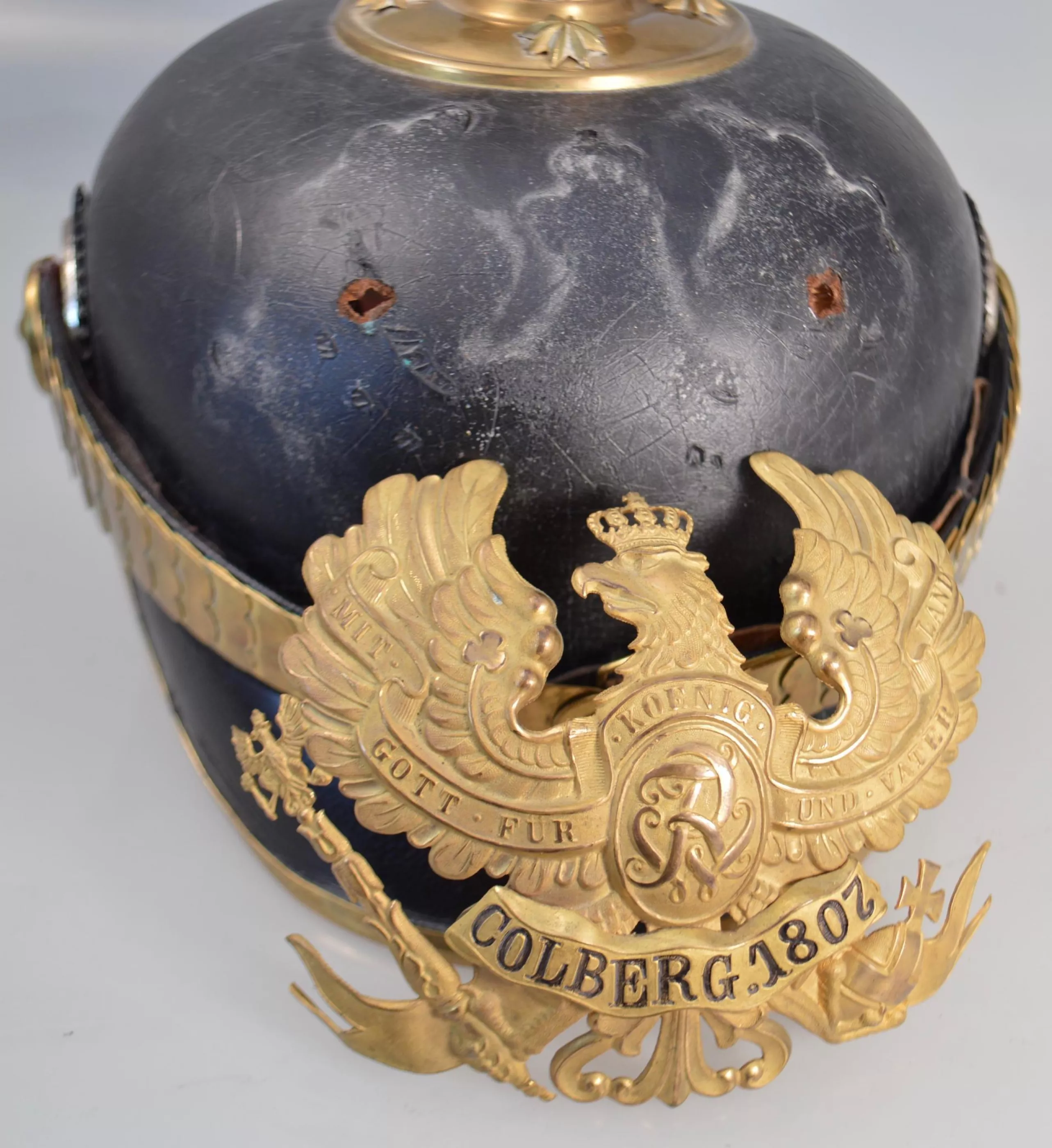 **RARE** Prussian 9th Grenadier (Colberg) Officer Model 1897 ( this style used until 1911 when it was replaced with a wide wing grenadier eagle). From the Rich Ames Collection. Beautiful and very rare helmet. Black lacquered leather body with round front visor and fine fire gilt trim. Helmet has perfect form and firm stitching. Exterior lacquer has near perfect finish. Interior has sweat leather and silk headliner in excellent overall condition but shows genuine wear. Inner visors colored red and green. No extra holes in helmet body. Round spike base with 4 gilt stars at the spike base. Frontplate is the Prussian Line Eagle with the round FWR monogram in the center and below it banner "Colberg 1807" for commemoration of the successful resistance of Napoleons siege of Colberg in 1807. Original Reichs and Prussian Officer cockades. Flat gilt chinscales and rosettes. Beautiful and untouched helmet. Absolutely 100% original, beautiful and untouched helmet from an old collection. Near Mint. Seldom seen today. In a German Militaria Auction a helmet like this sold for over $6000 (including bid. Commission and exchange rate). Great buy in today’s market.