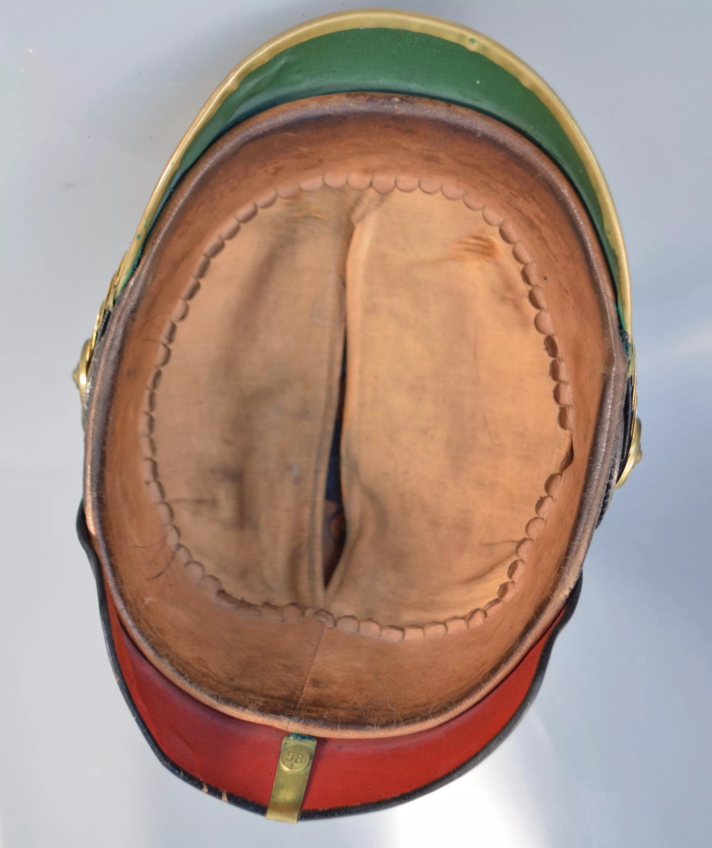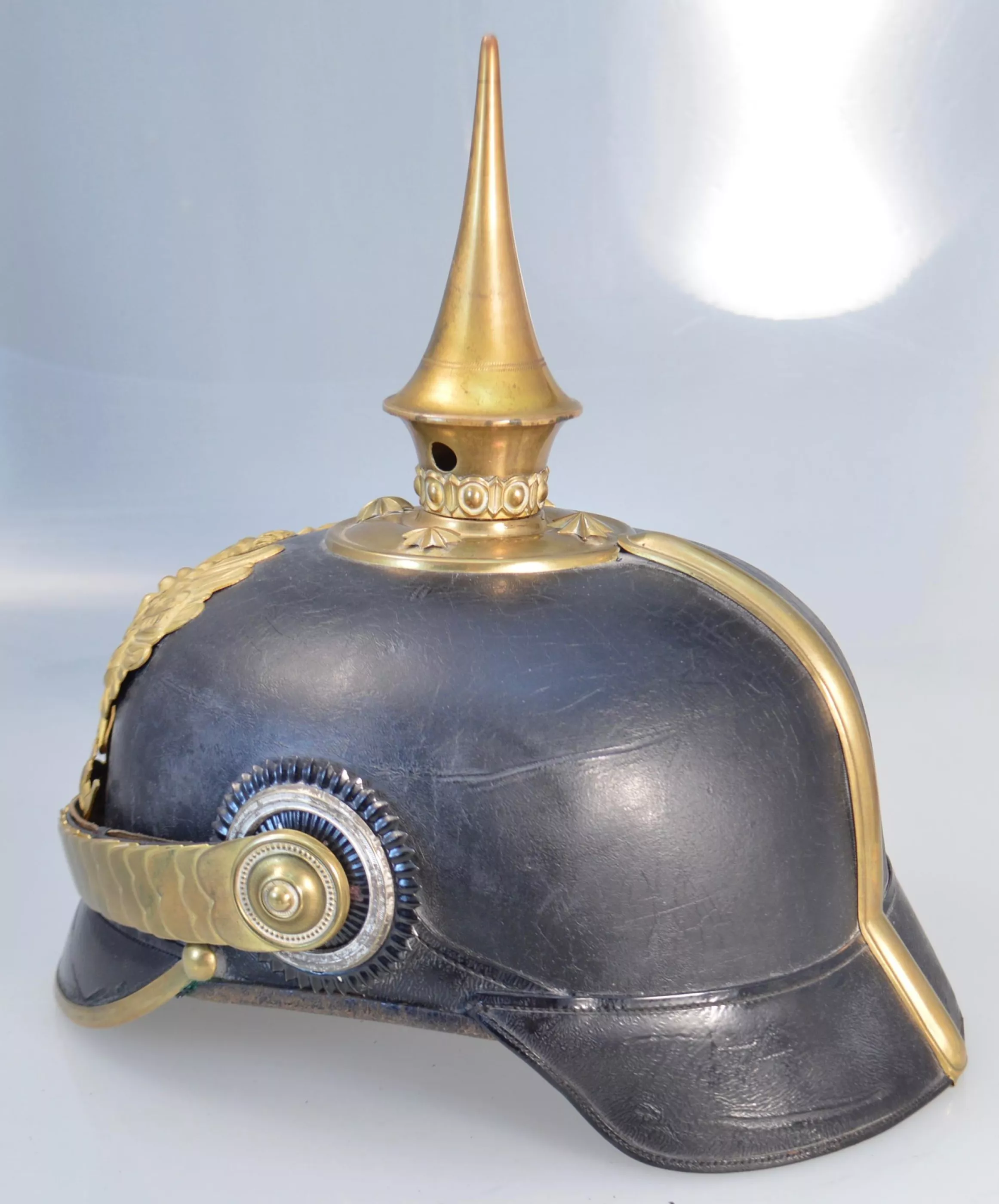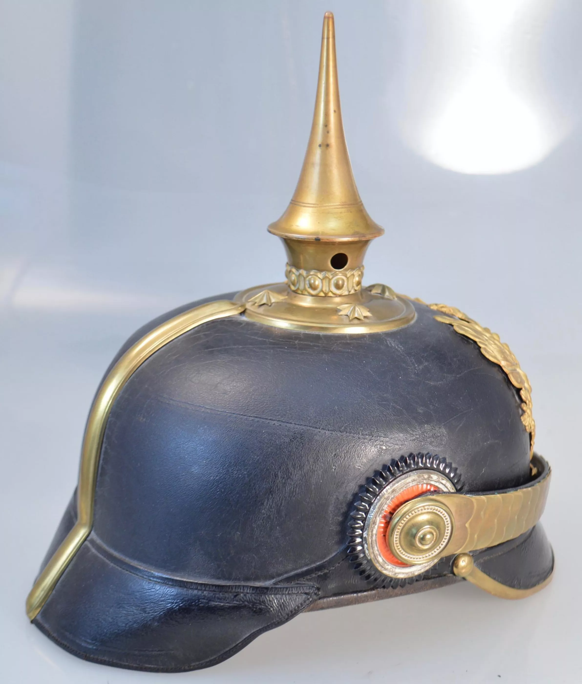 **RARE** Prussian 9th Grenadier (Colberg) Officer Model 1897 ( this style used until 1911 when it was replaced with a wide wing grenadier eagle). From the Rich Ames Collection. Beautiful and very rare helmet. Black lacquered leather body with round front visor and fine fire gilt trim. Helmet has perfect form and firm stitching. Exterior lacquer has near perfect finish. Interior has sweat leather and silk headliner in excellent overall condition but shows genuine wear. Inner visors colored red and green. No extra holes in helmet body. Round spike base with 4 gilt stars at the spike base. Frontplate is the Prussian Line Eagle with the round FWR monogram in the center and below it banner "Colberg 1807" for commemoration of the successful resistance of Napoleons siege of Colberg in 1807. Original Reichs and Prussian Officer cockades. Flat gilt chinscales and rosettes. Beautiful and untouched helmet. Absolutely 100% original, beautiful and untouched helmet from an old collection. Near Mint. Seldom seen today. In a German Militaria Auction a helmet like this sold for over $6000 (including bid. Commission and exchange rate). Great buy in today’s market.