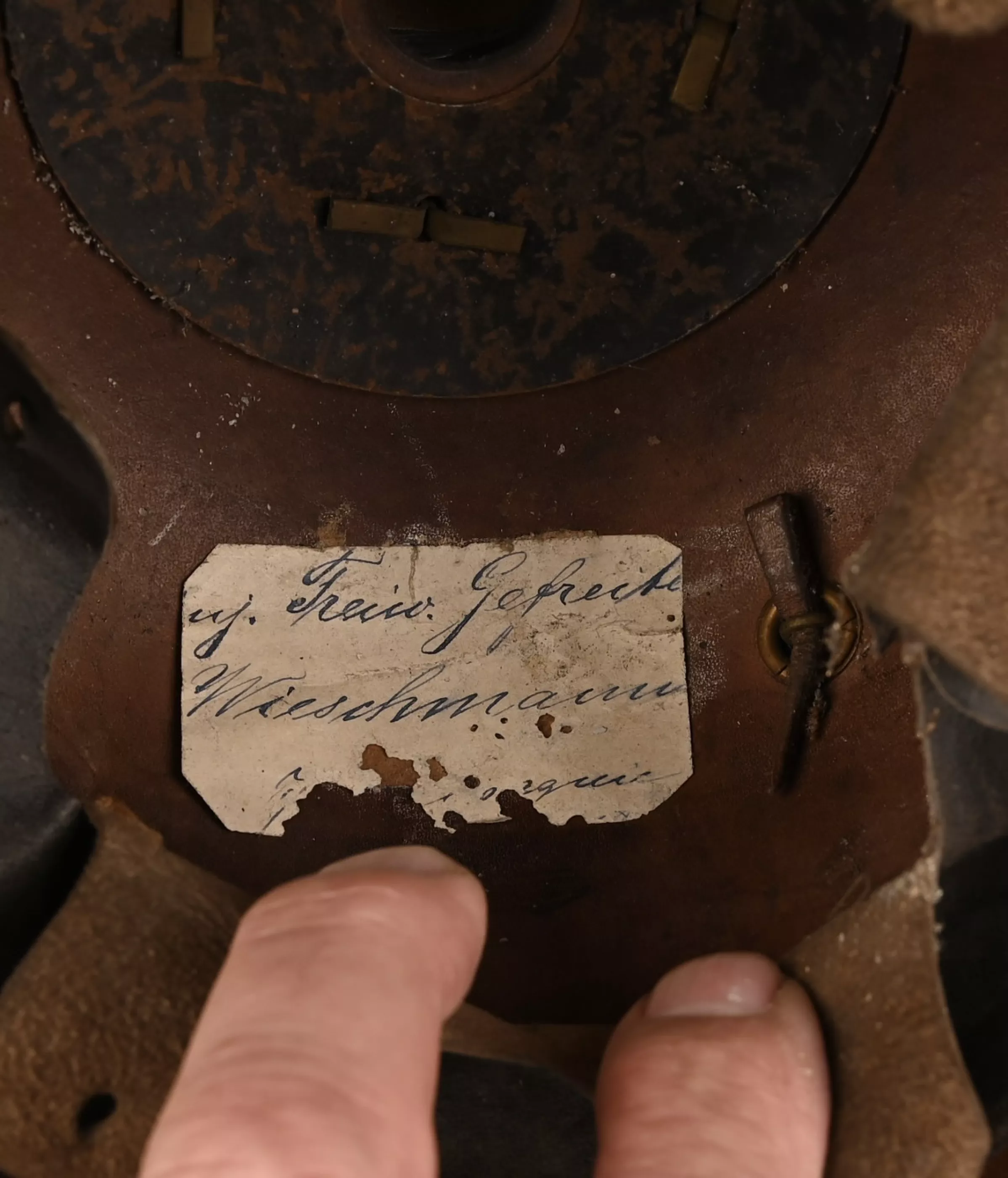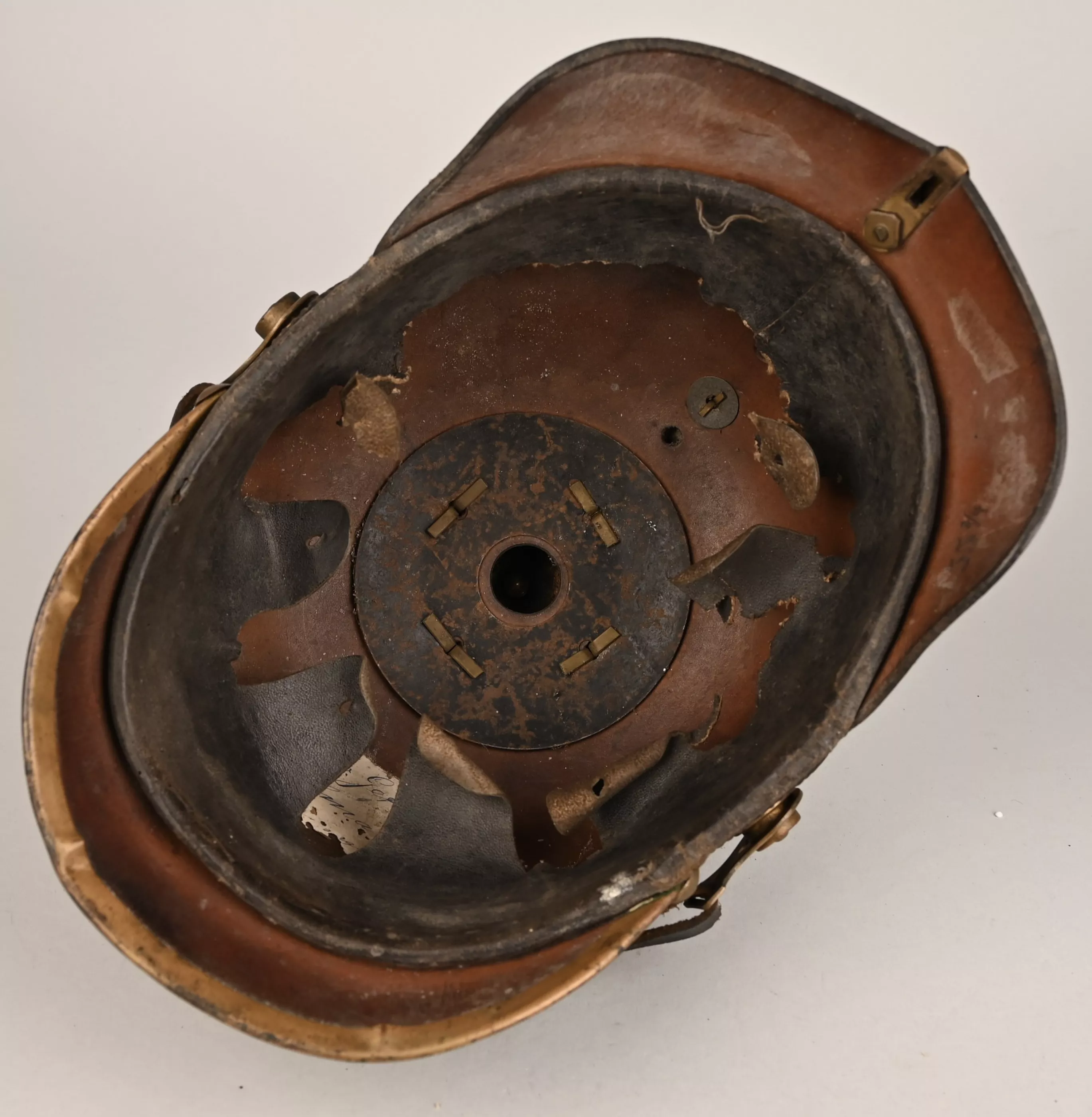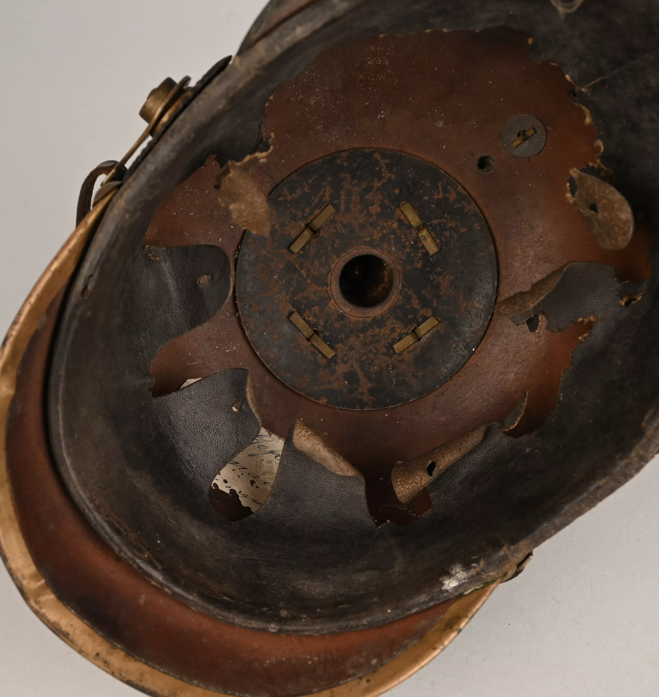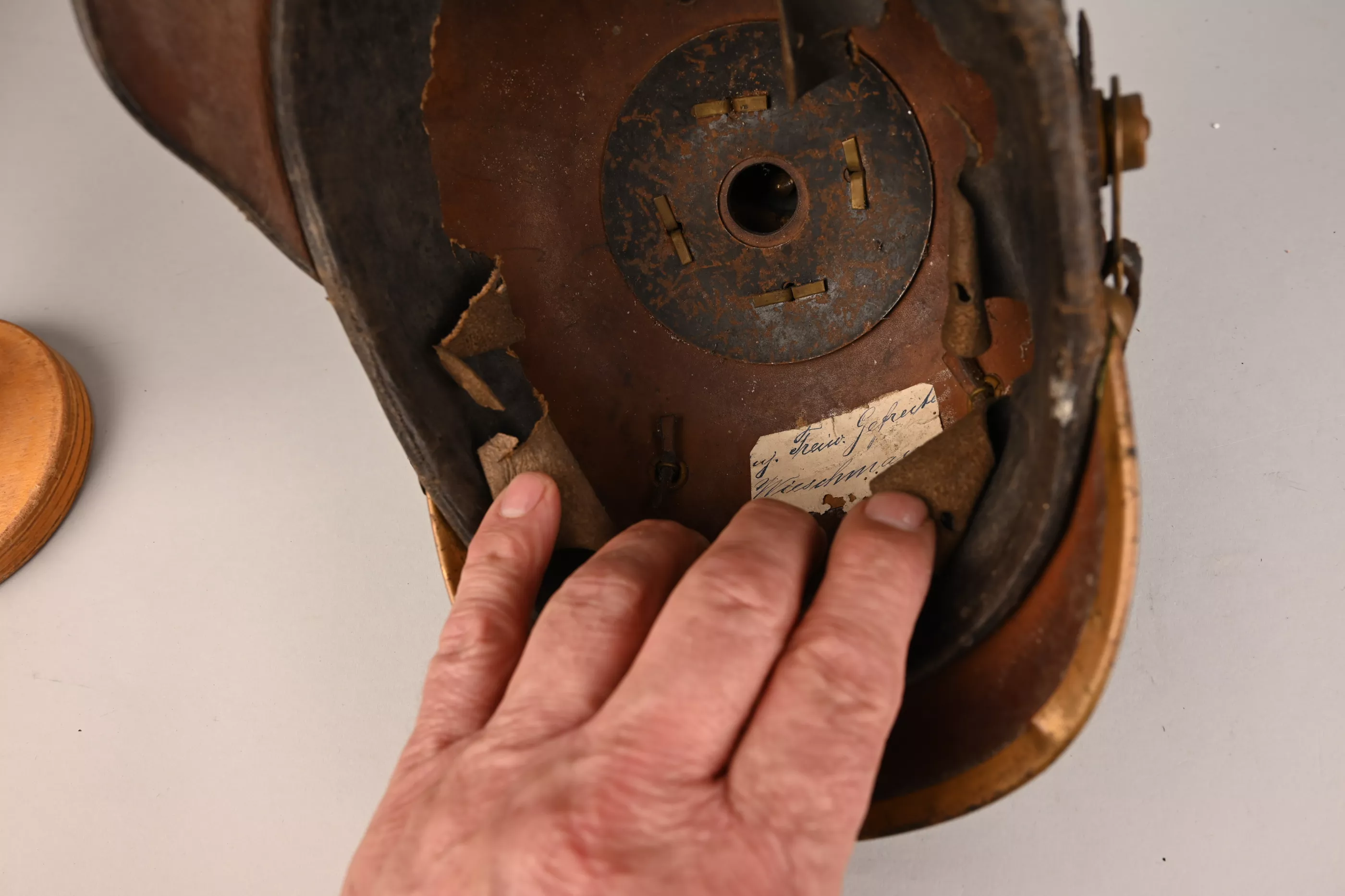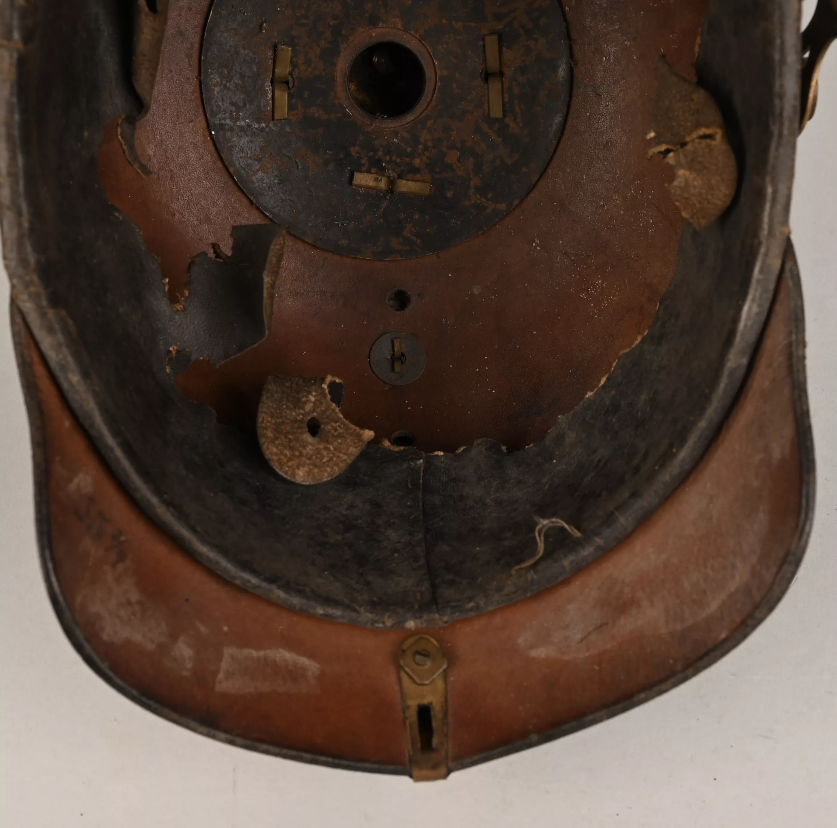Round spike base maintained by four split brads. Brass spike that untwists as it should to adapt a Parade Trichter/Plume. Brass back spine with proper ventilation slide. Both Cockade (Reichs and Prussian) are present along with the original leather strap - a seldom occasion on its own. Liner is the black dyed type of pre-war manufacture size "55 1/2" with some tongs missing (probably mousse food). The helmets also has the name tag of the wearer inside "Ein. Frew. Gefreiter Wischmann". A very nice exemple in near mint condition.