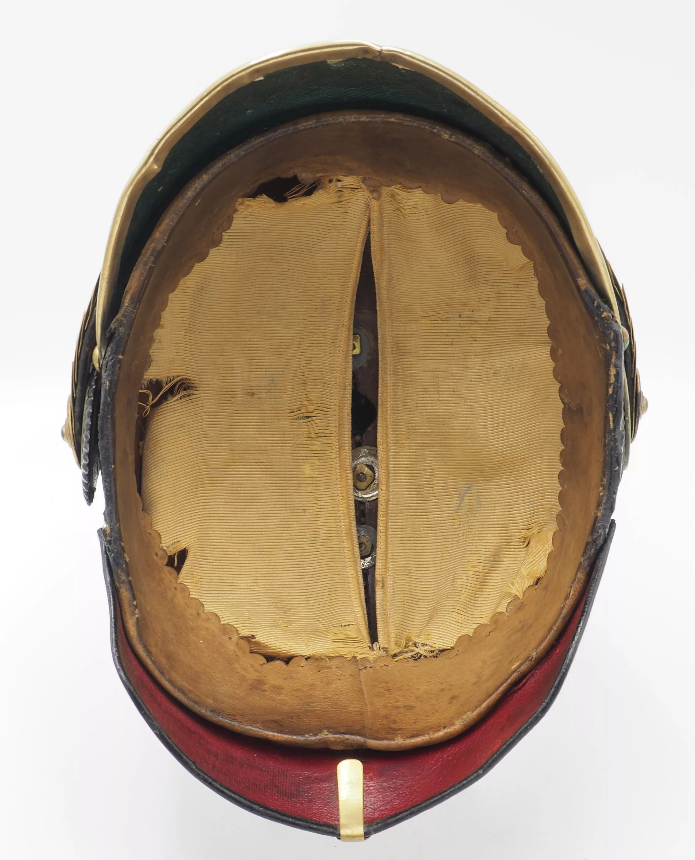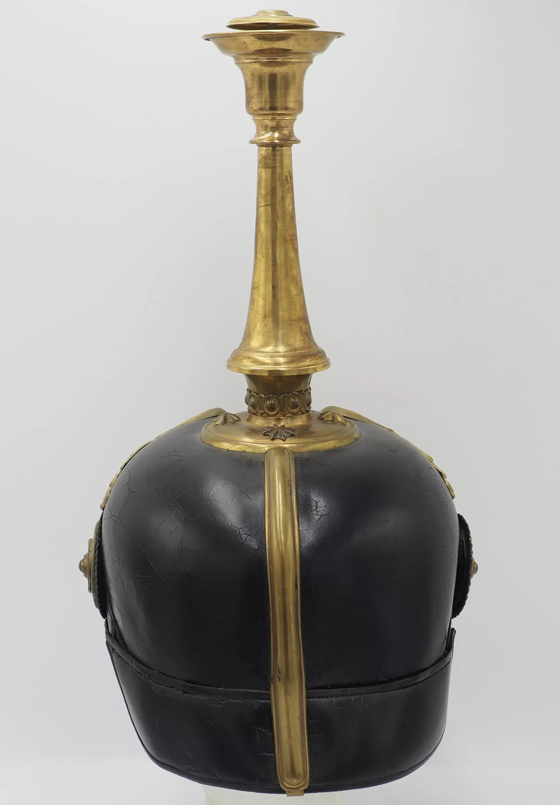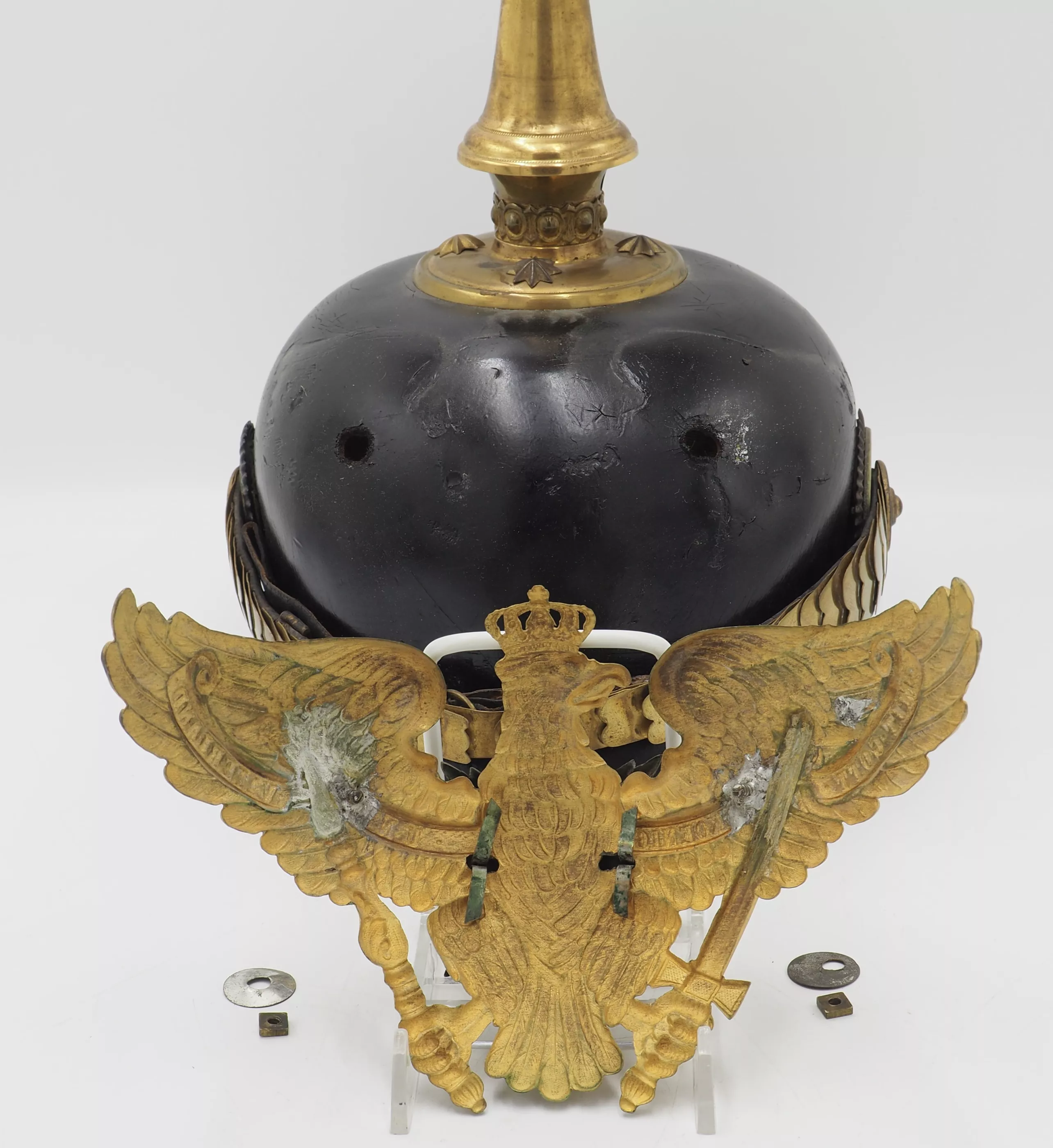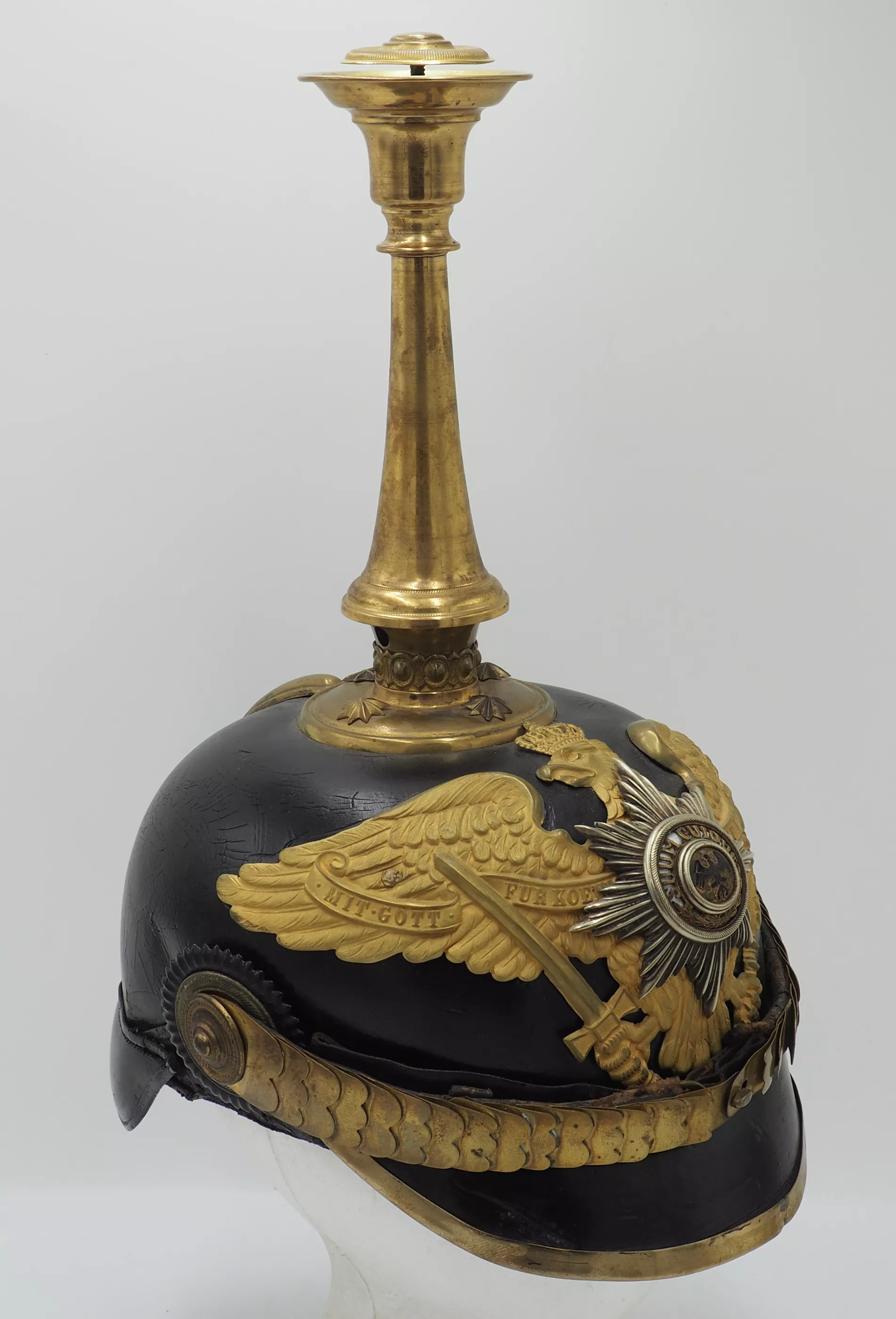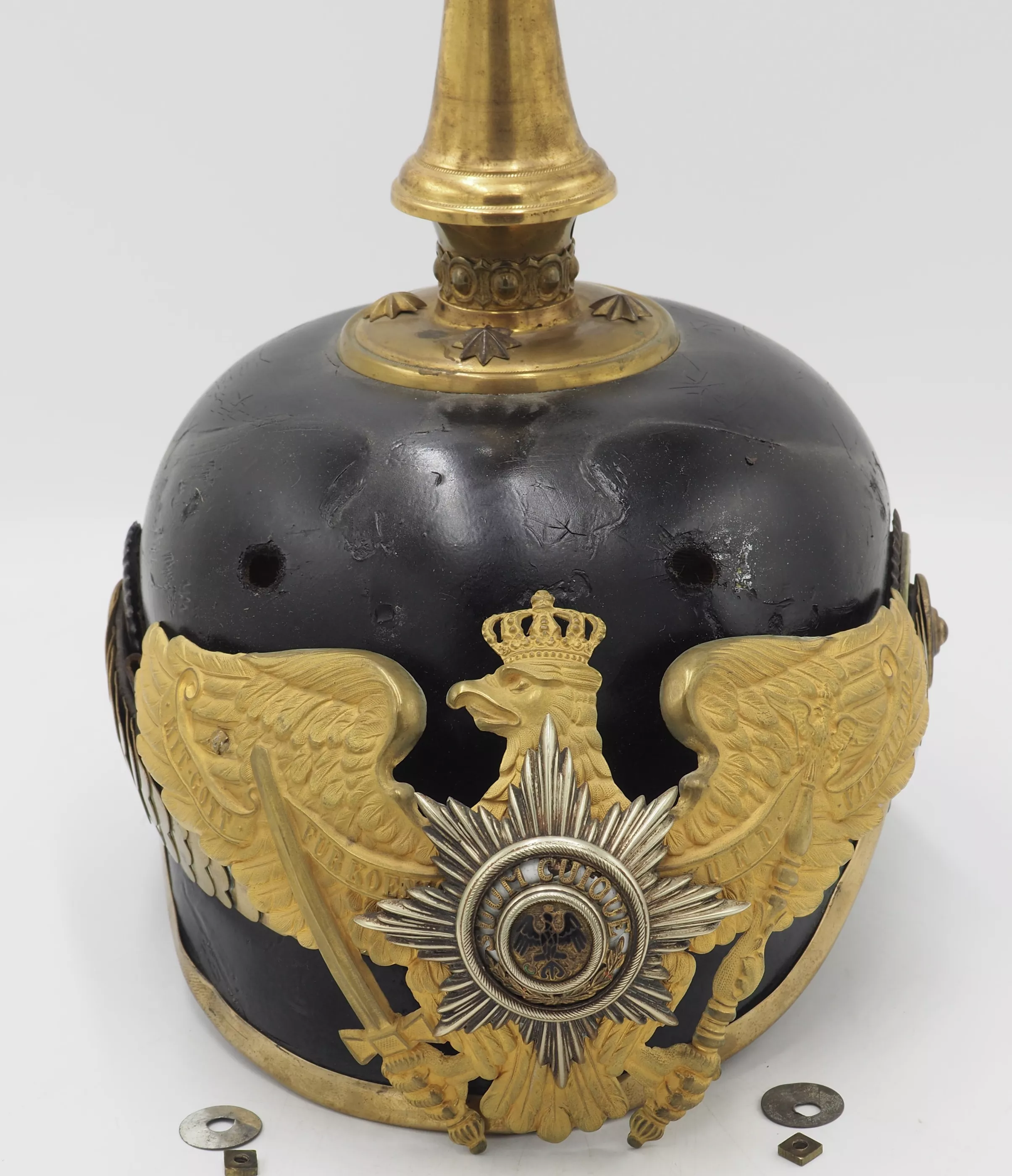 Prussian Guard Infantry and Grenadier Regiments Officer to Parade (white Yak hair plume) -Model 1897. Black leather helmet body with fire gilt metal trim. The leather helmet body in perfect condition with firm stitching. The exterior lacquer in excellent condition with a bright finish and no lacquer loss. The helmet body has NO extra holes. The helmet interior has standard sweat leather and silk headliner in good condition but shows use and wear.