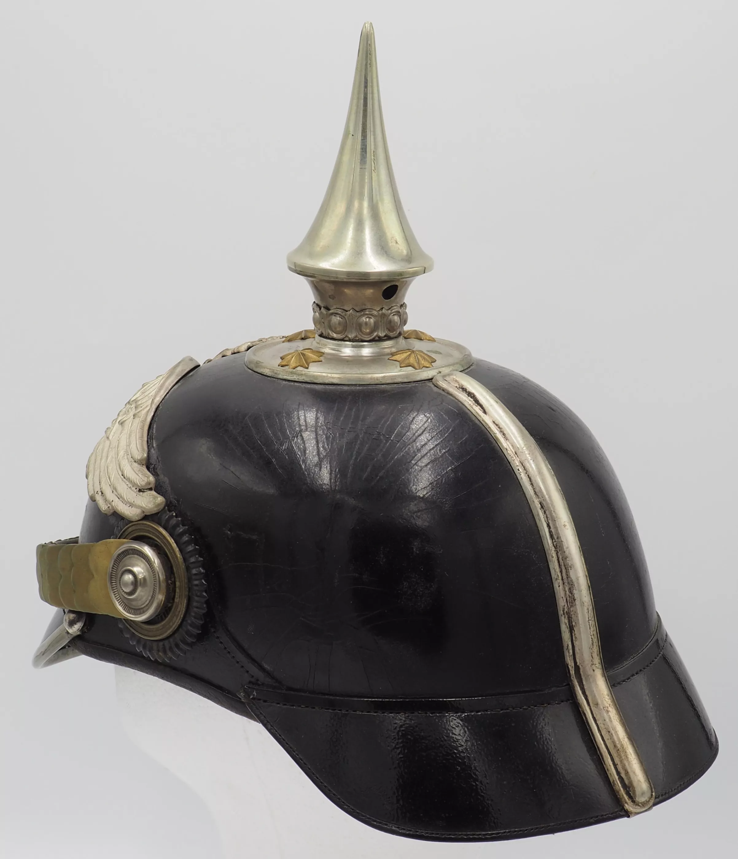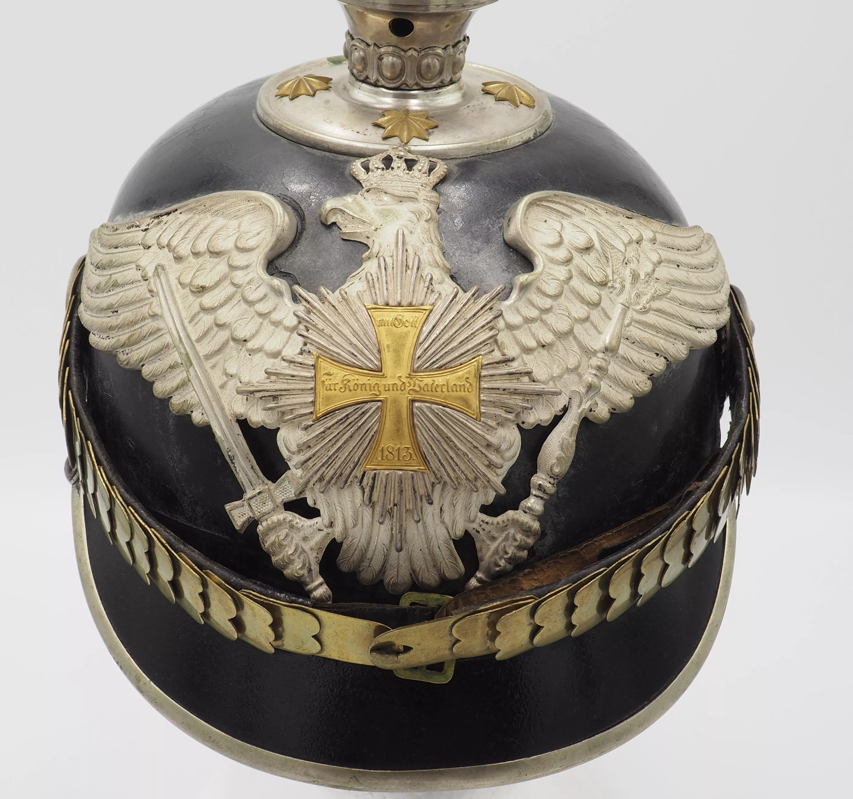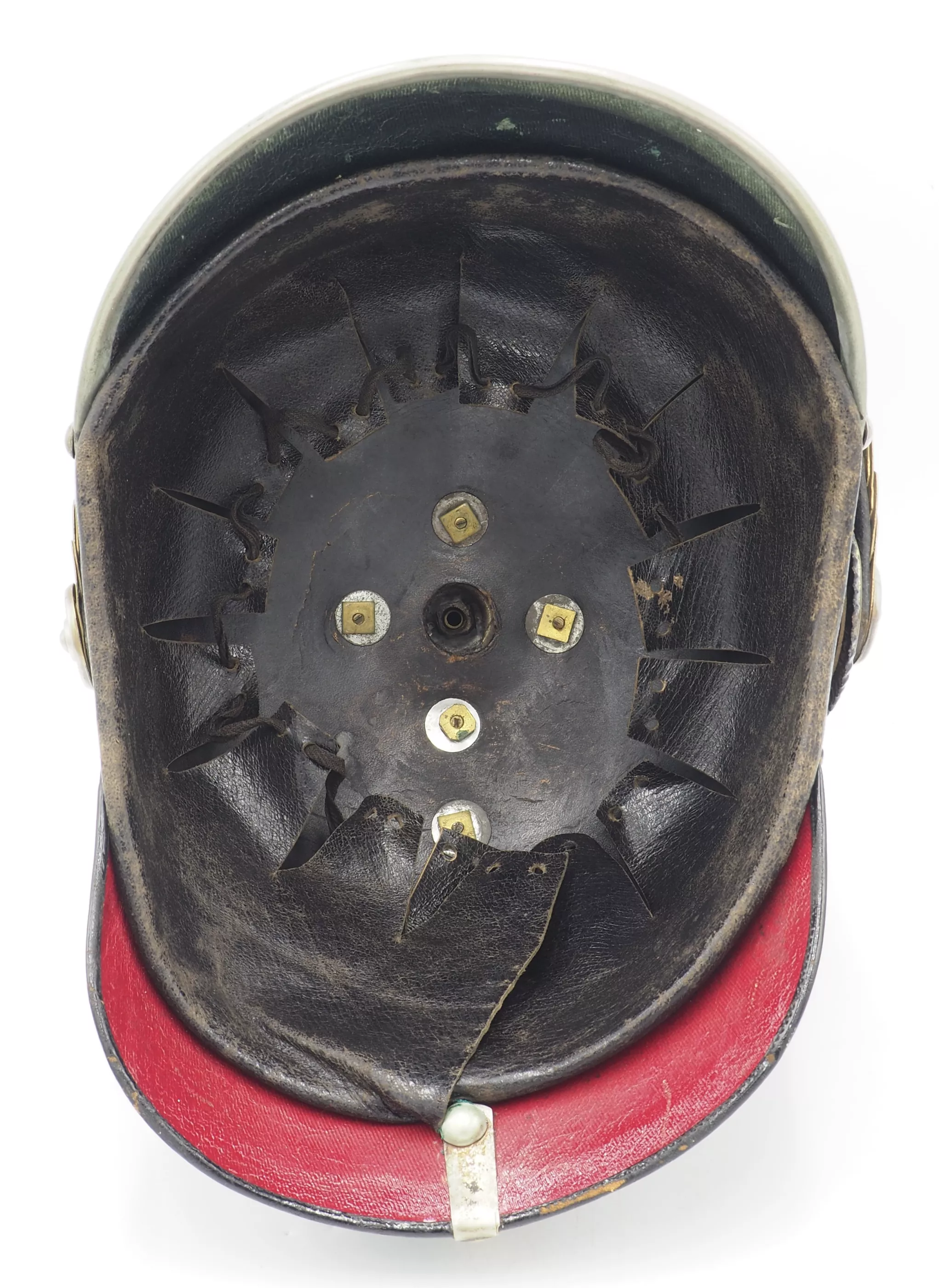 Prussian Guard Landwehr Officer from the 3rd and 5th Guard Regiments, Guard Fusilier Regiment, Guard Eisenbahn Regiment, or the Guard Pioneer Battalion – Model 1871. From the Rich Ames collection. Black lacquered leather helmet body with silver metal trim. The helmet body has excellent form and firm stitching. The exterior lacquer in excellent condition. No extra holes in the helmet body.
