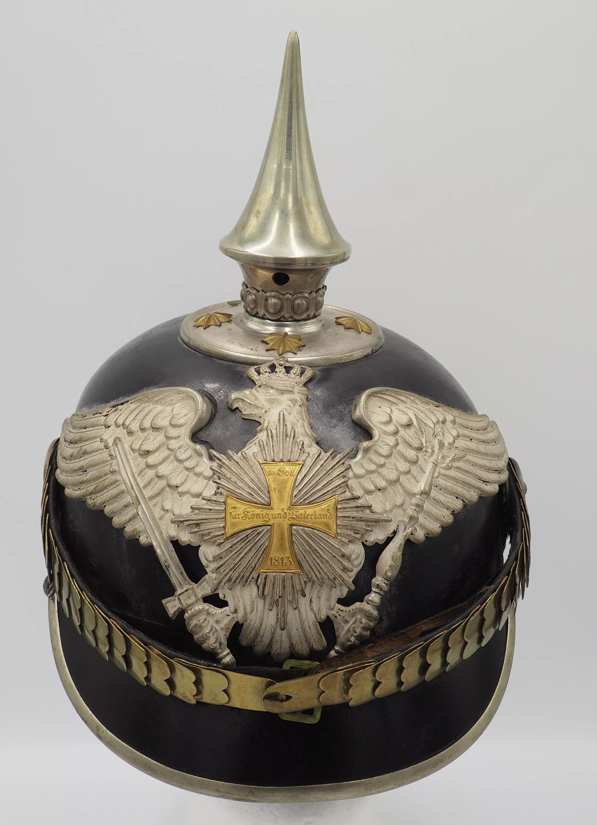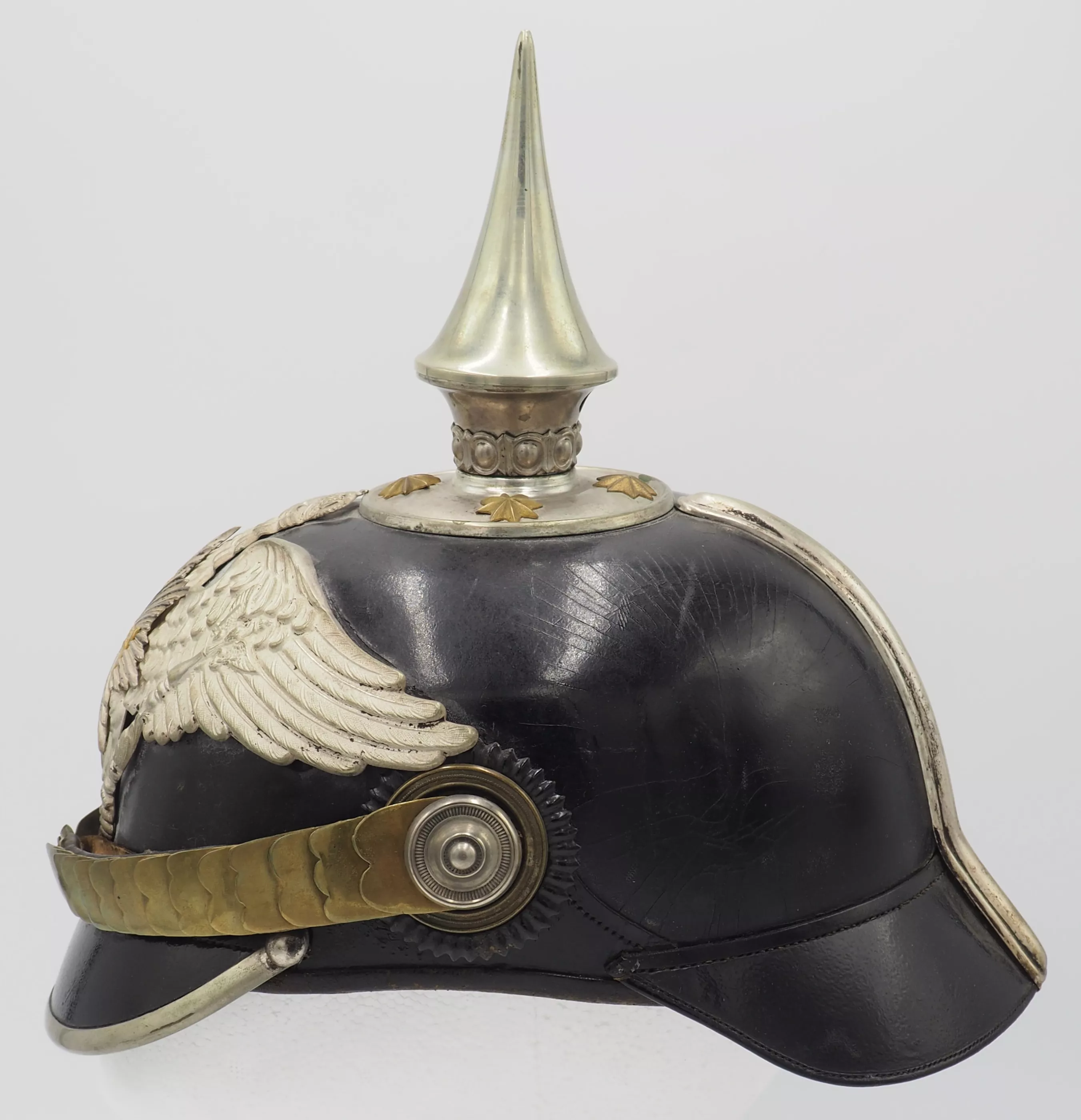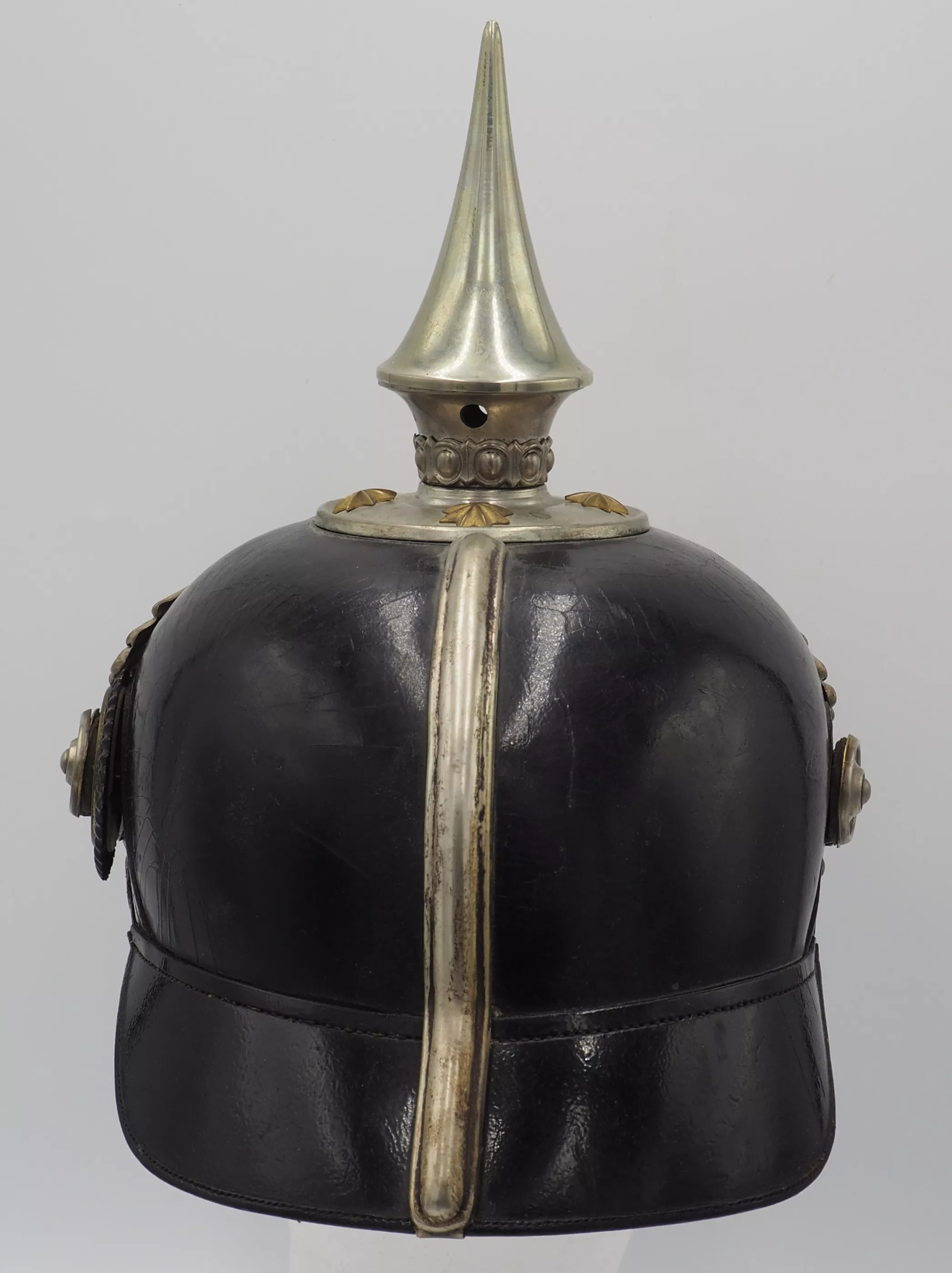 Prussian Guard Landwehr Officer from the 3rd and 5th Guard Regiments, Guard Fusilier Regiment, Guard Eisenbahn Regiment, or the Guard Pioneer Battalion – Model 1871. From the Rich Ames collection. Black lacquered leather helmet body with silver metal trim. The helmet body has excellent form and firm stitching. The exterior lacquer in excellent condition. No extra holes in the helmet body.
