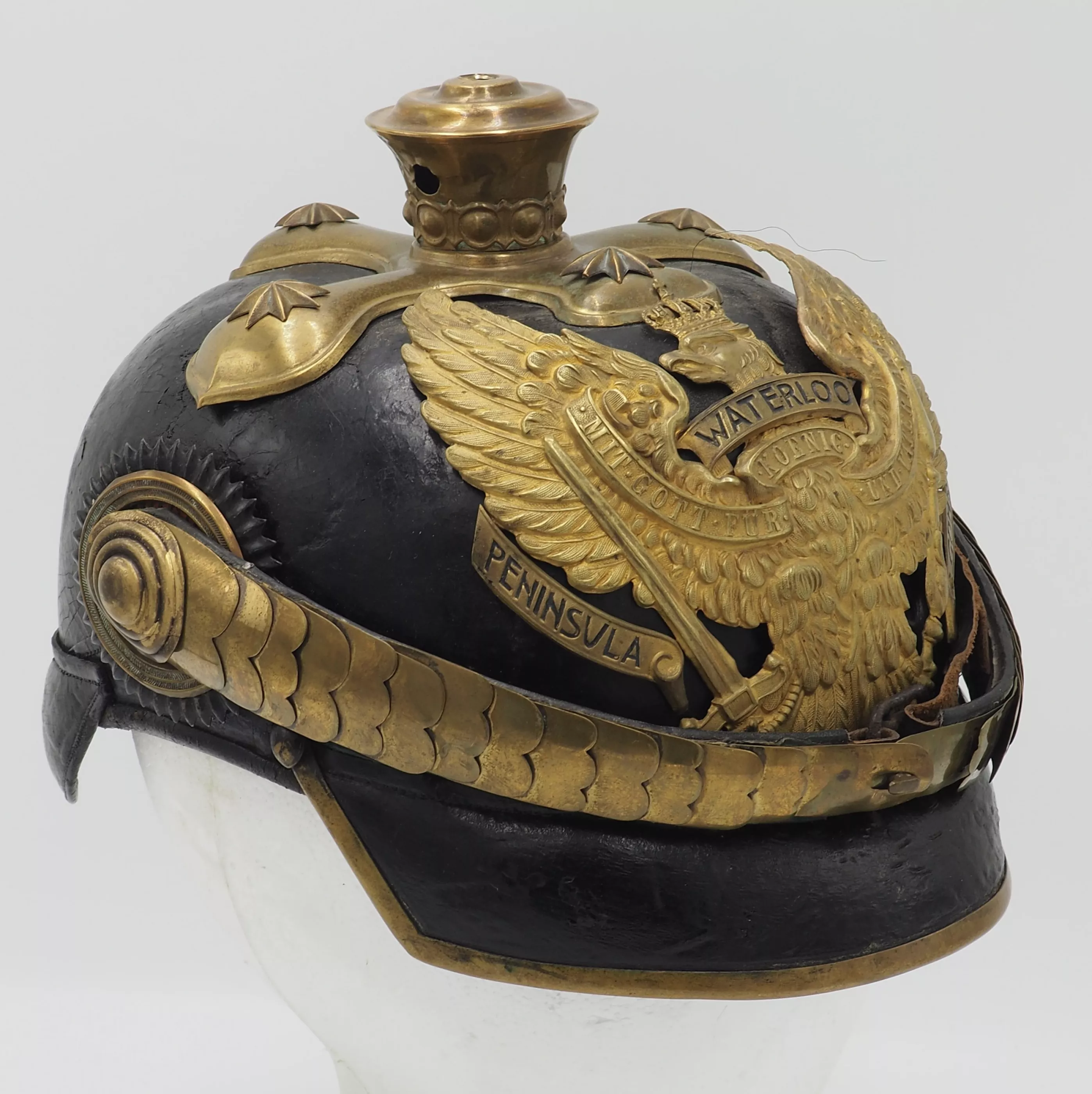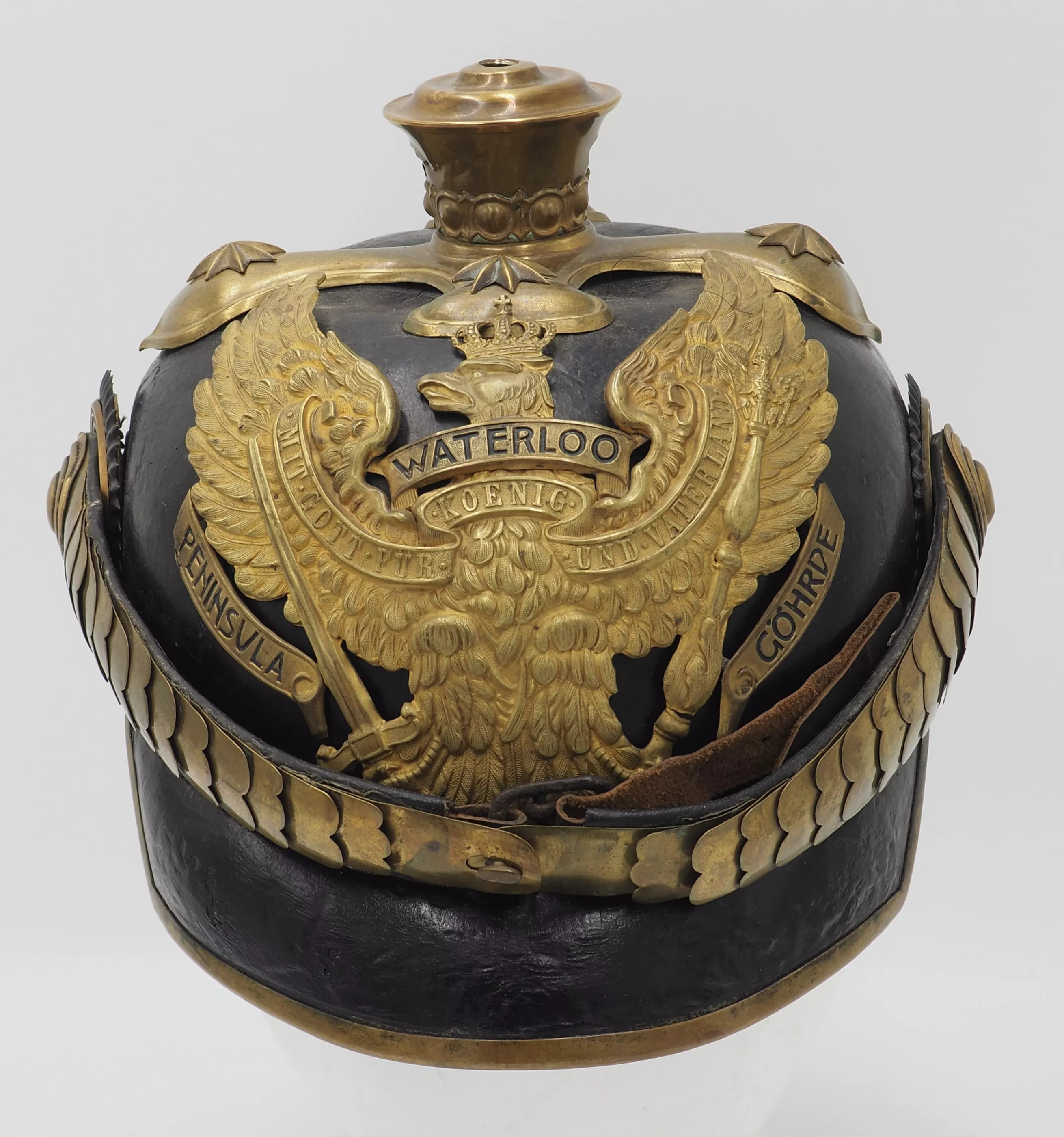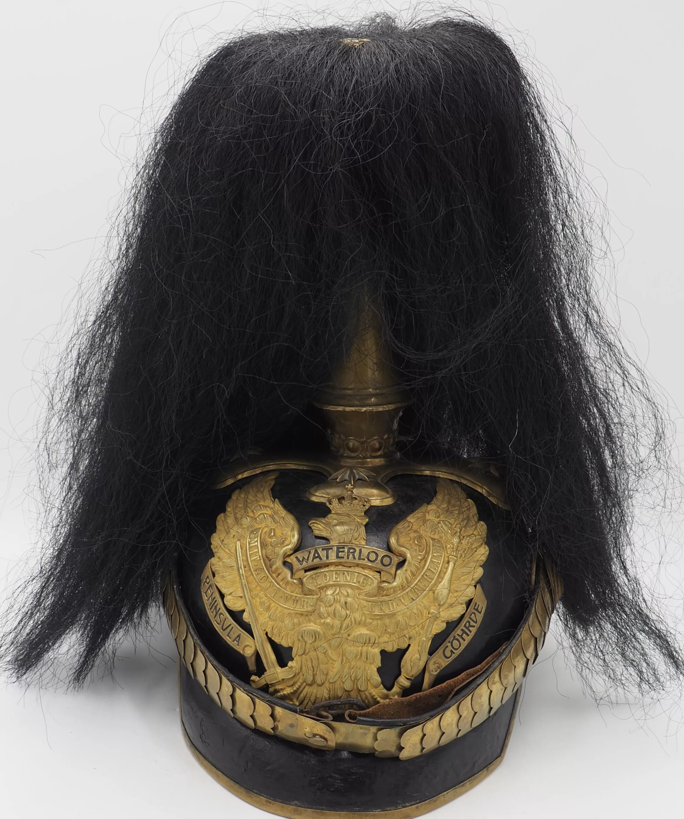 Tall smooth plume trichter on which is mounted a black Yak hair parade plume. Large gold stars retain cross base to helmet. The Frontplate is the new post-January 24, 1899 Officer Hanoverian Dragoon Eagle with the banner “Waterloo – Peninsula - Gohrde” to commemorate this Regiments service in the Kings German Legion during the Napoleonic Wars. This regiment served in Spain and during the final battle at Waterloo. Original set of convex rounded gold chinscales with a gold officer rosette. Original officers Reich and Prussian cockades.