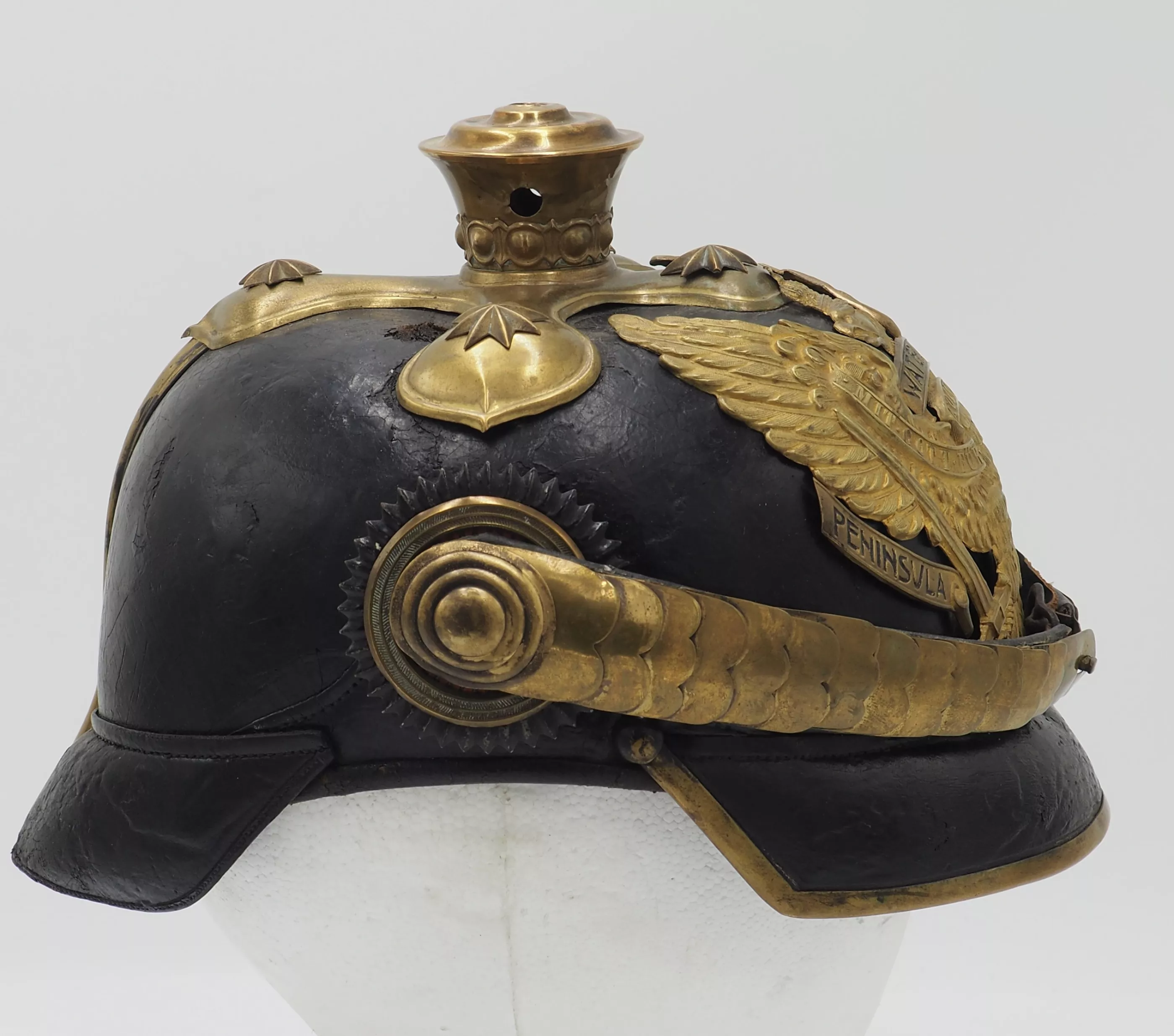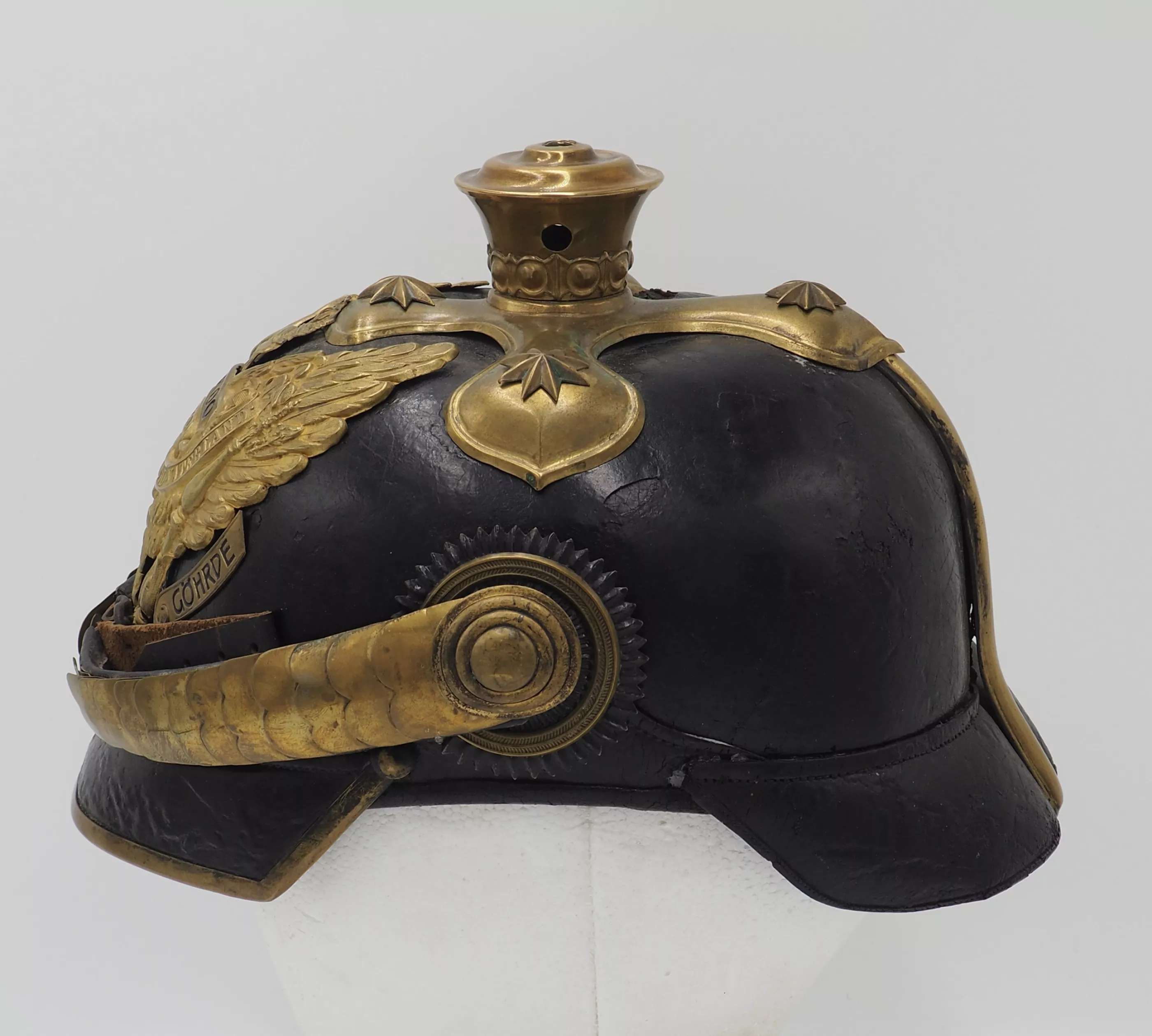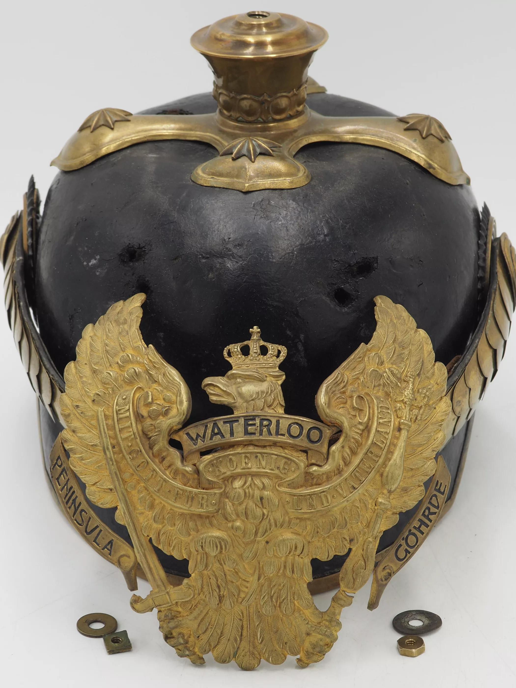 Tall smooth plume trichter on which is mounted a black Yak hair parade plume. Large gold stars retain cross base to helmet. The Frontplate is the new post-January 24, 1899 Officer Hanoverian Dragoon Eagle with the banner “Waterloo – Peninsula - Gohrde” to commemorate this Regiments service in the Kings German Legion during the Napoleonic Wars. This regiment served in Spain and during the final battle at Waterloo. Original set of convex rounded gold chinscales with a gold officer rosette. Original officers Reich and Prussian cockades.