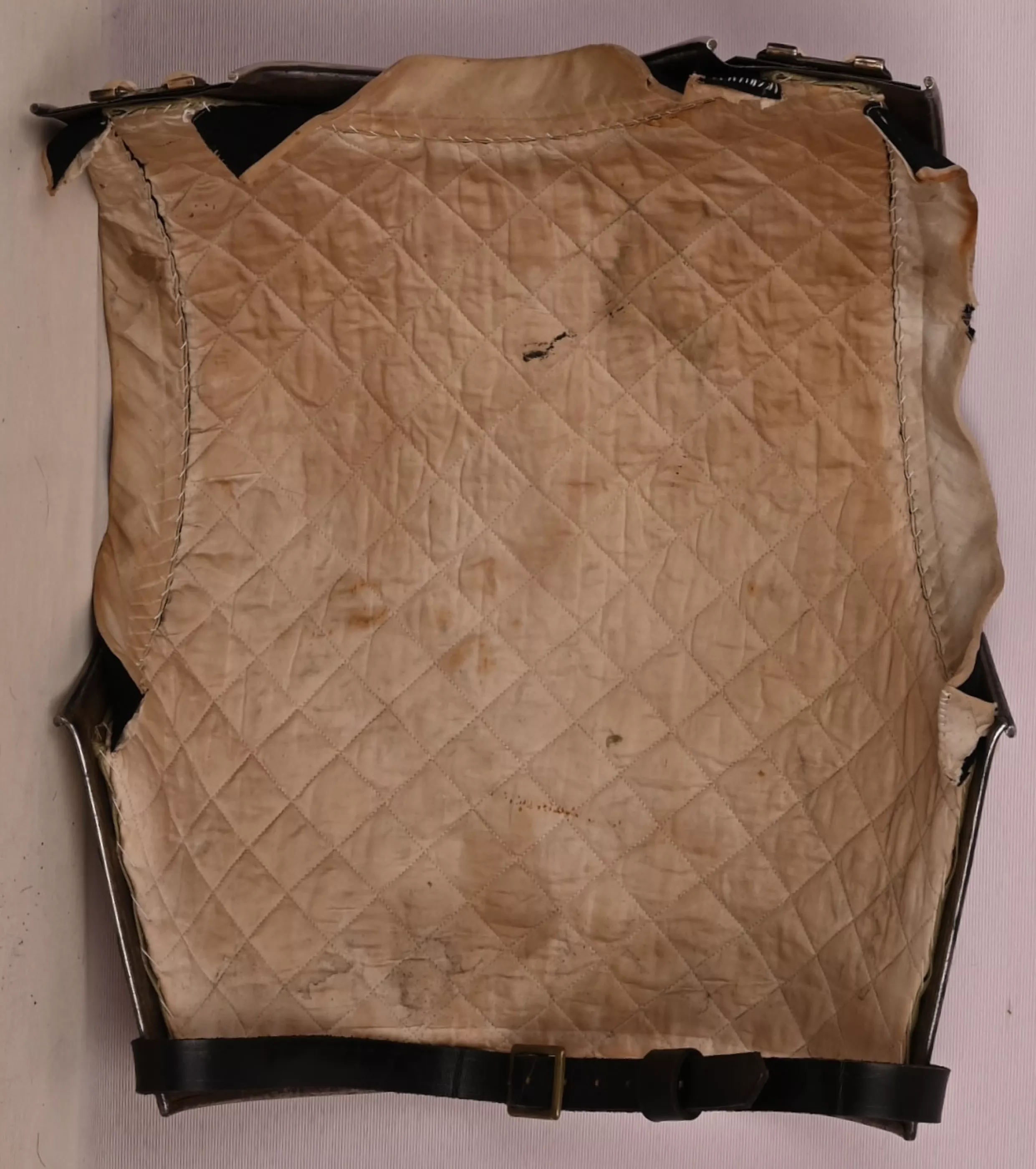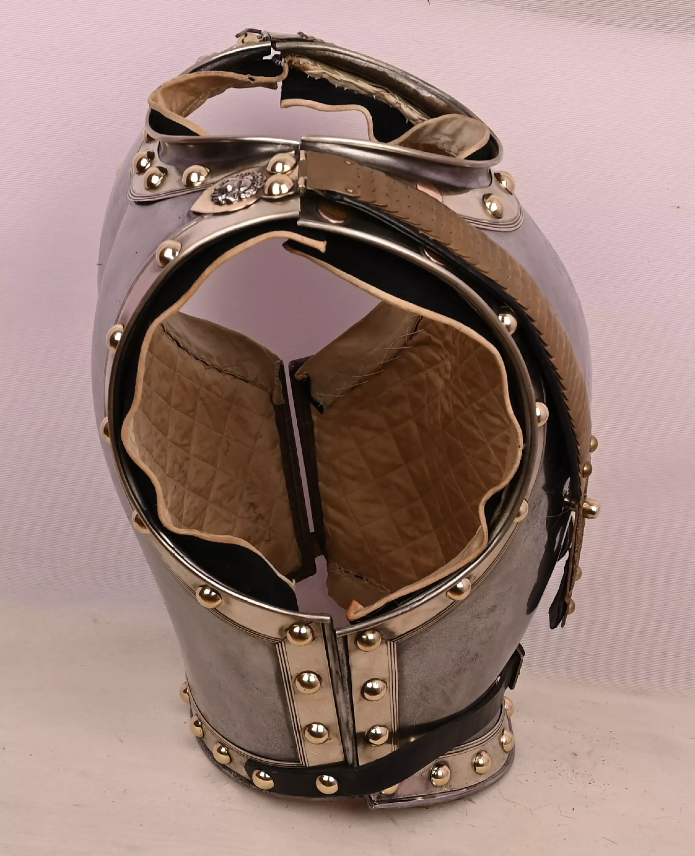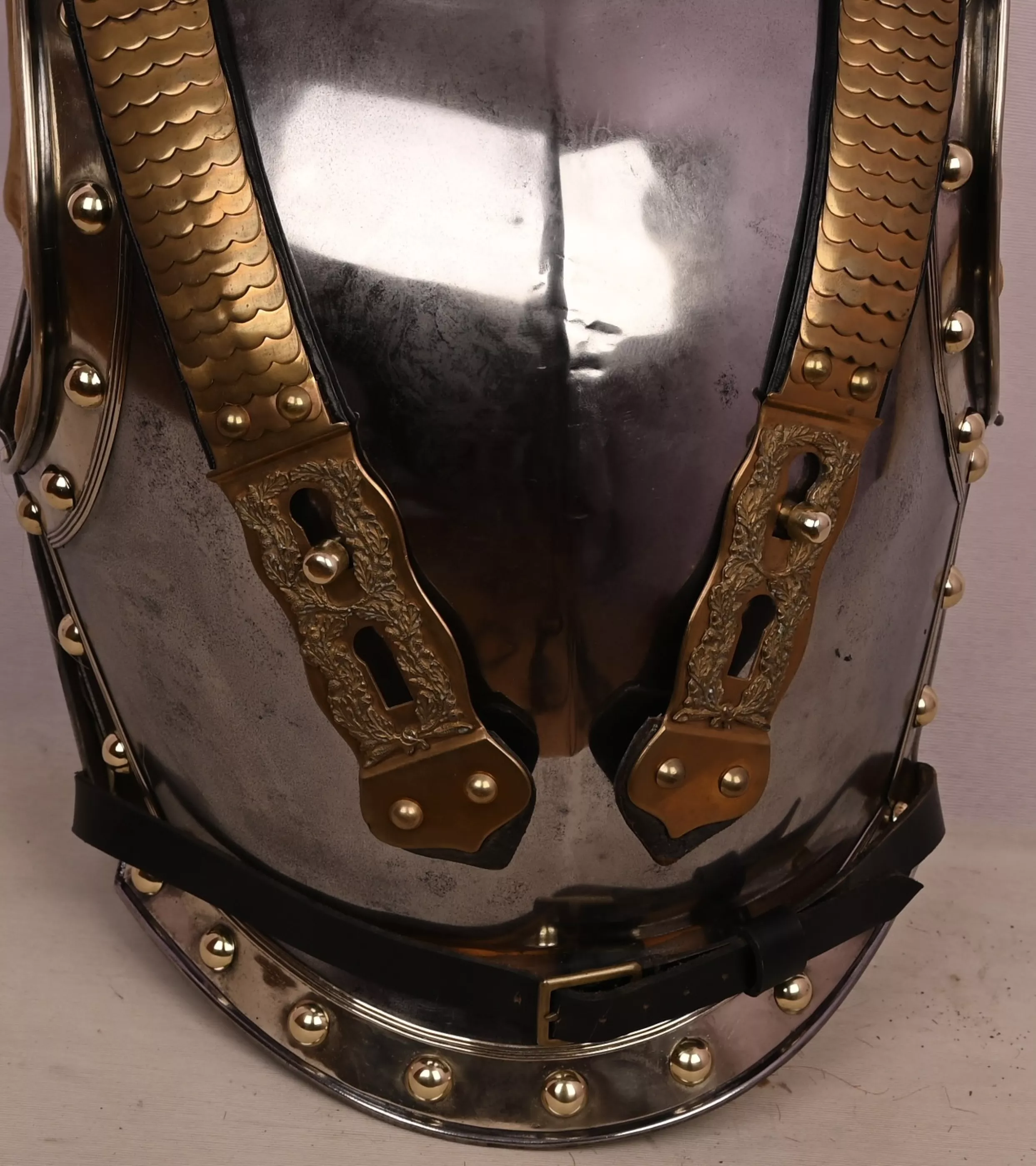 Elegant Prussian Officer's Kurass for Line Regiments. Ultra light construction that was used for Parade Dress purposes. Highly polished steel front and back plate. Both plates have their original waffled tissue lining. The front plate is made of light steel polished to high finish. Please note a few small dents visible tin the middle only. The remaining of the plate is without dents or damage. Both plates have been professionally polished to their original shine. The Gilded brass scaled straps have kept their initial patina. The leather of the belt and straps has also been professionally restored. A fantastic and beautiful ensemble that is rarely seen in the marketplace today