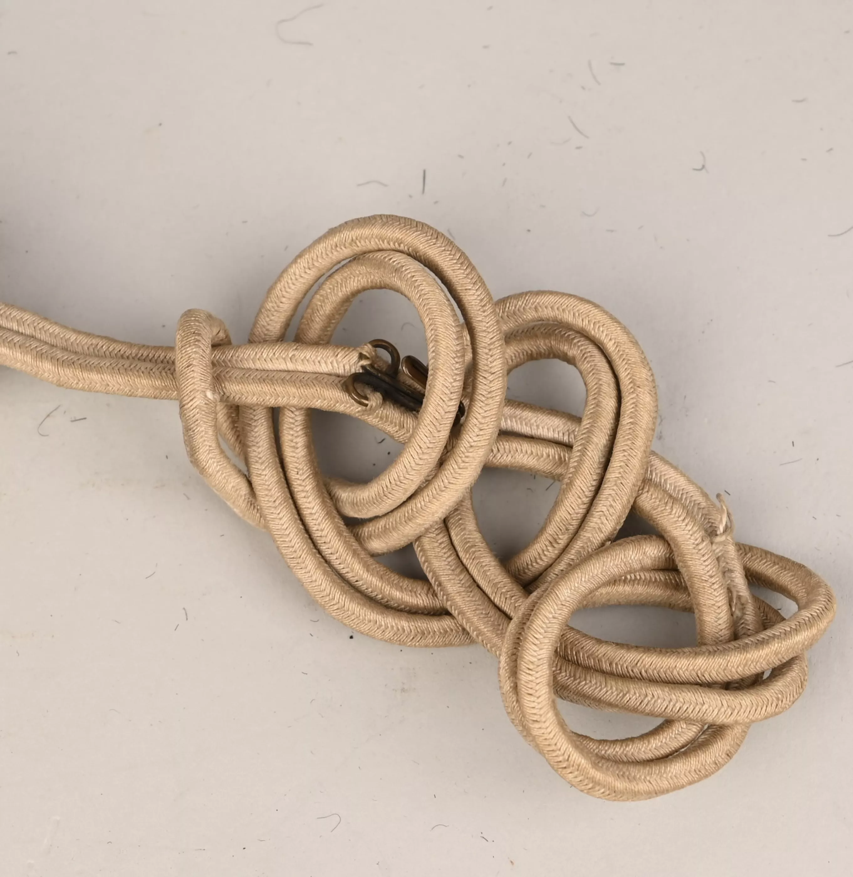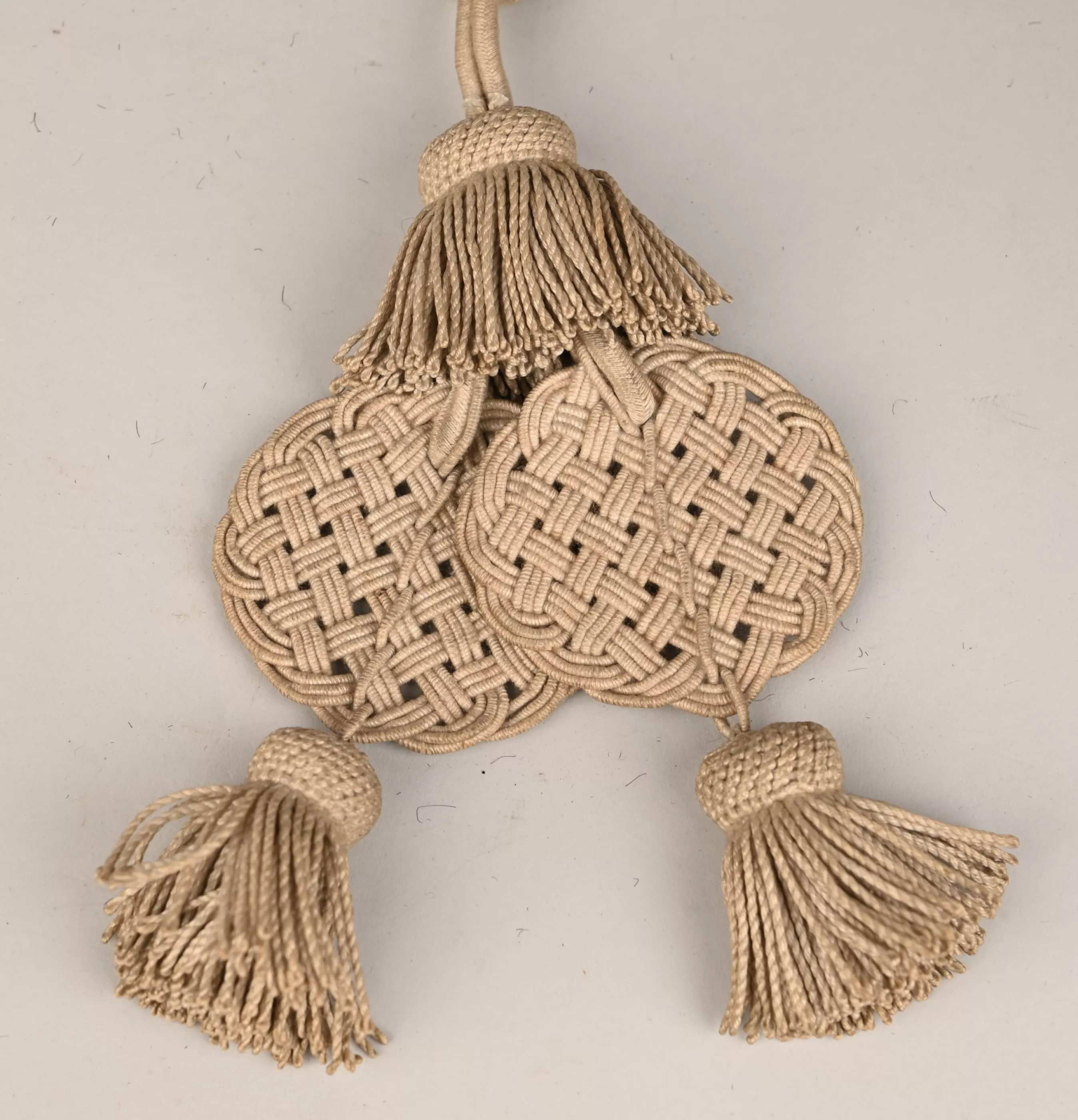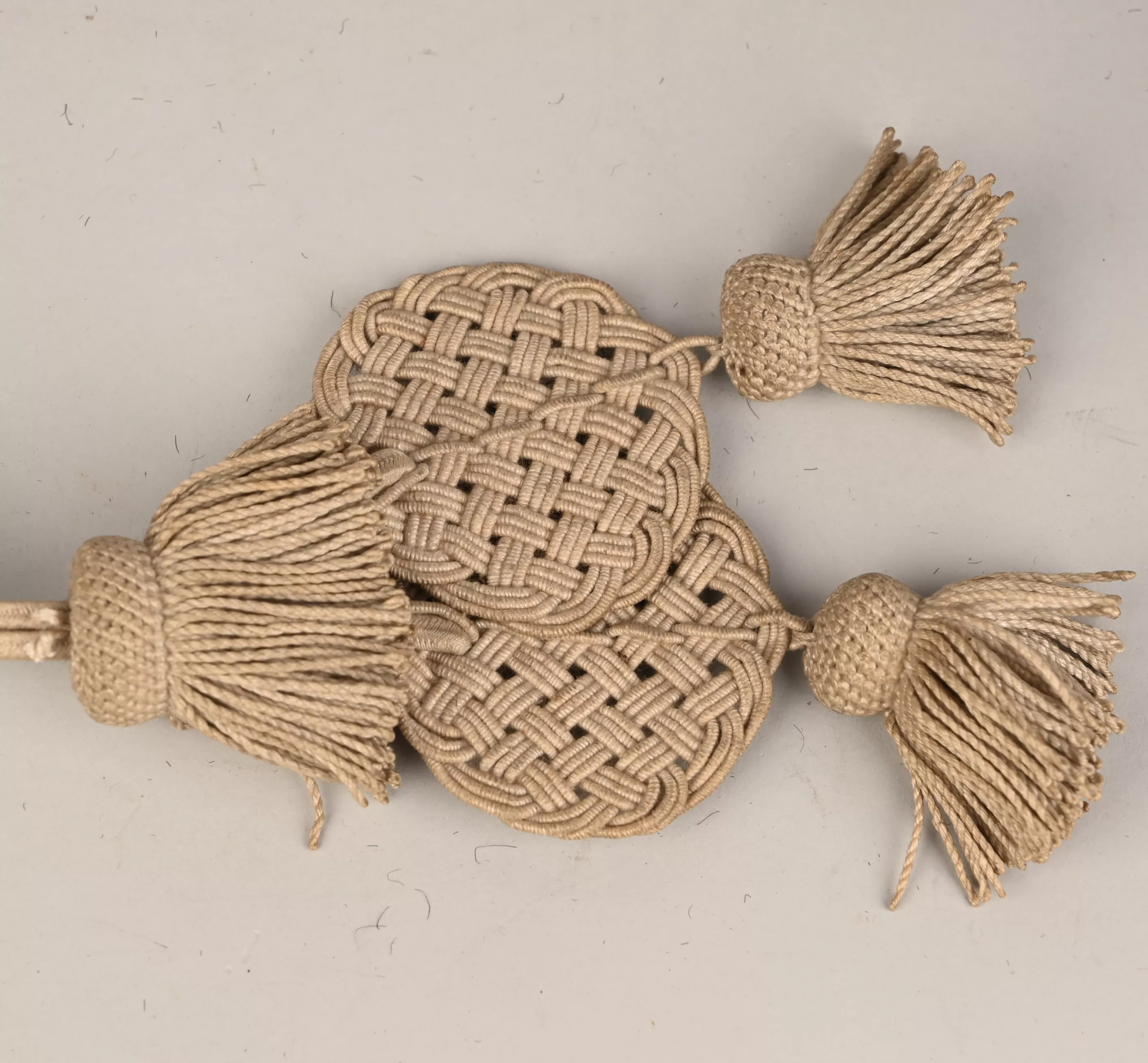 Prussian Leib Garde Hussar Enlisted Tassels for Parade. Unique to this regiments. White cotton braid with three small tassels and two braided discs. Small hook present. Attached to the Fangshnur for parade dress.