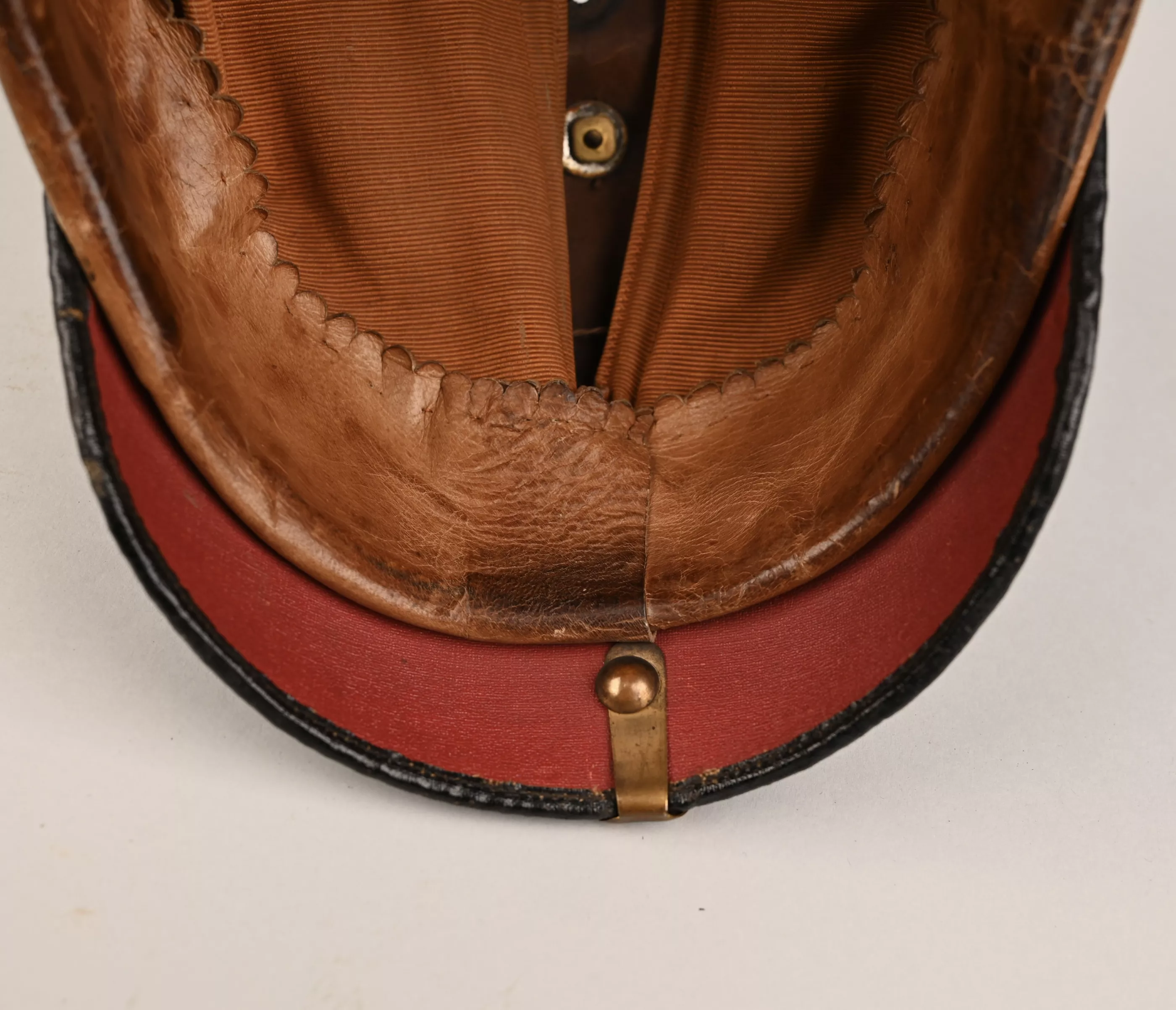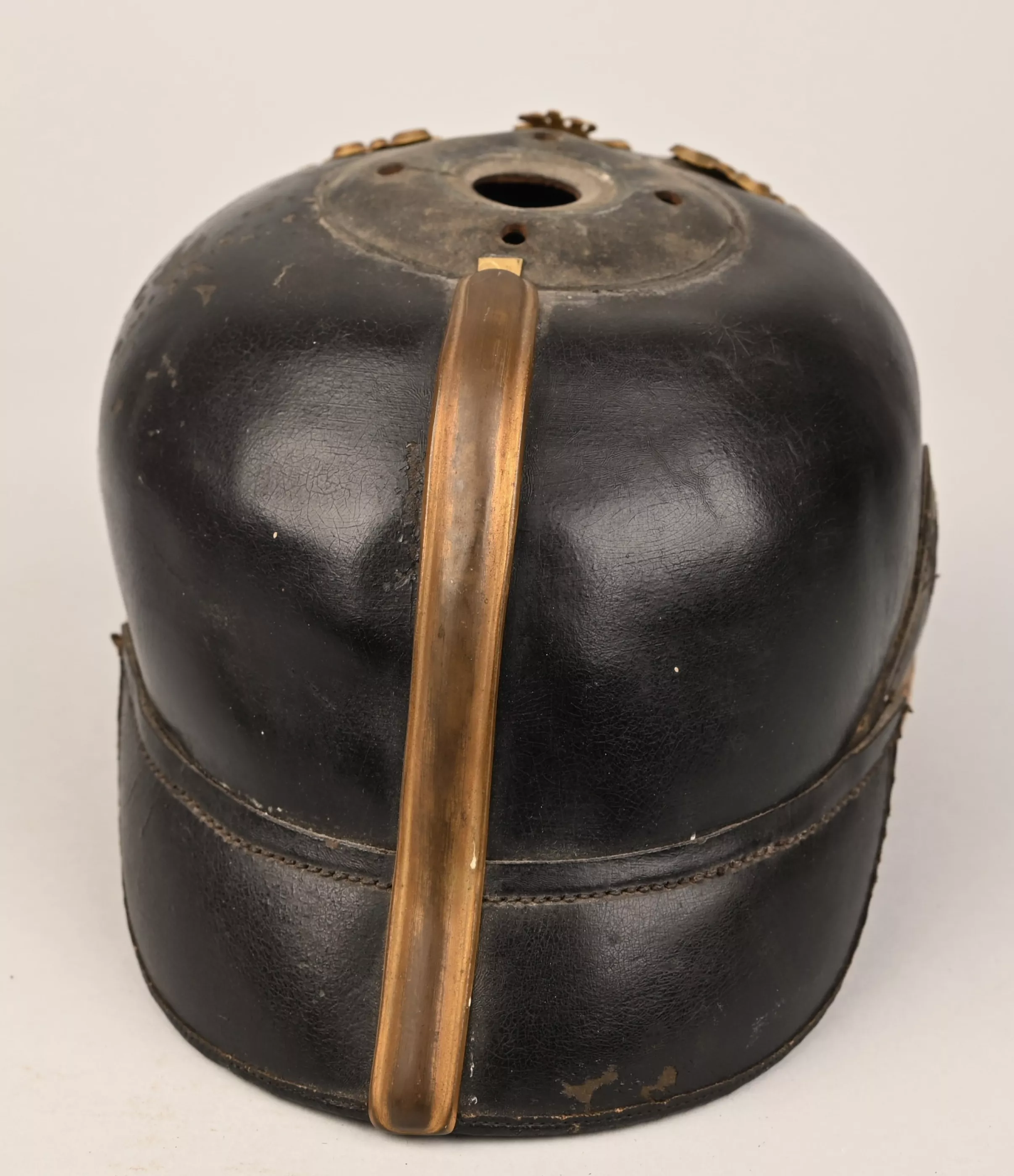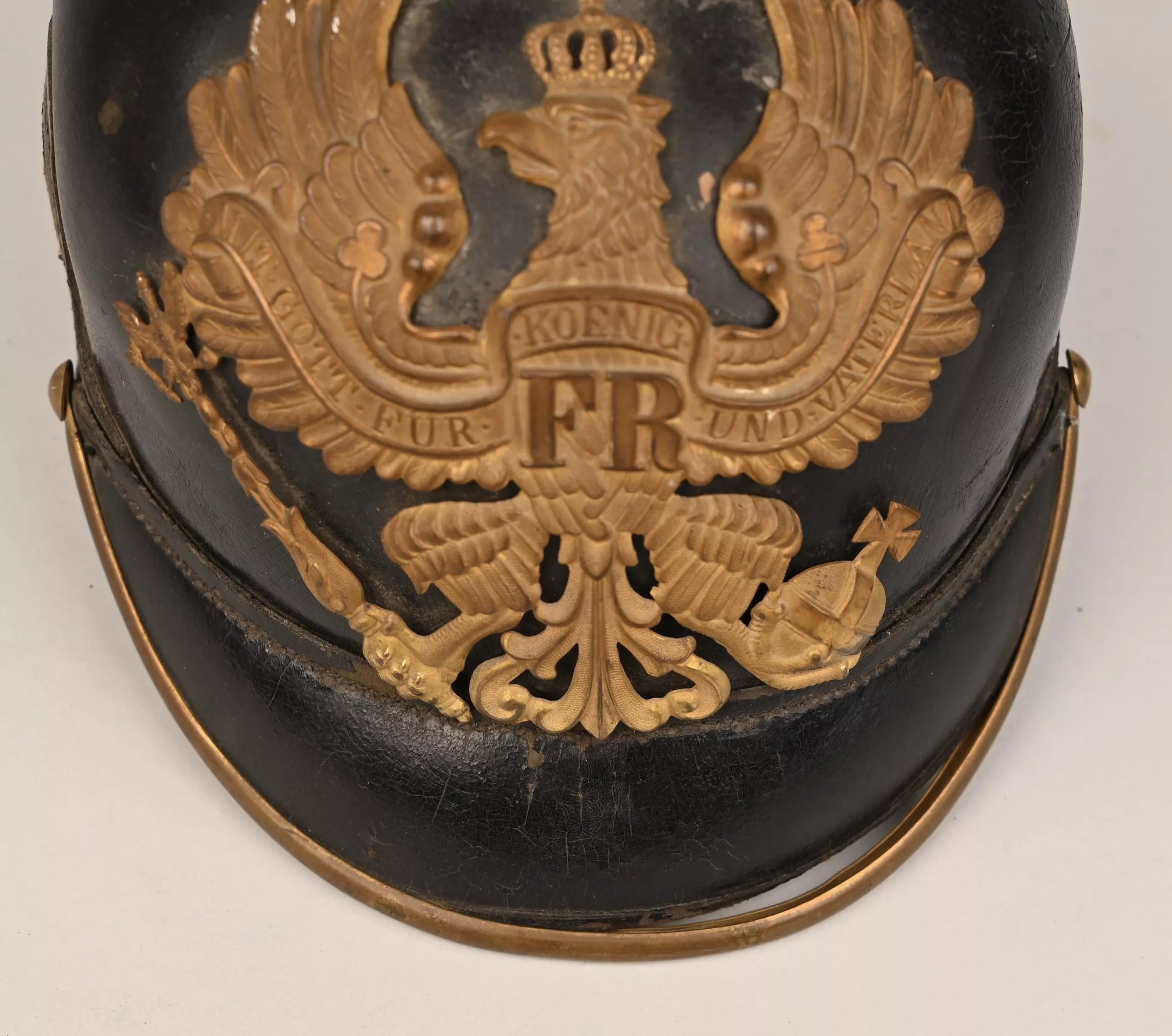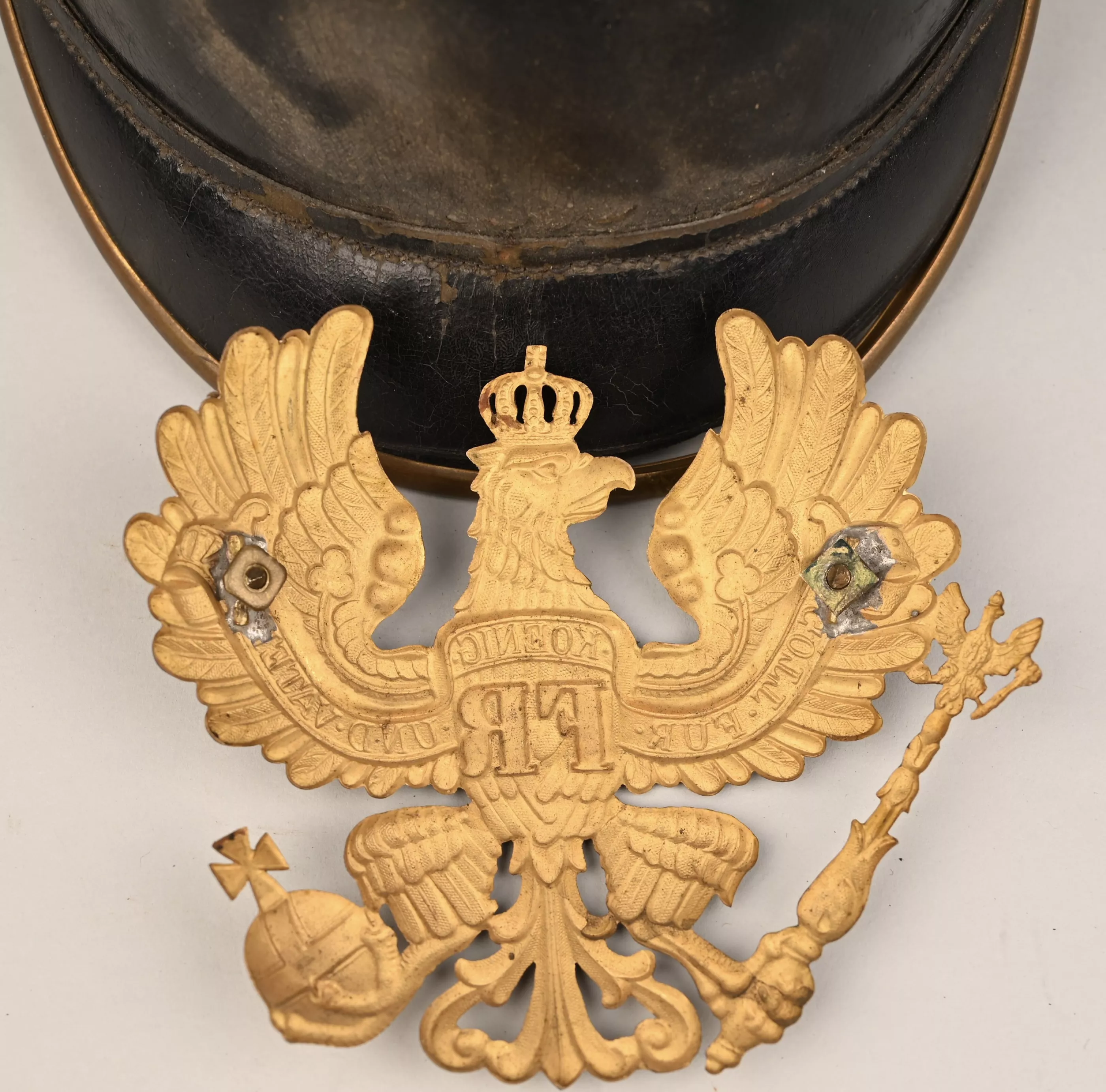 Black laquered leather helmet body in excellent condition with only minor flaws to finish. Both visor of offciers quality and firmly stitched to helmet body. Note that the front visor trim is slightly loose from the leather part and needs to be re-fitted (see pictures). Fire gilt trim with Prussian Officer's Line Eagle attached with two screw/nuts - no extra holes and plate is a prefect fit. Back spine complete and loose from stress on the uper part (see picture). Very nice officers liner with both origional sweatband and silk attached. Missing Spike, attachements, scales and Cockades. A nice helmet that merits to be completed.