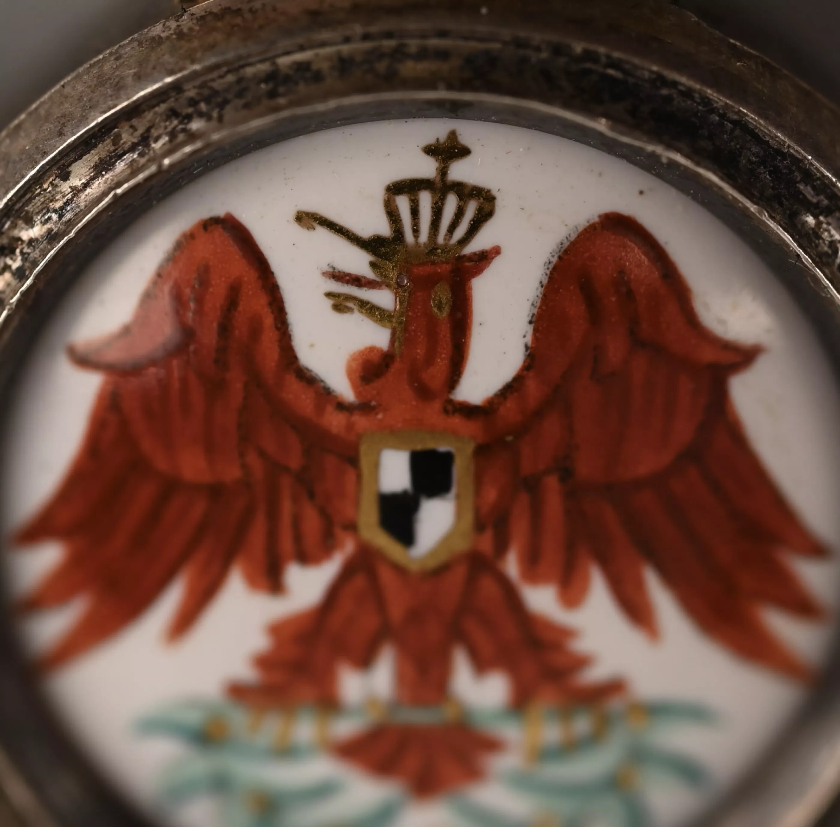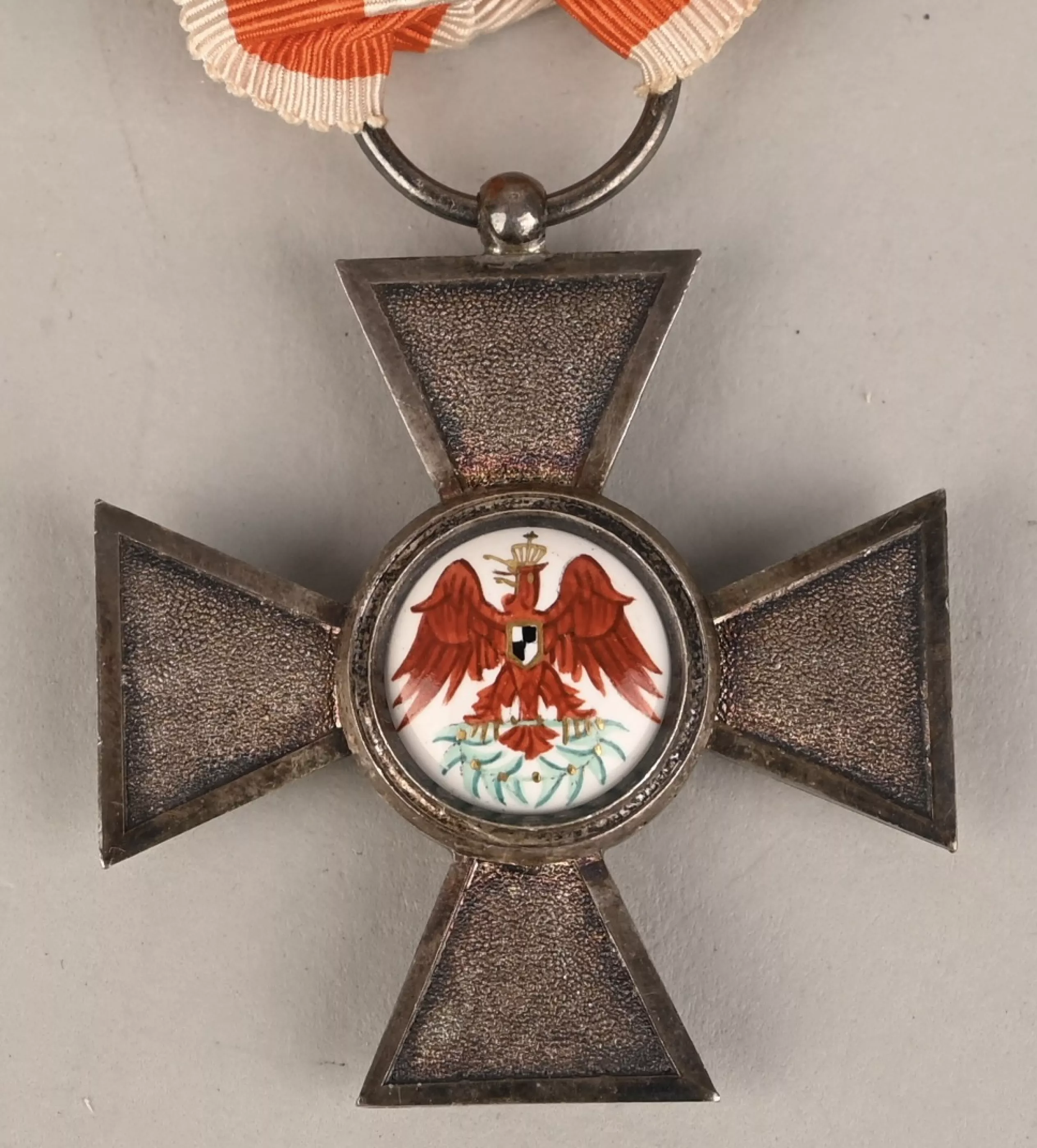 Order of the Red Eagle, 4th Class "Roter Adlerorden". Last model before 1918. Cast and enamelled in one piece. Zinc-gilt cross. The obverse shows a central enamelled disc with beautiful and detailed hand painted enamel work of a crowned red eagle. The reverse shows a Prussian Crown and 'FW' cypher. Unmarked with remanant of original ribbon.