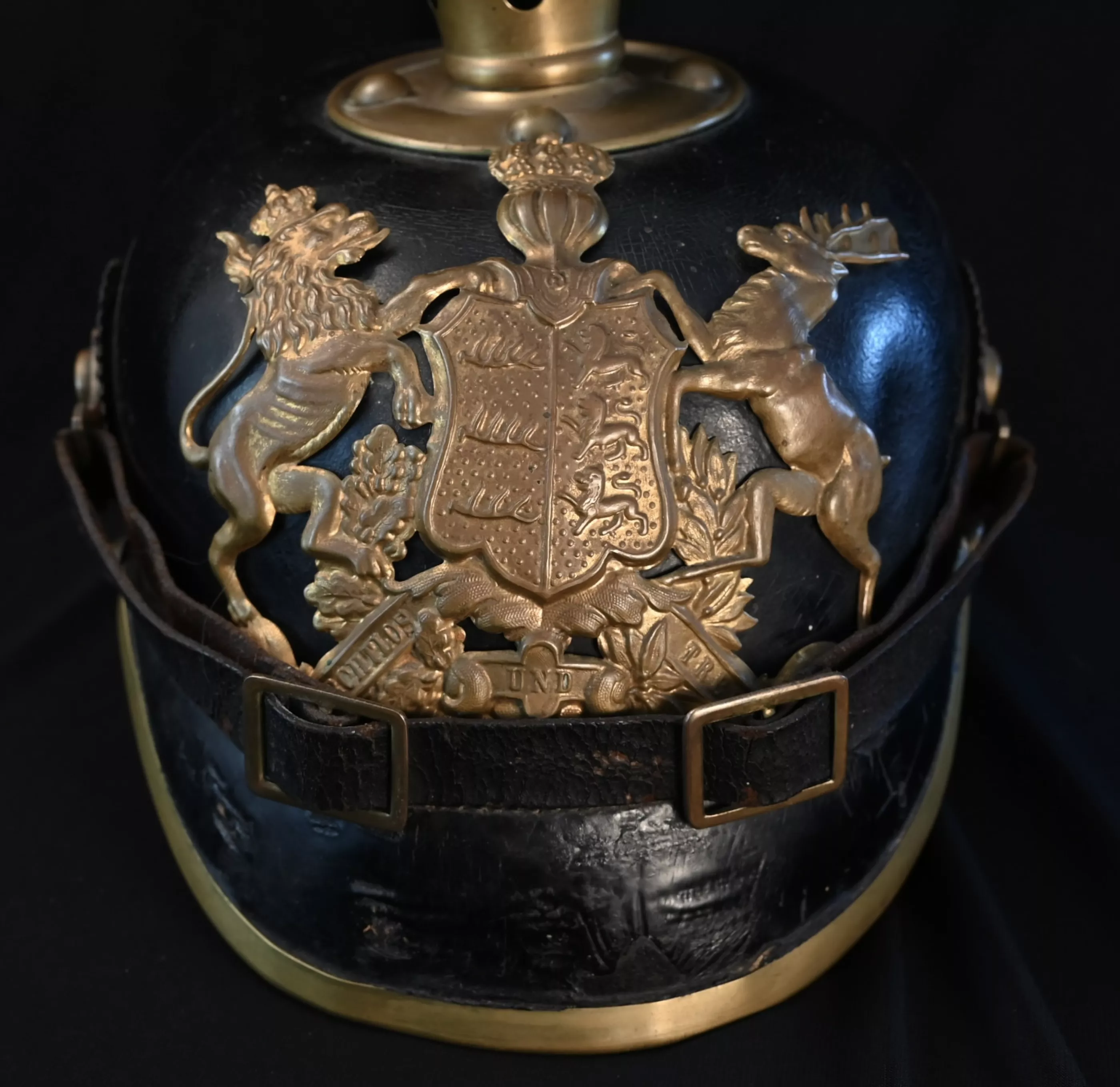 Wurttemberg Infantry Enlisted Man for Line Regiments Model 1891. Beautiful black lacquered helmet body with gold/brass trim. Helmet body has perfect form and firm stitching to back visor. Exterior lacquer has very good finish. The frontplate is the Wurttemberg crest with the "Furschtlos und Trew" bandeau, held by two posts with leather wedges. No extra holes. The Wurttemberg crest fits the helmet shell like a glove.