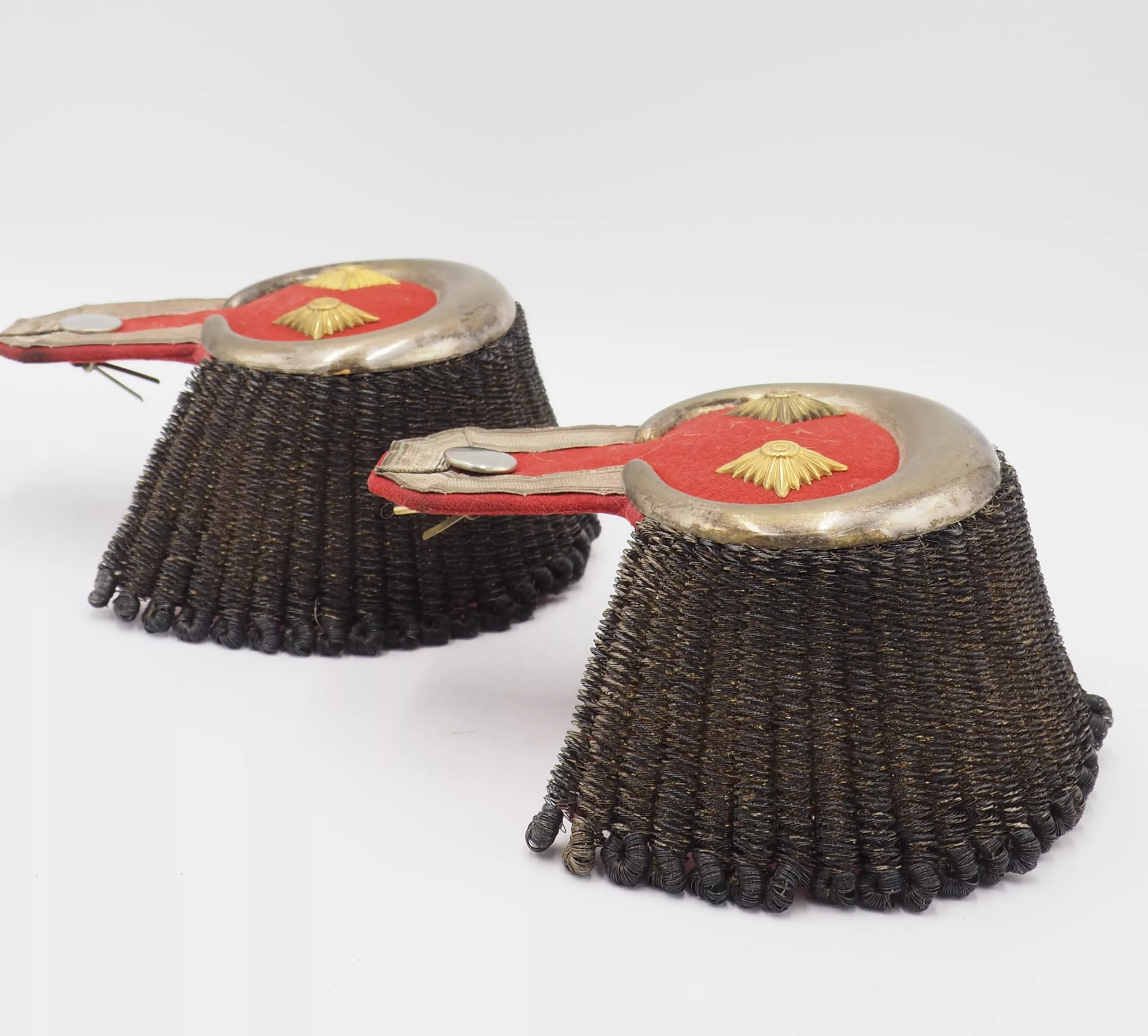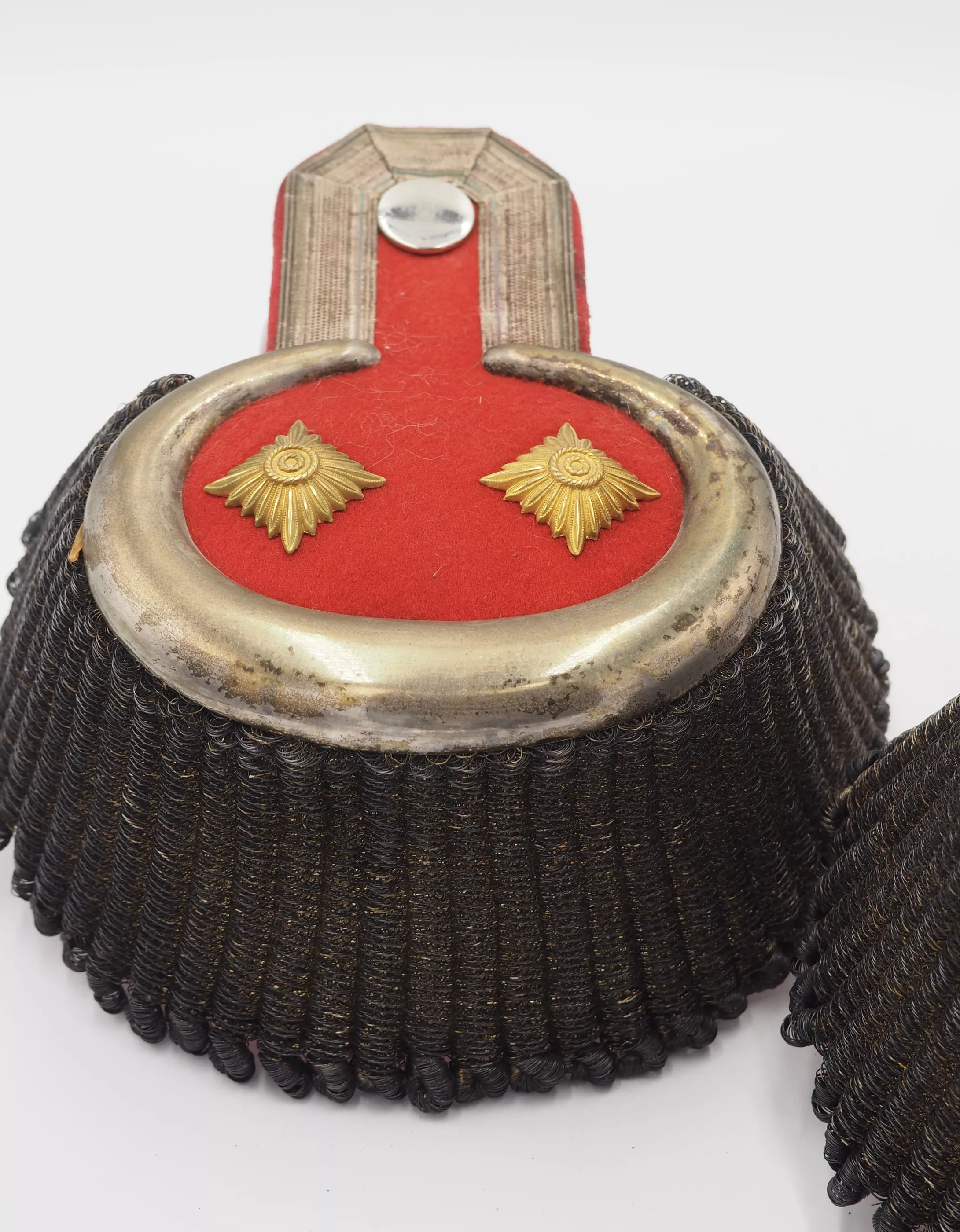 Bavaria Circa 1890's. Large full dress epaulettes with silver 3/4 moon shaped surroundings. Beautiful silver bullion tresse with some oxidation to silver. Top facing is made of red cloth. This set was worn by a General as "Inhaber of the 1st Schwere Reiter regiment" Bavarian Colours to the epaulets "piping". Red cloth backing. Overall condition excellent. Very Rare set.
