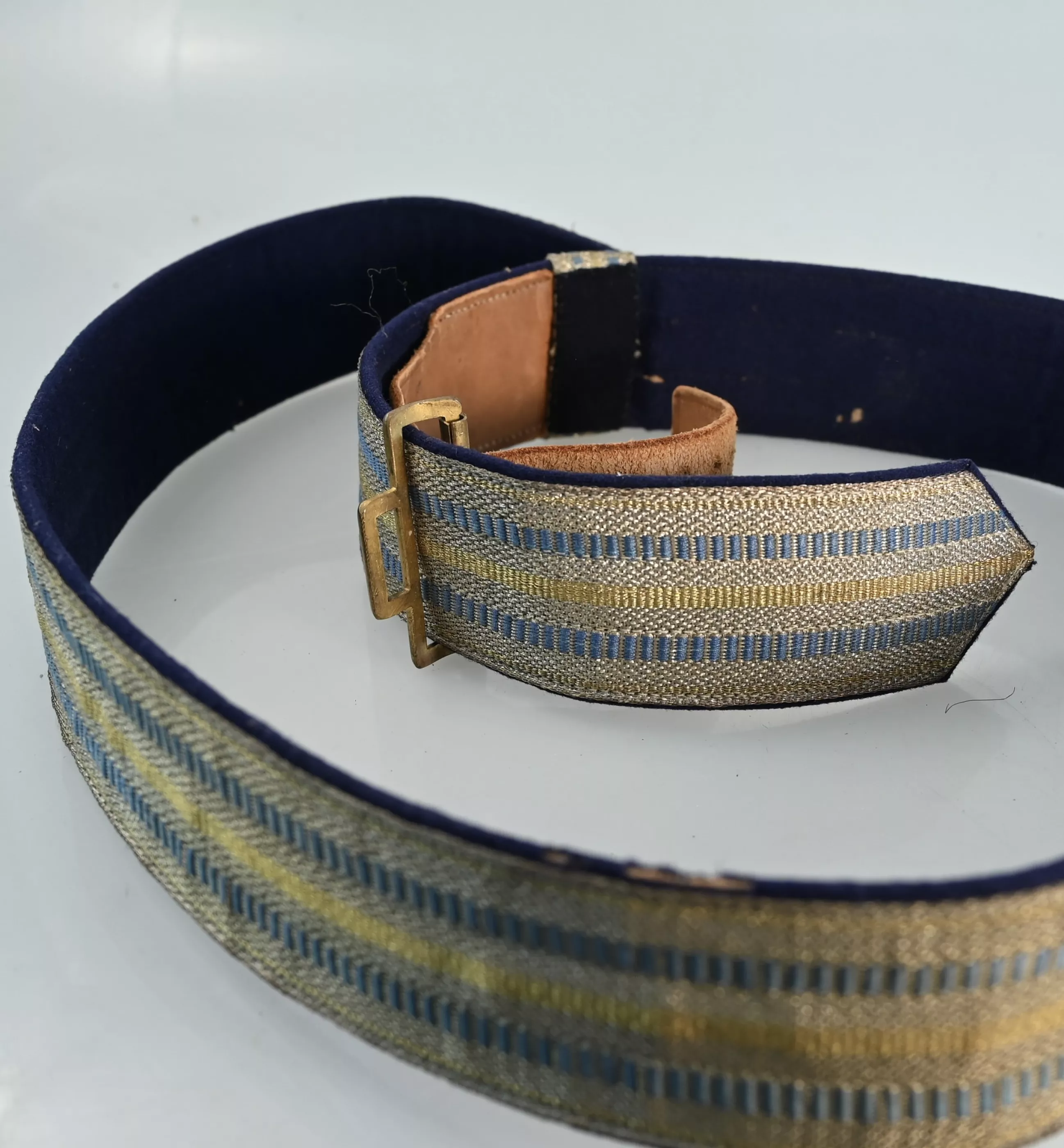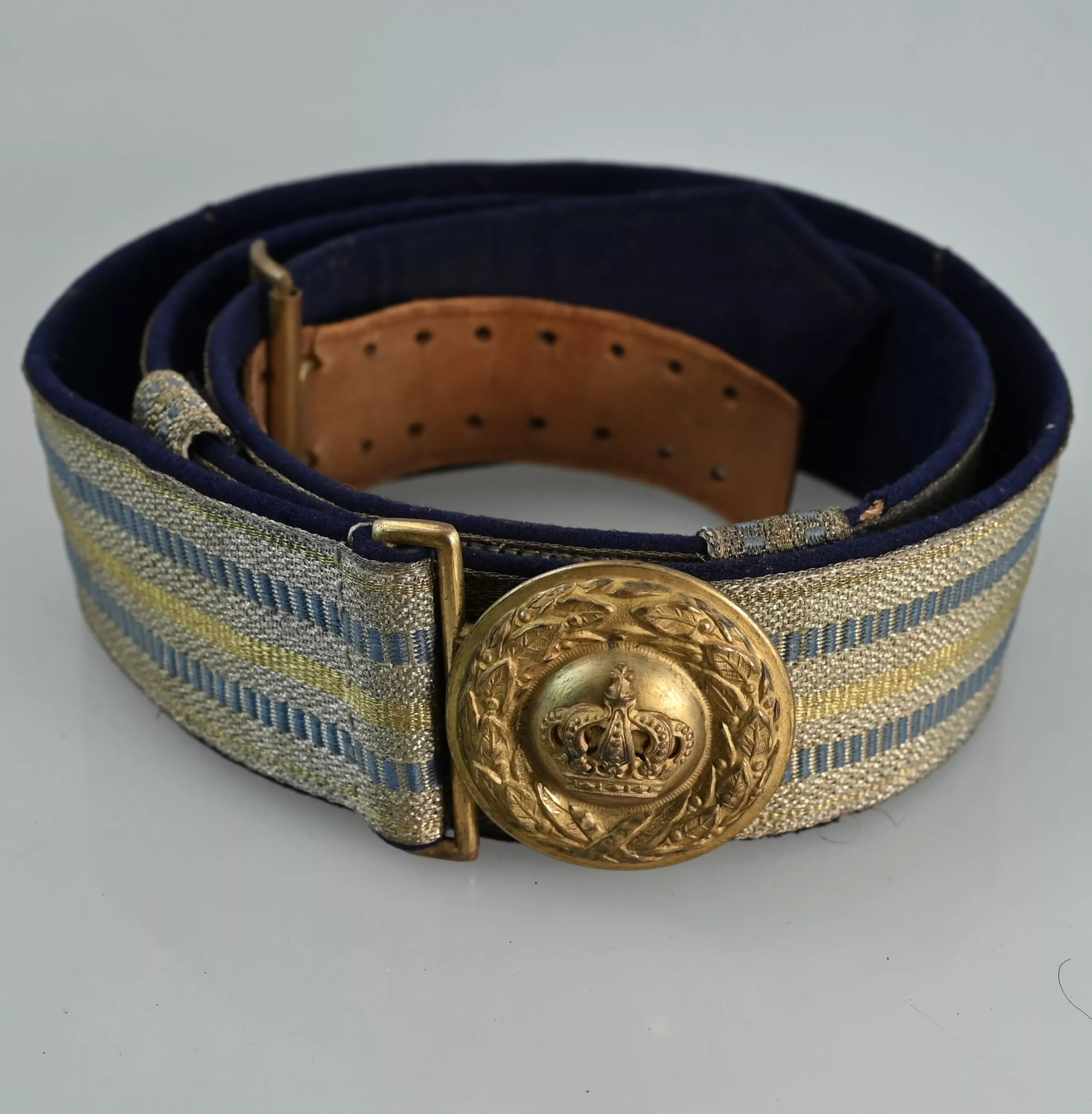 Beautiful Officers Officers full dress Belt. Complete with Silver Bullion front (Blue and yellow bands). The back is lined with blue velvet. The Buckle in fire gilt with the Bavarian Crown in the center. Both "Passanten" and hooks are present. Near mint to mint condition. 100% Original and rare to find in pristine condition.